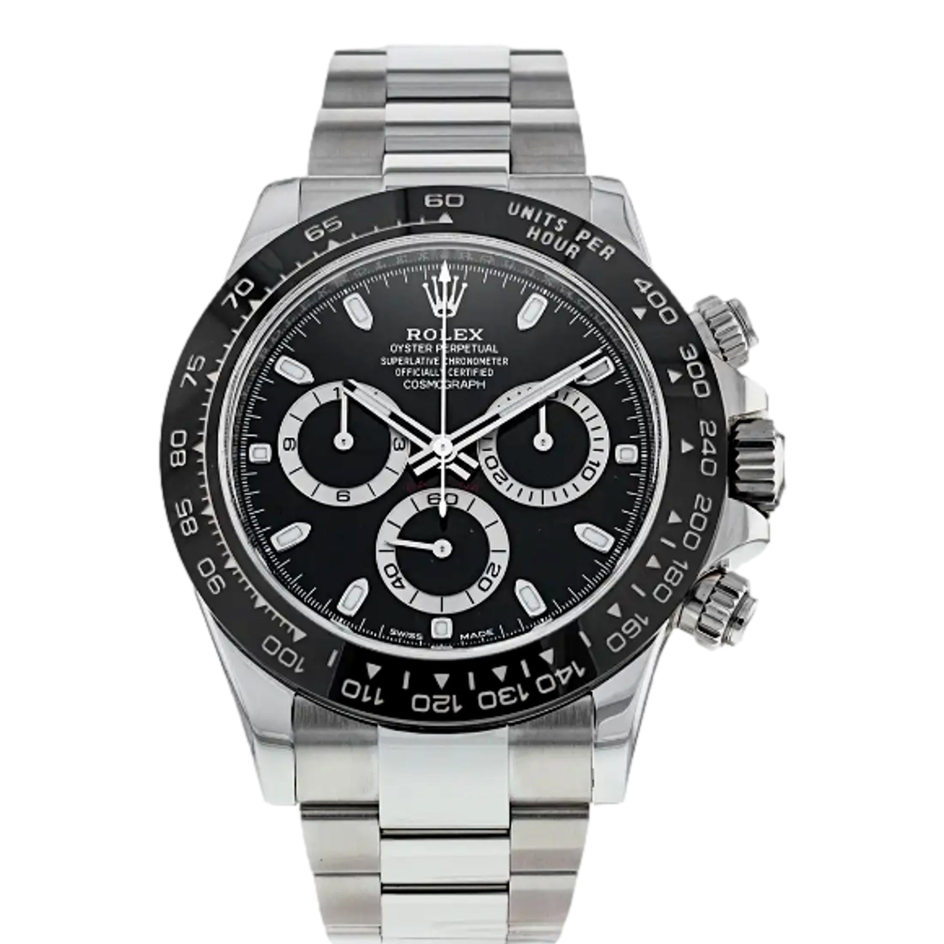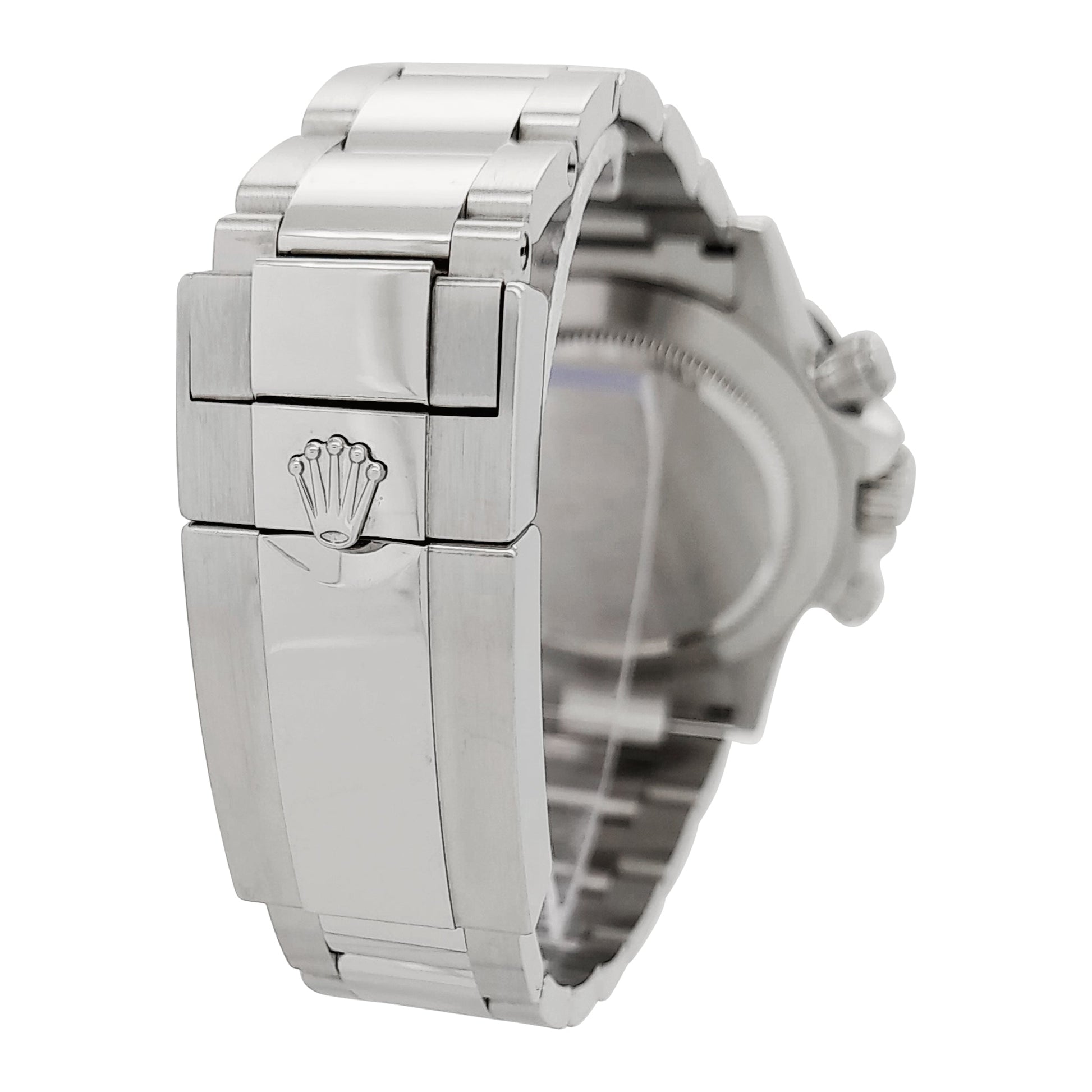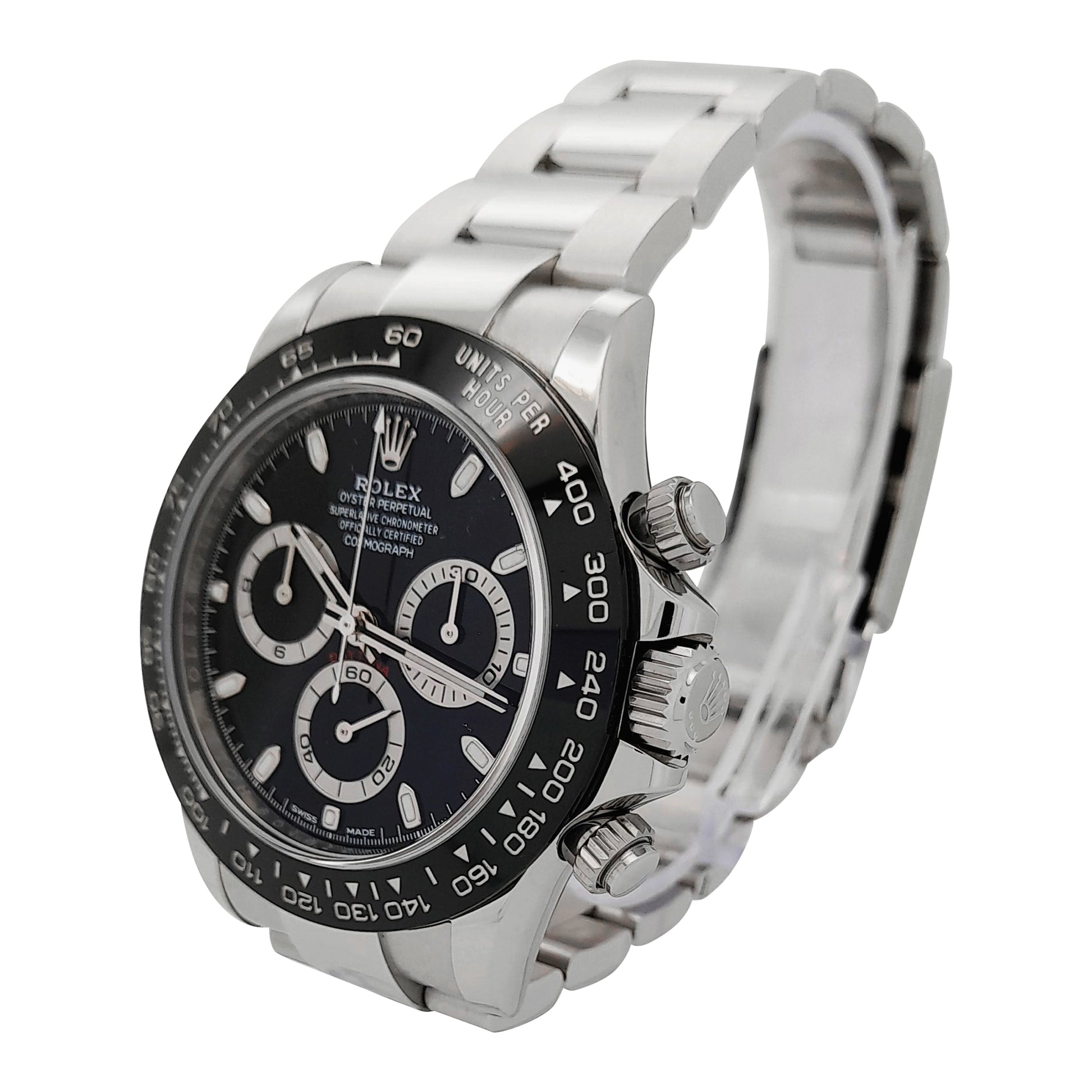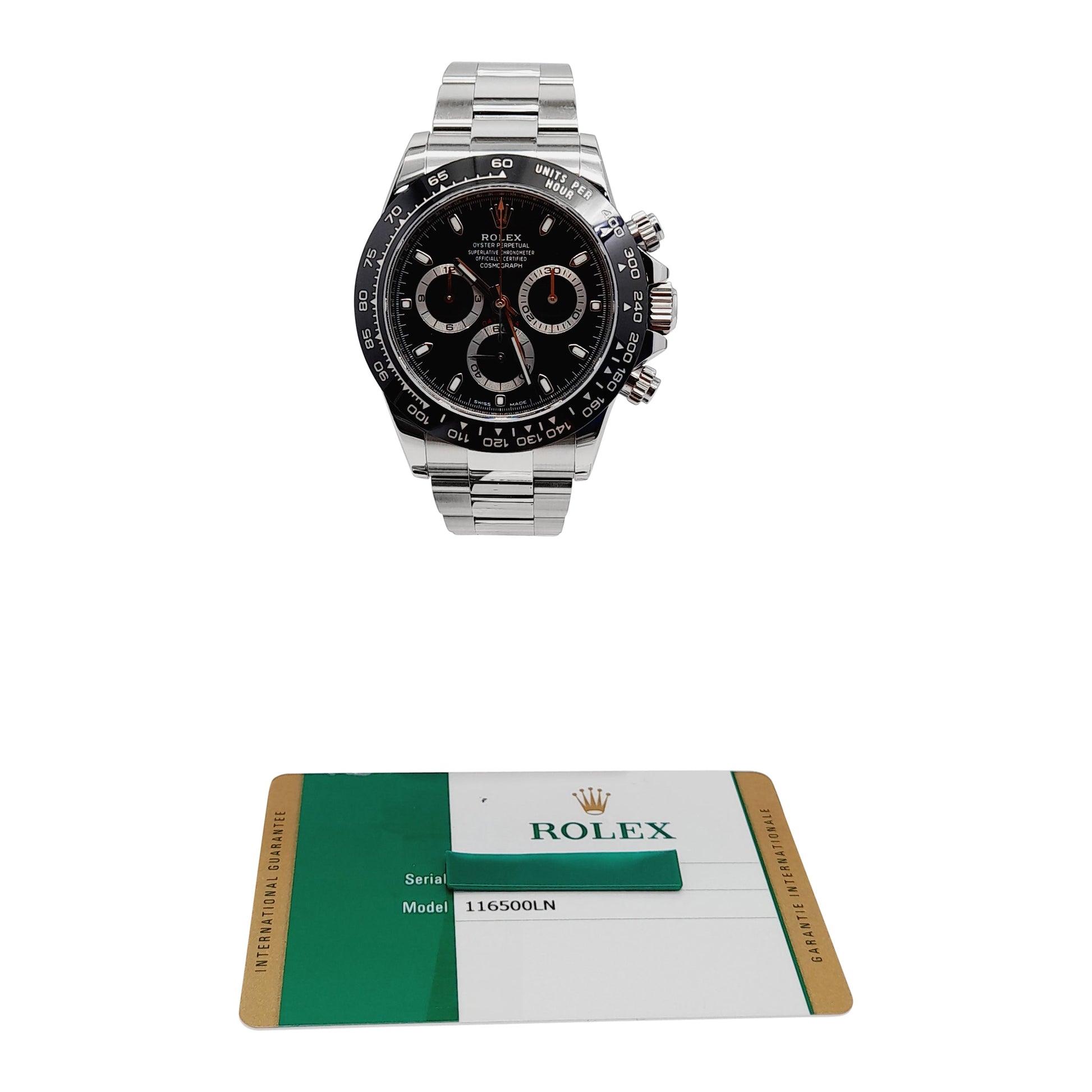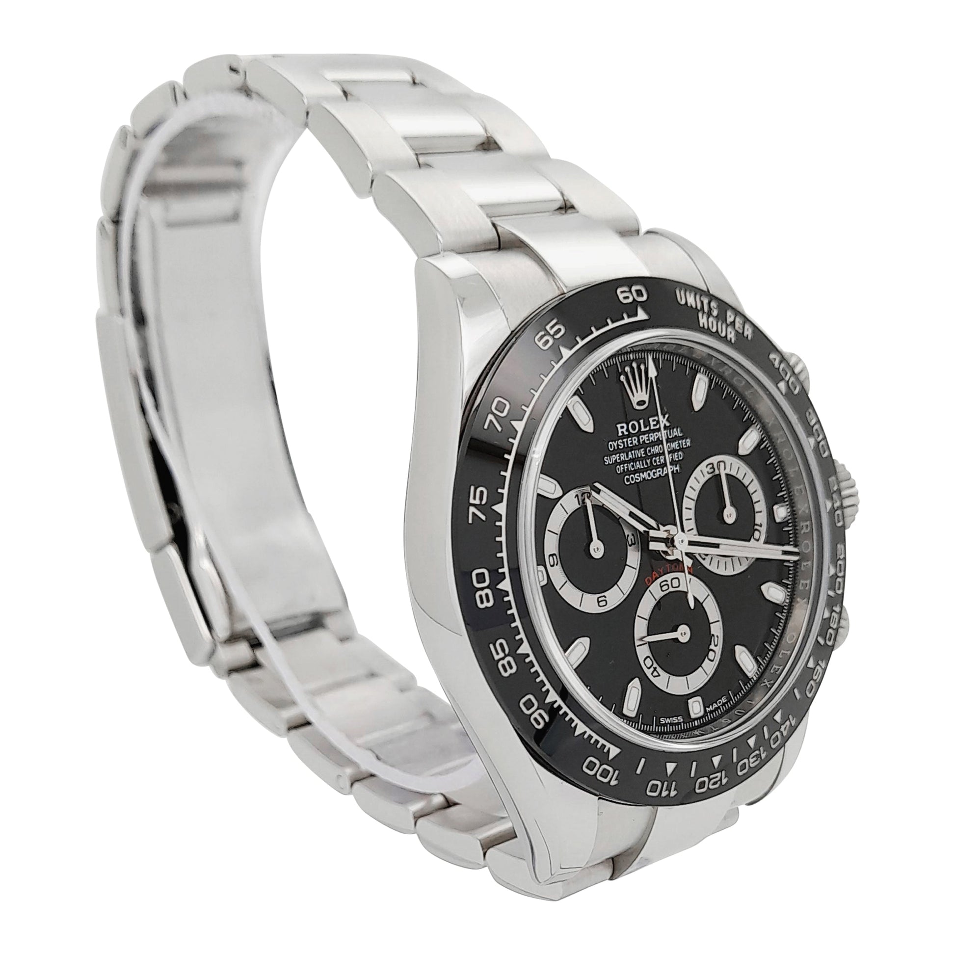 This Daytona Cosmograph has a stainless steel case with a stainless steel Rolex Oyster bracelet. Black bezel in ceramic with engraved tachymetric scale. Screw down crown. Black dial with silver-tone hands and index hour markers. Scratch resistant sapphire crystal. Chronograph display three silver and black sub-dials. Rolex Calibre 4130 automatic movement with approximately 72 hours of power reserve.