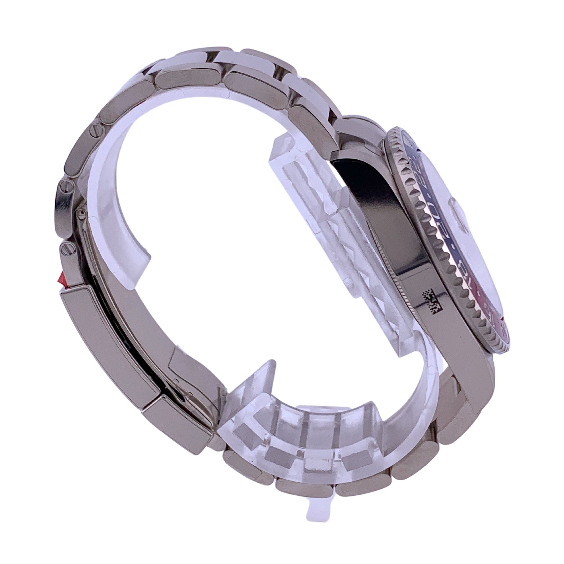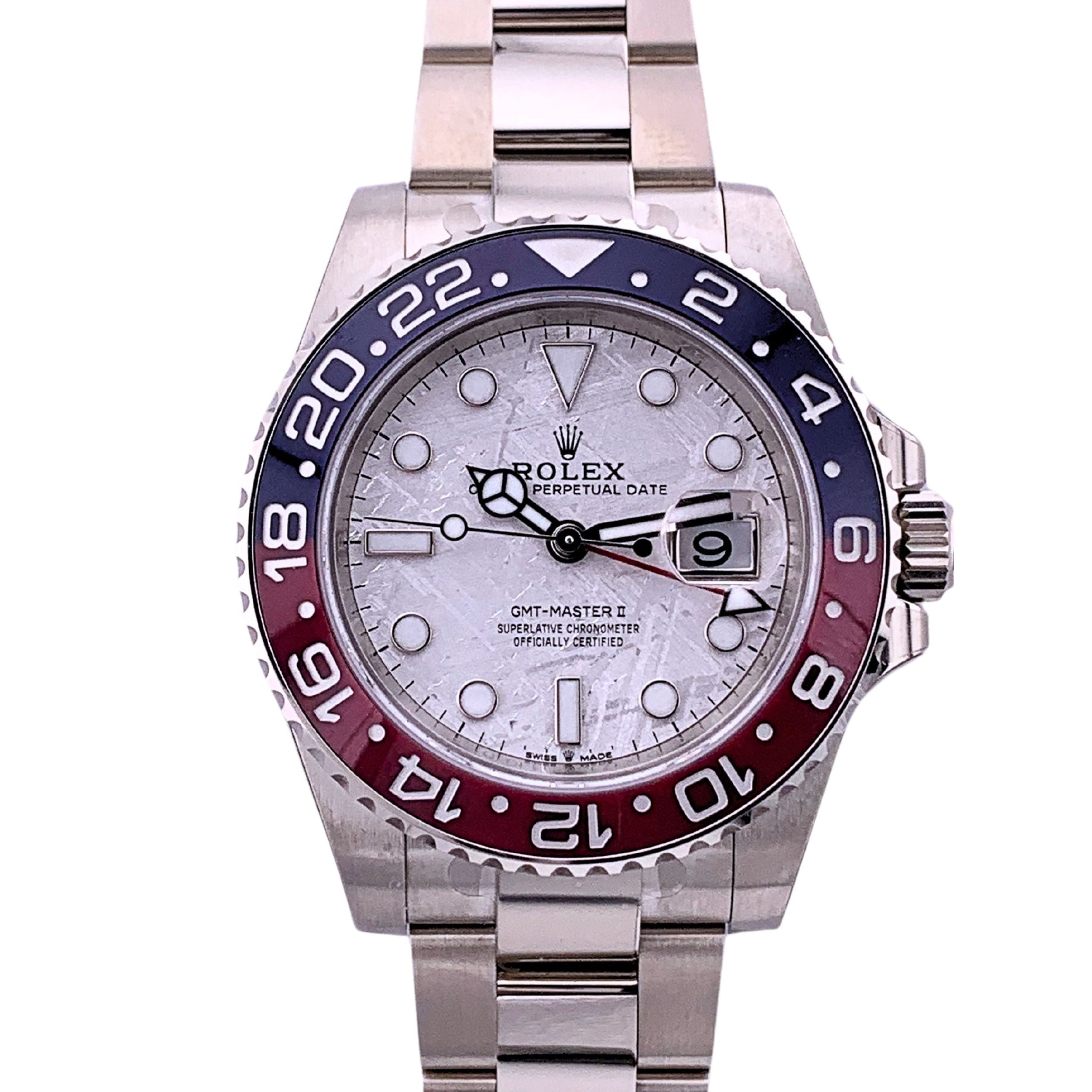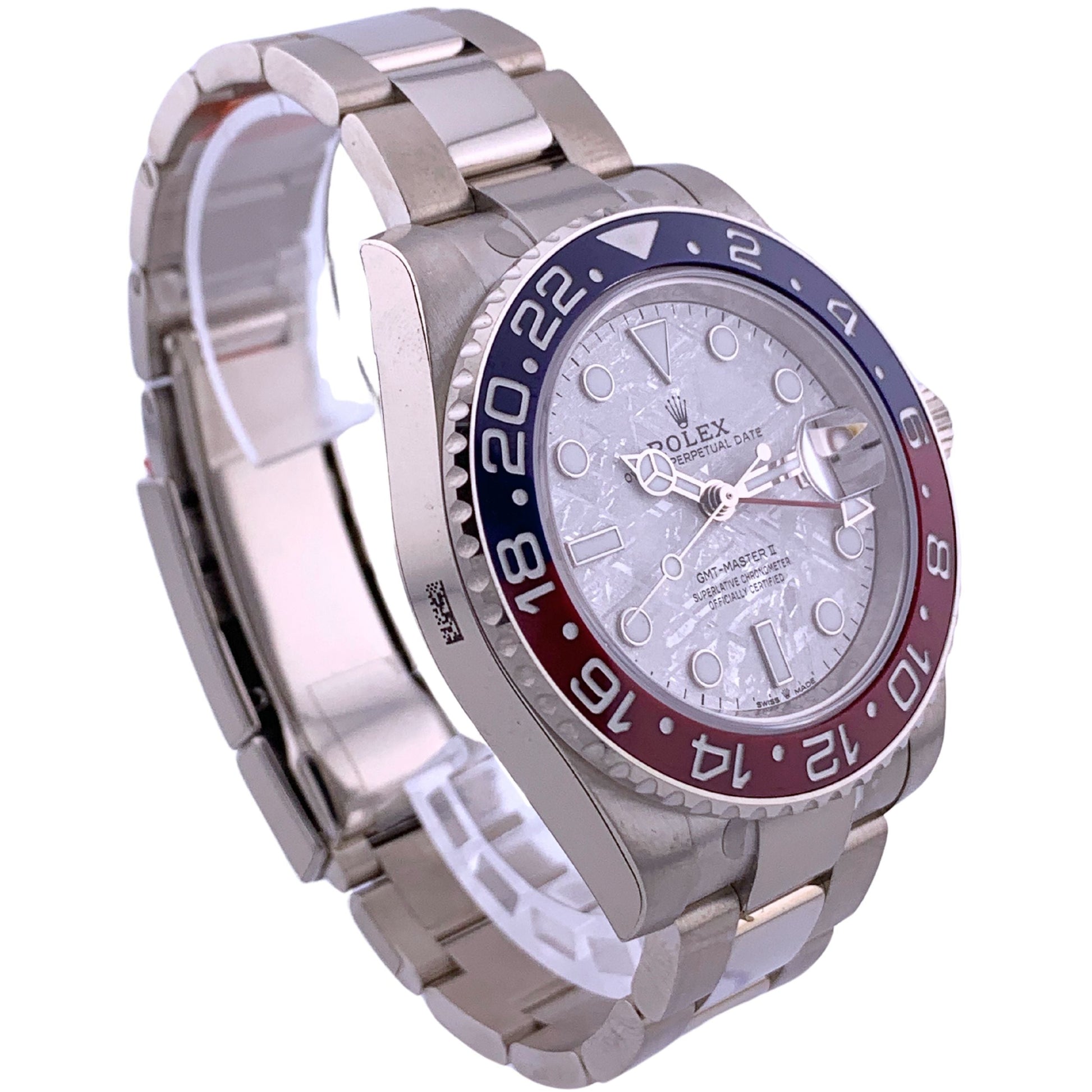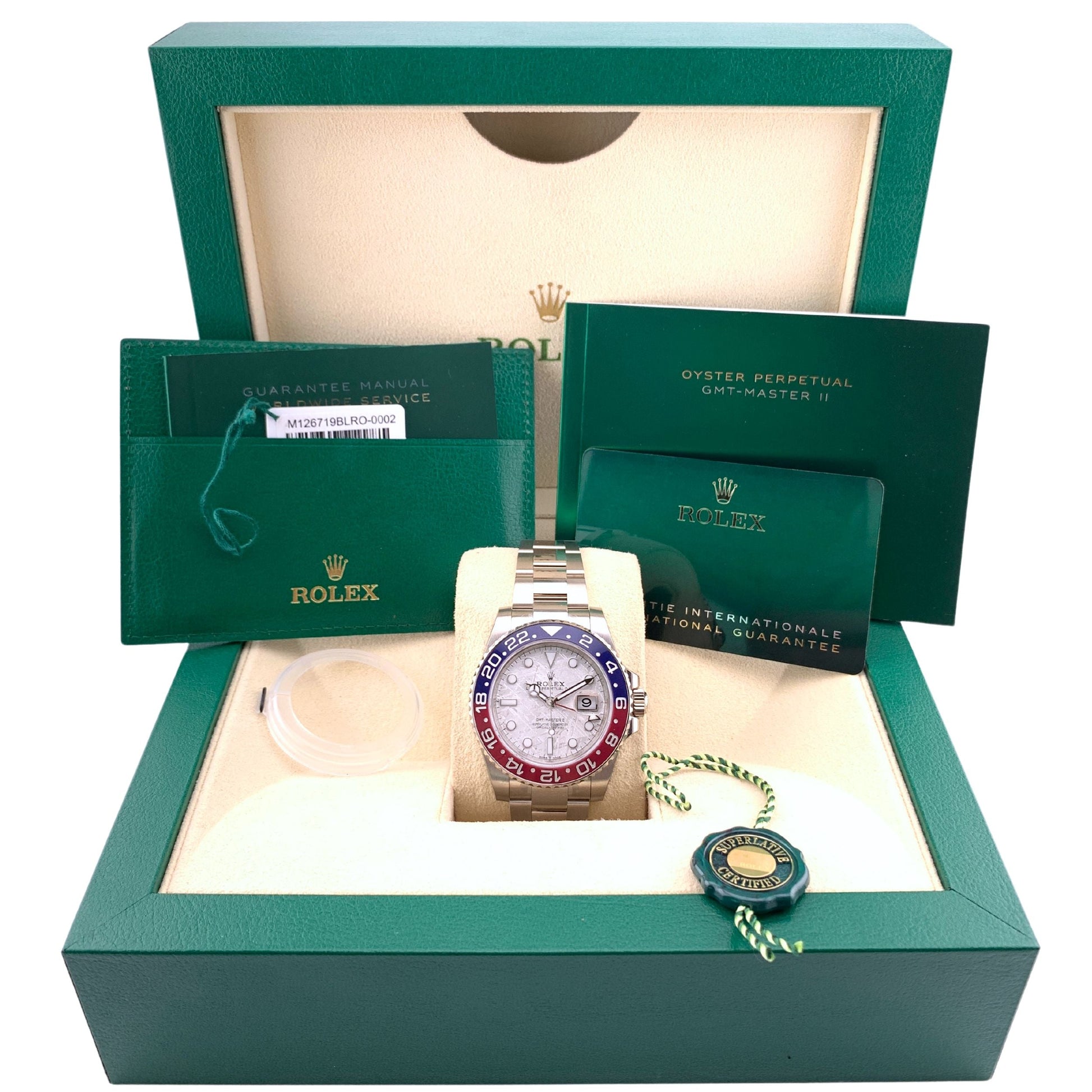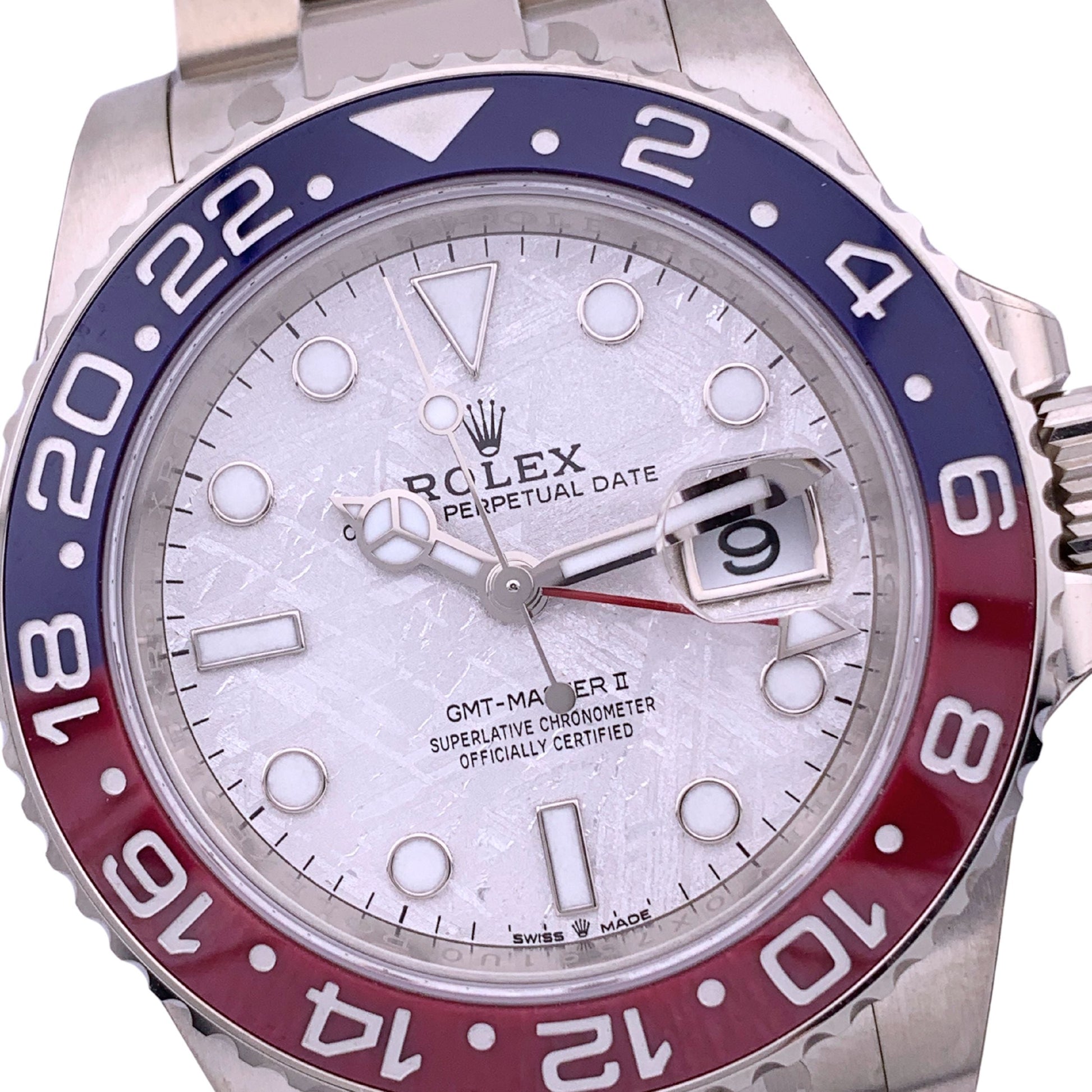 The Rolex GMT Master II 126719BLRO with a rare meteorite dial is a striking and highly sought-after timepiece, blending cutting-edge craftsmanship with a truly unique design. This 2023 model, brand new and still with its original stickers, features a stunning 40mm meteorite dial that adds an exclusive, celestial touch to the watch. The white gold case enhances its luxurious appeal, while the iconic red and blue "Pepsi" bezel offers the classic Rolex aesthetic. Designed for travelers, the GMT function allows the wearer to track multiple time zones effortlessly, powered by the highly precise Rolex Calibre 3285 movement with a 70-hour power reserve. The watch is fitted with a robust and comfortable Oyster bracelet, known for its durability and secure fit. This full set includes all original accessories, making it perfect for collectors and enthusiasts. Over the years, the GMT Master II has been worn by notable figures such as Tom Hanks, Sylvester Stallone, and David Beckham, who have been spotted wearing different iterations of this iconic watch, further solidifying its reputation as a symbol of style and adventure.