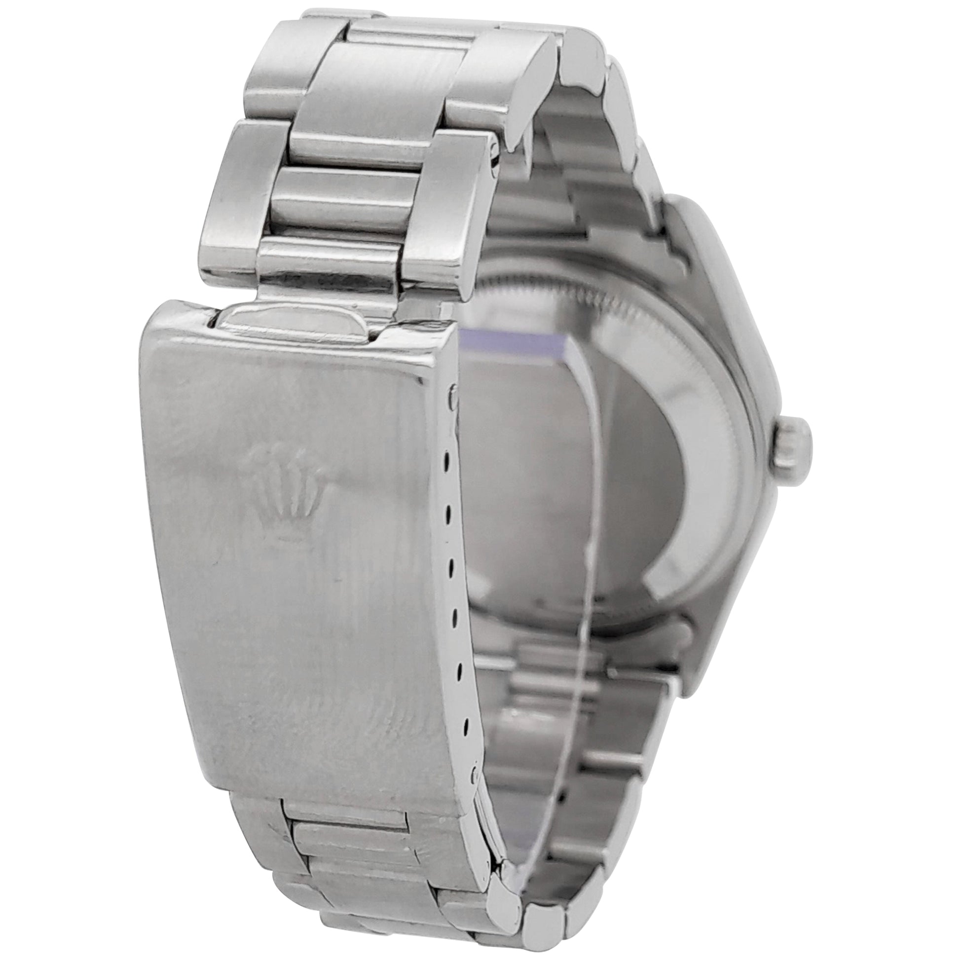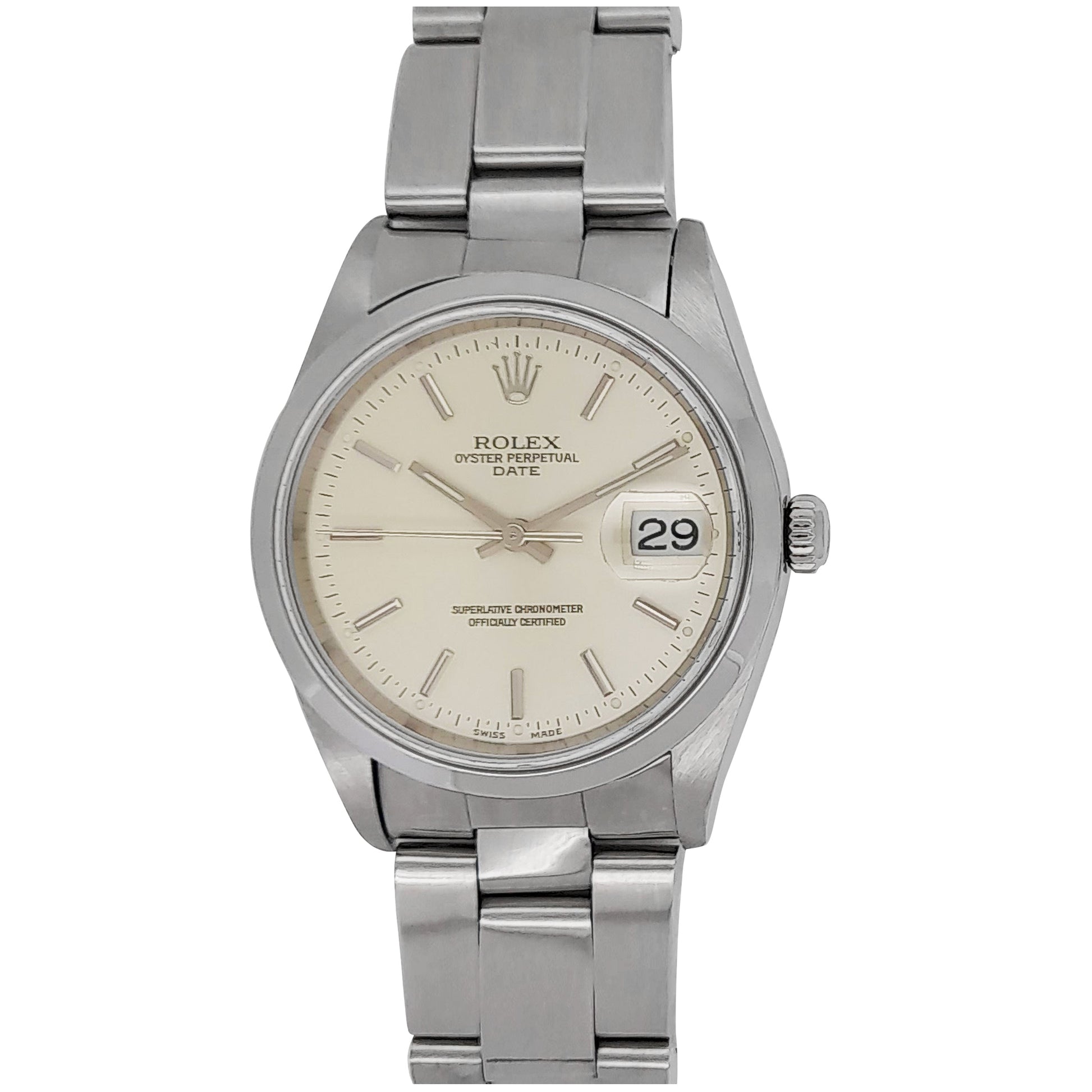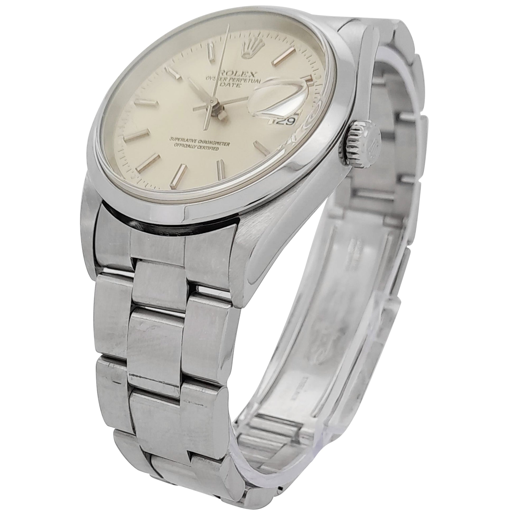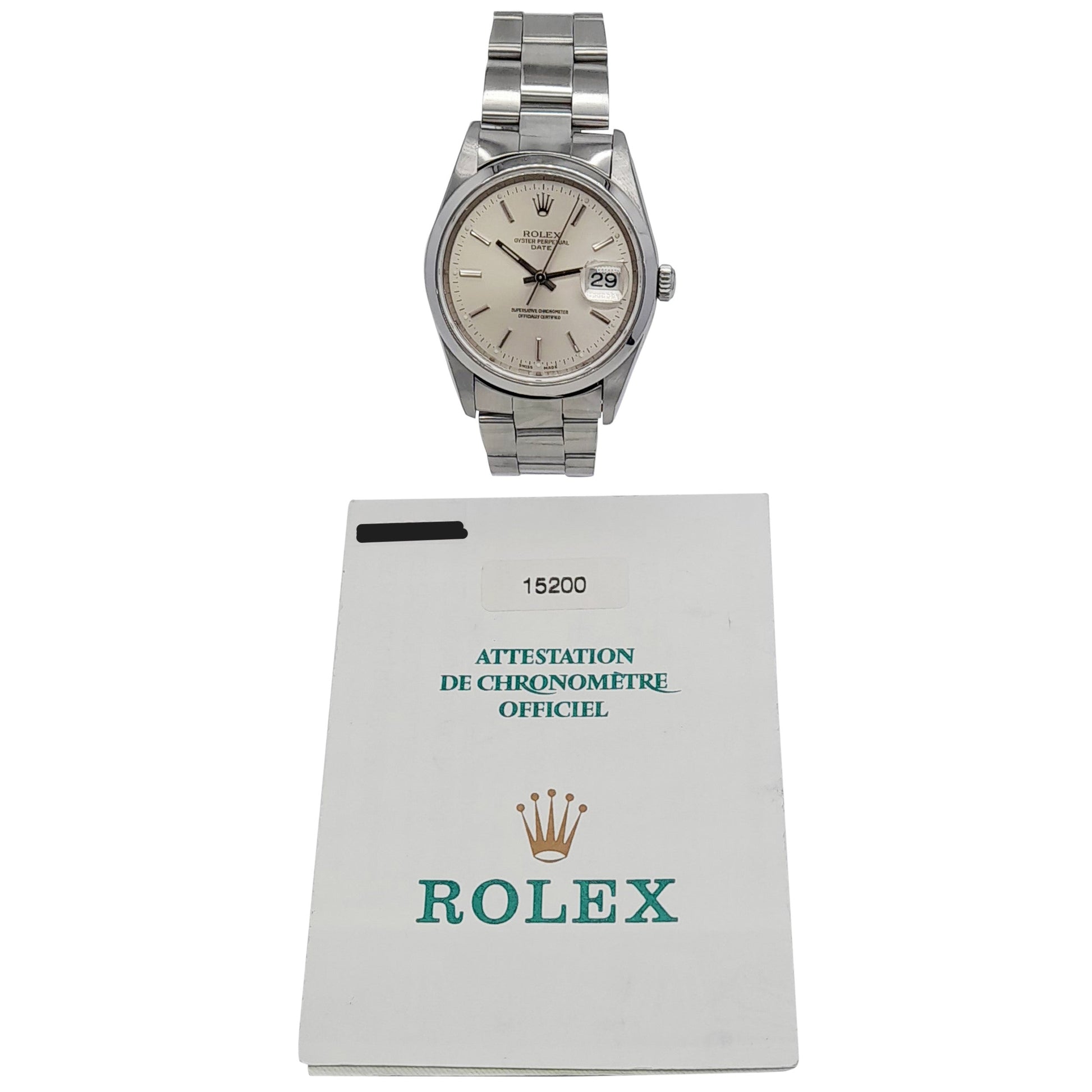 Rolex Date Men's Watch 15200. This 34mm watch features an Oystersteel case with a smooth domed bezel and is fitted with an Oyster bracelet. The white dial is protected by a sapphire crystal and features alternating Arabic numeral and index hour markers. It is powered by the Rolex Caliber 3135 self-winding automatic COSC Superlative Chronometer certified movement with a 48 hour power reserve.