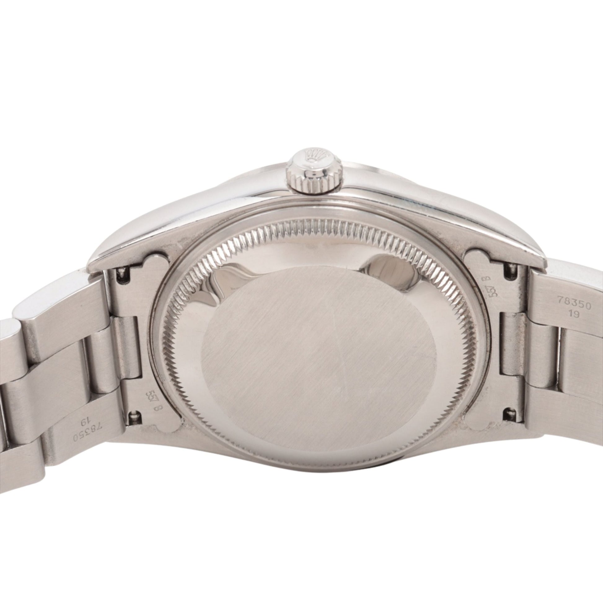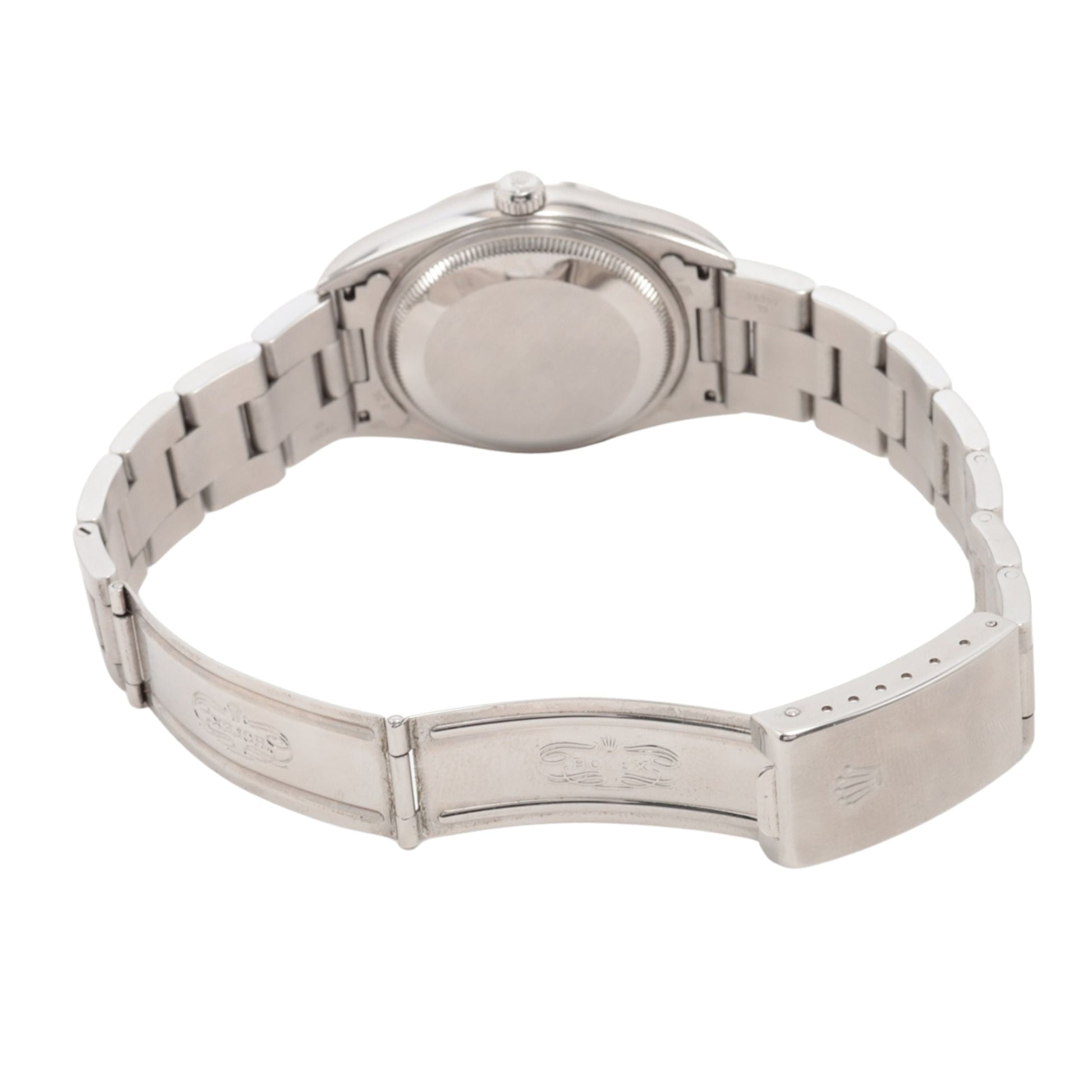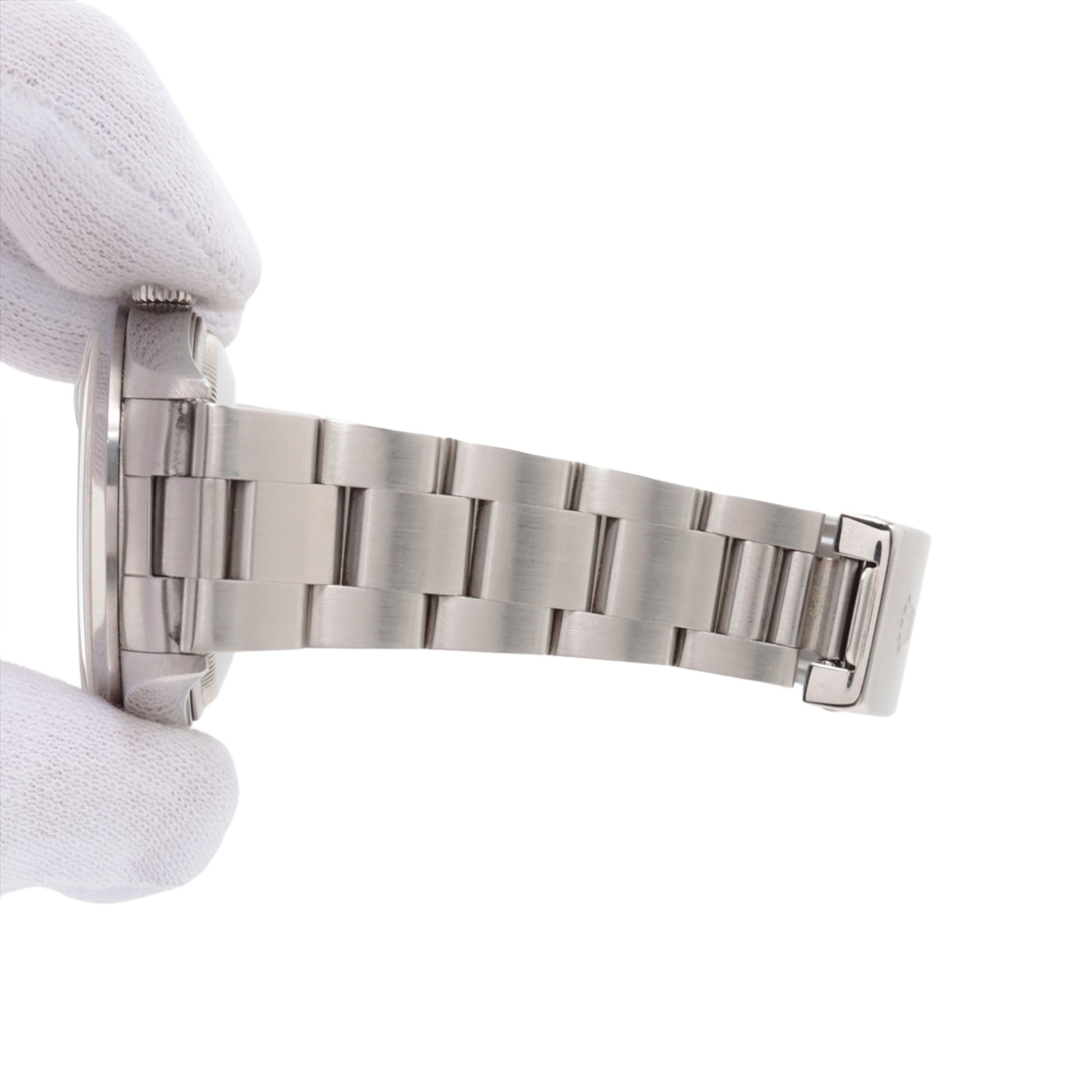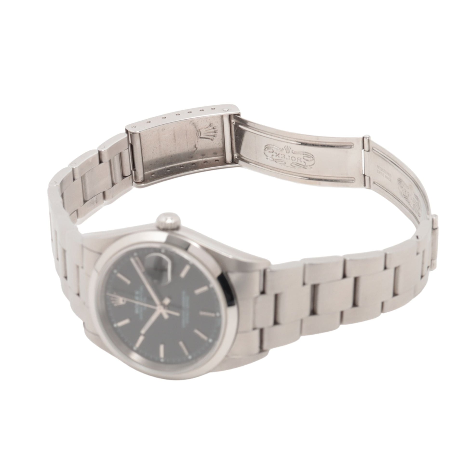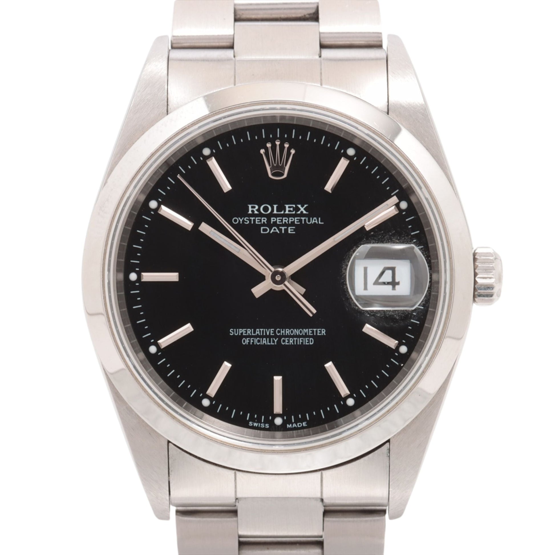 Rolex Date Men's Watch 15200. This 34mm watch features an Oystersteel case with a smooth domed bezel and is fitted with an Oyster bracelet. The white dial is protected by a sapphire crystal and features alternating Arabic numeral and index hour markers. It is powered by the Rolex Caliber 3135 self-winding automatic COSC Superlative Chronometer certified movement with a 48 hour power reserve.