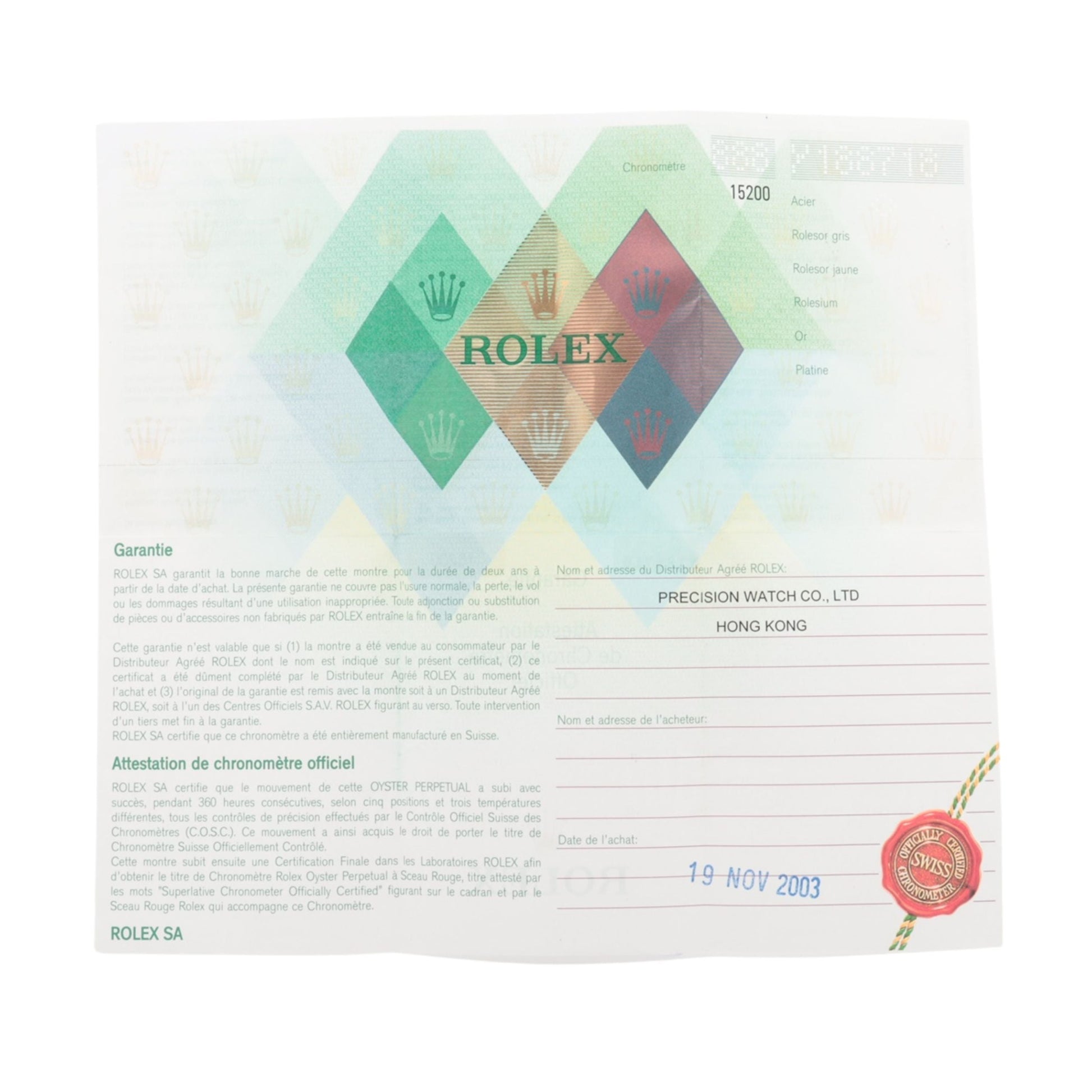 The original warranty certification issued with a watch