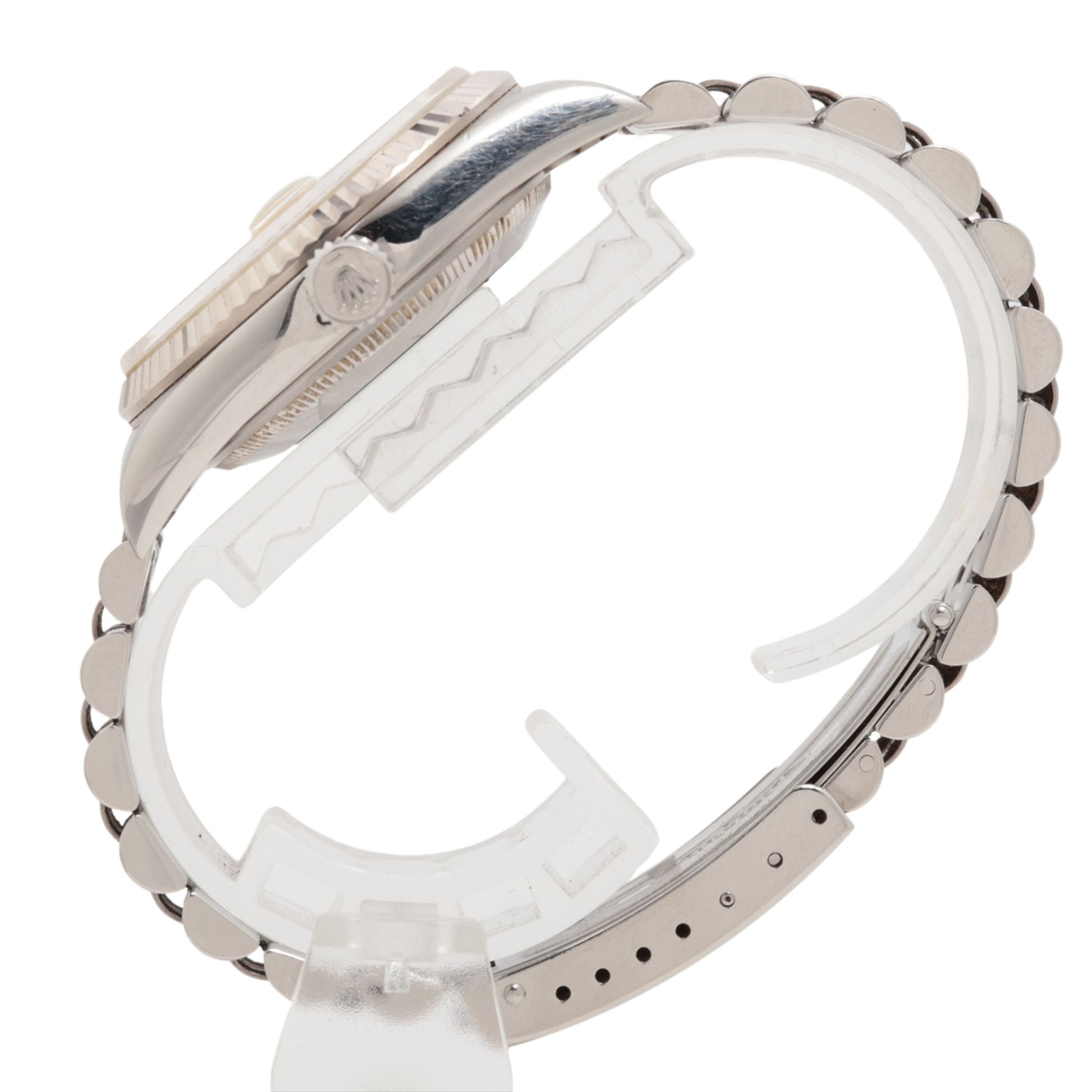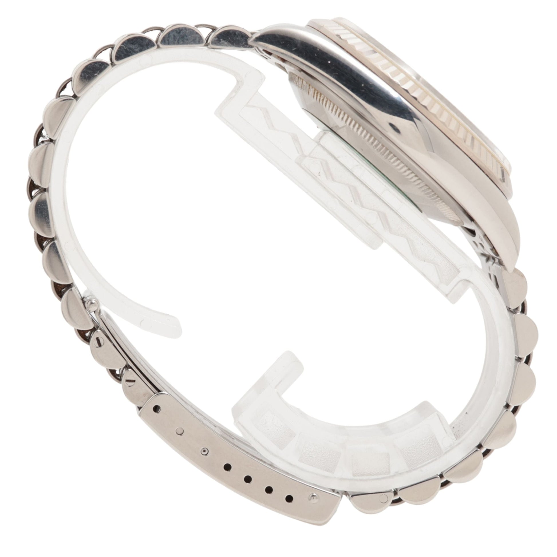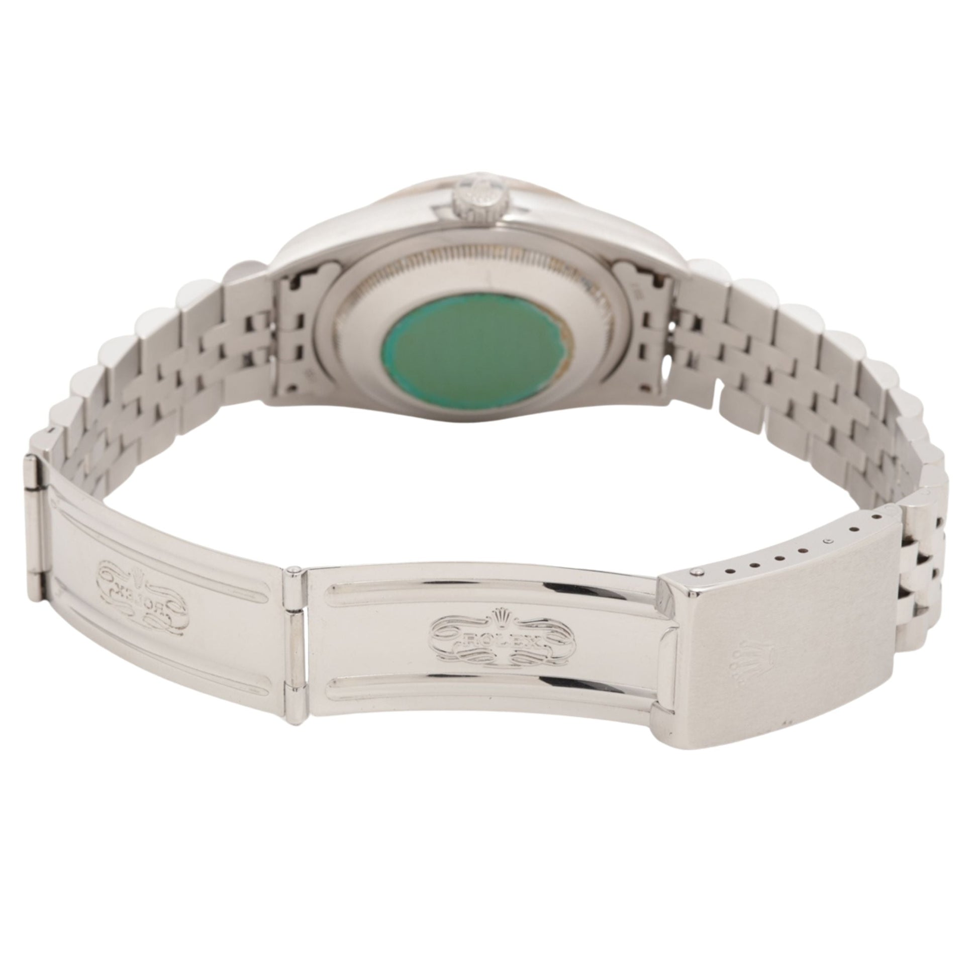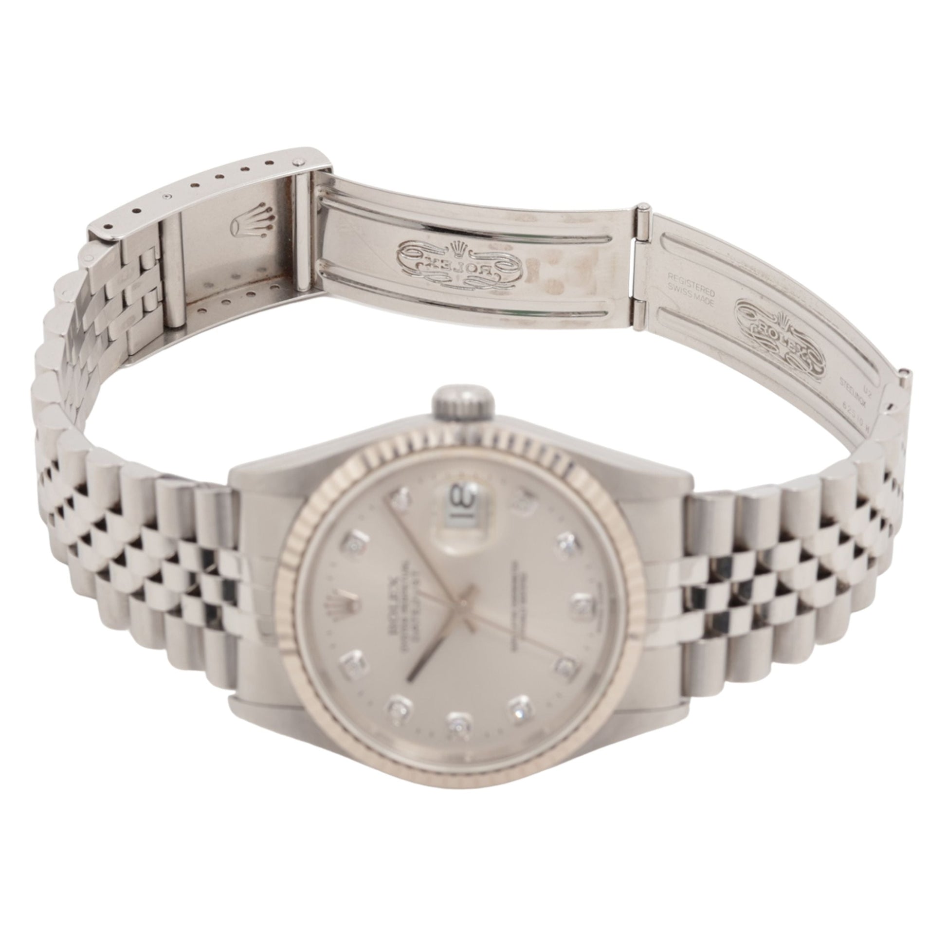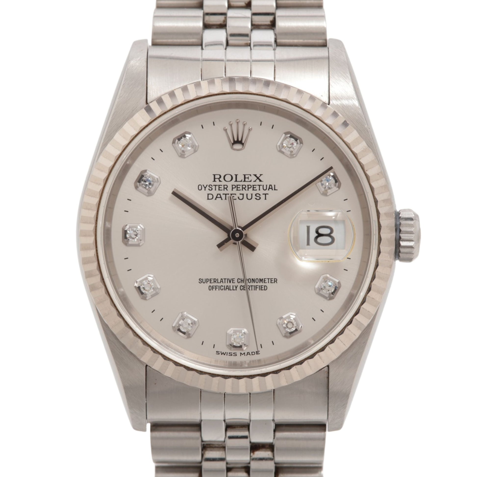 The midsize Rolex Datejust 36 16234 collection of watches for men and women feature a solid 18k white gold fluted bezel set on an oystersteel stainless steel case with the option of the Rolex oyster bracelet or jubilee bracelet. The case houses the COSC Superlative Chronometer Certified Rolex Caliber 3135 self-winding automatic movement. Like all other Rolex Datejust watches, this collection features the instantaneous date setting feature and stop-seconds feature for precise time setting.