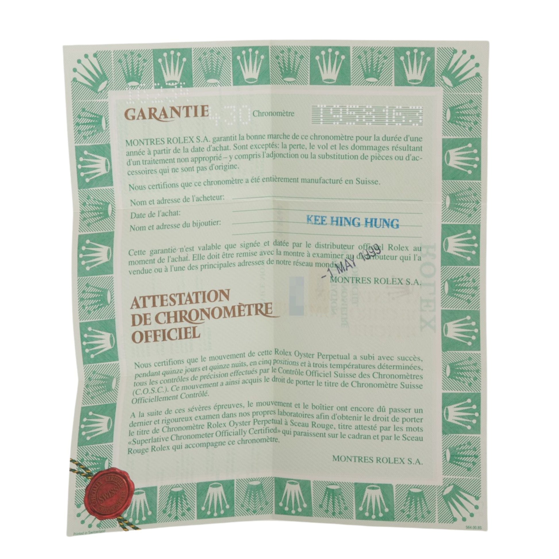 The original warranty certification issued with a watch