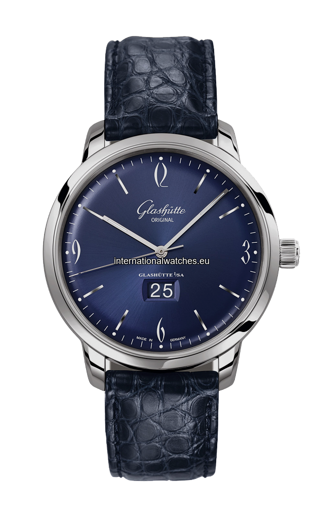 An authentic homage to the 1960s: the Sixties Panorama Date in vintage design. Automatic watch with blue dial, stainless steel case, leather strap.