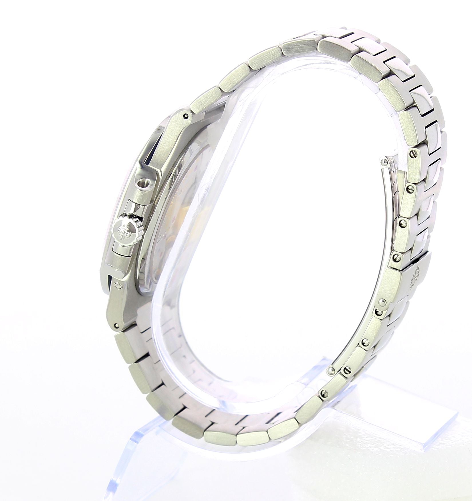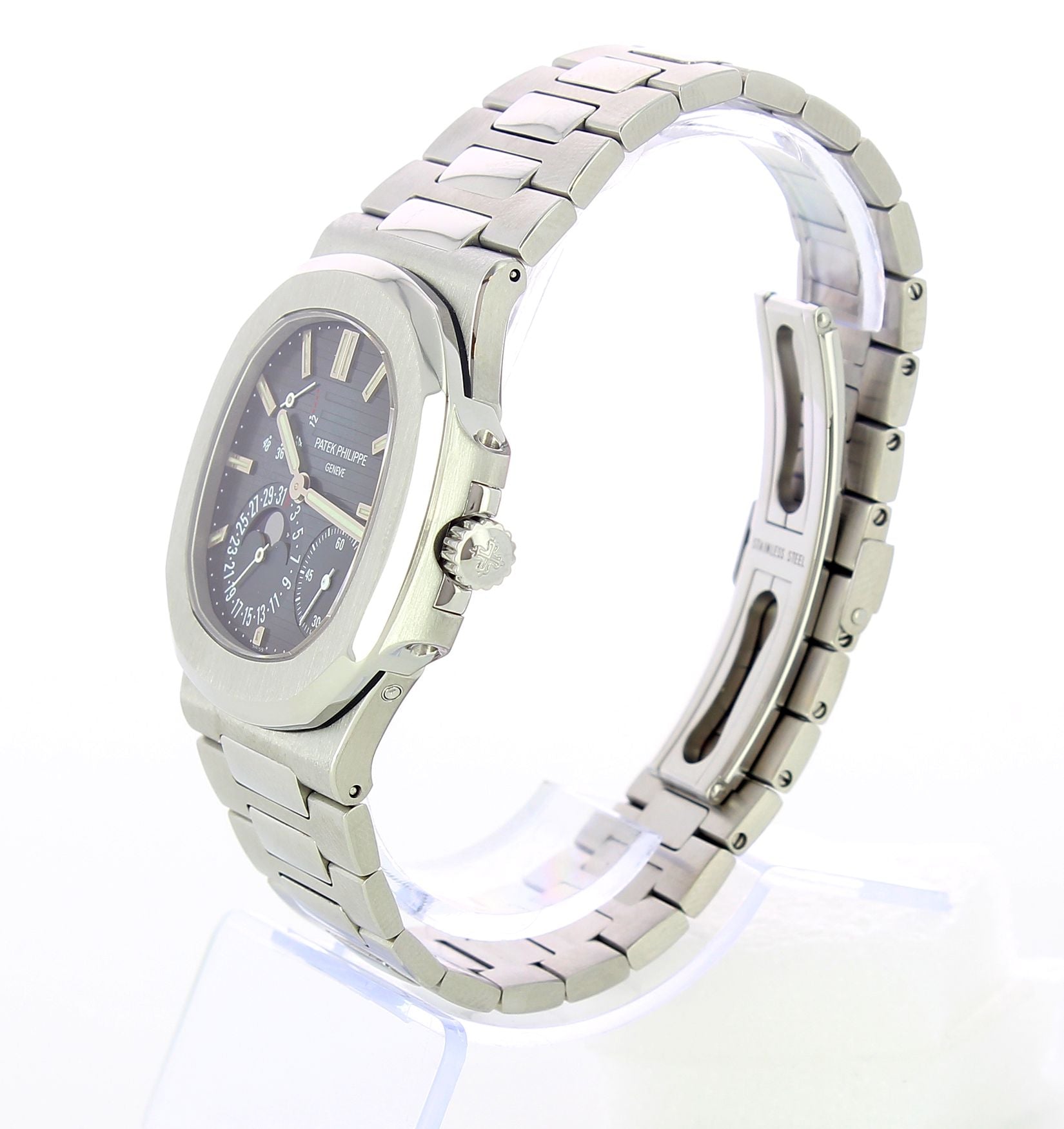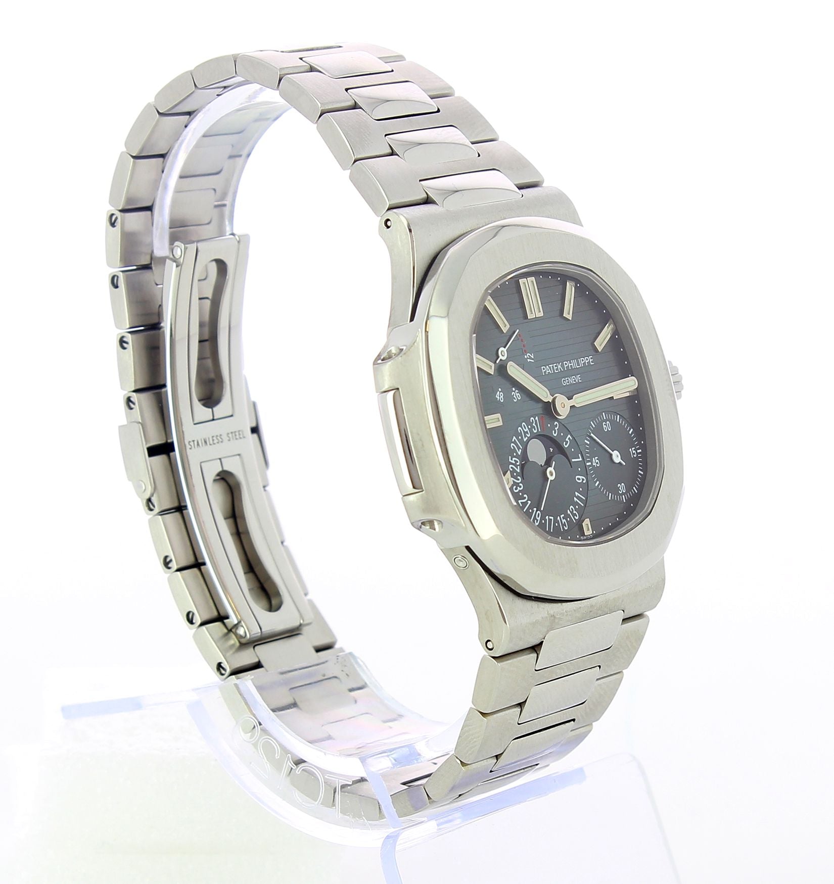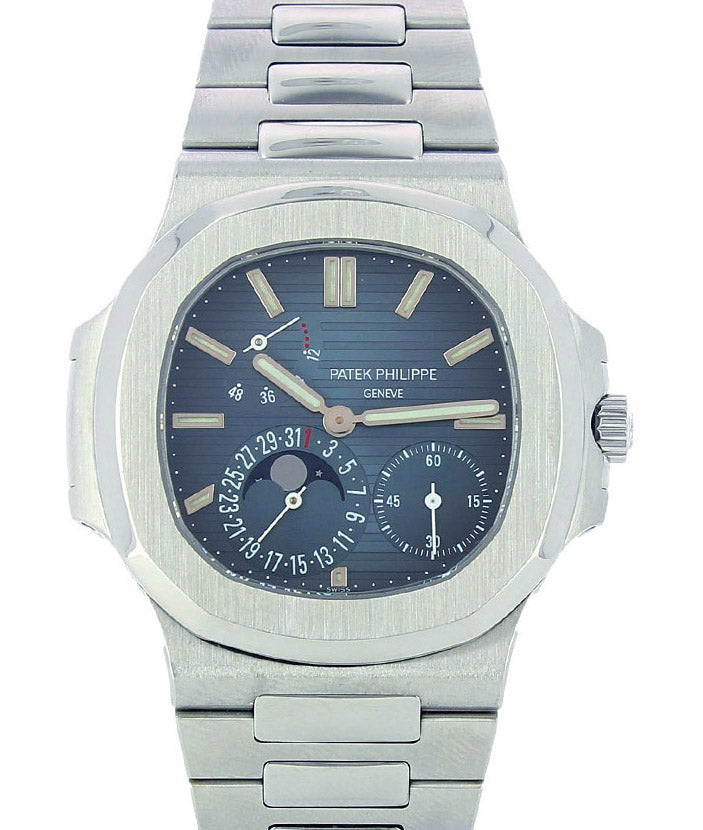 This Nautilus is in perfect condition, with original box and paper. This watch has a stainless steel case and bracelet. Transparent case back. Blue dial with luminescent hands and index hour markers. Three sub-dials displaying power reserve indicator, moonphase and small second. Very rare version that differs from the following ones (after 2008) due to the peculiarity of having a 48-dot ball (power reserve) and the lacquered lunar phases instead of printed ones. Geneva seal. Screw to the bracelet. Certificate of origin, extract from the archives. strap. Original Patek corrector in platinum. Patek revision certificate valid until December 2020.