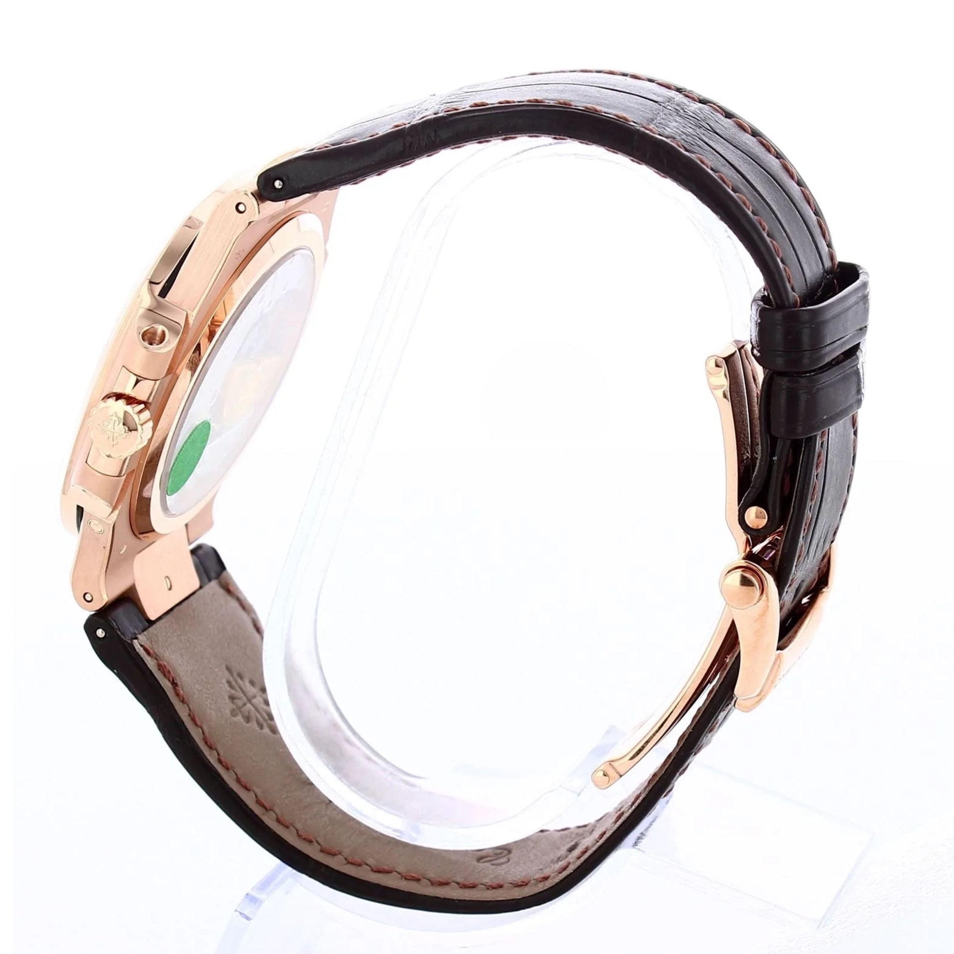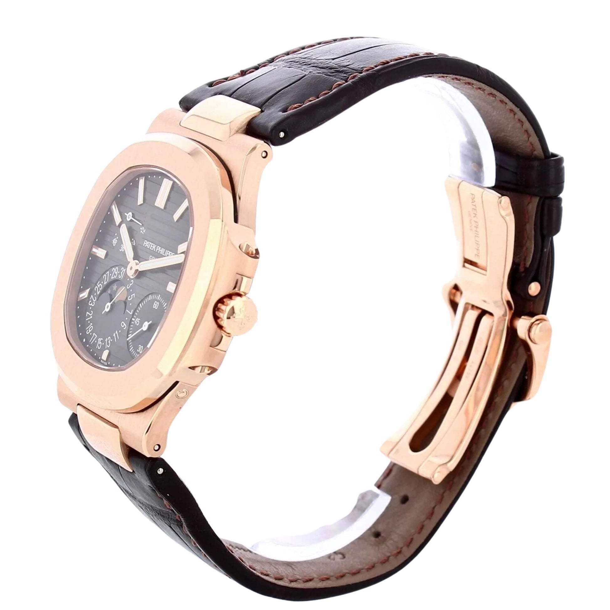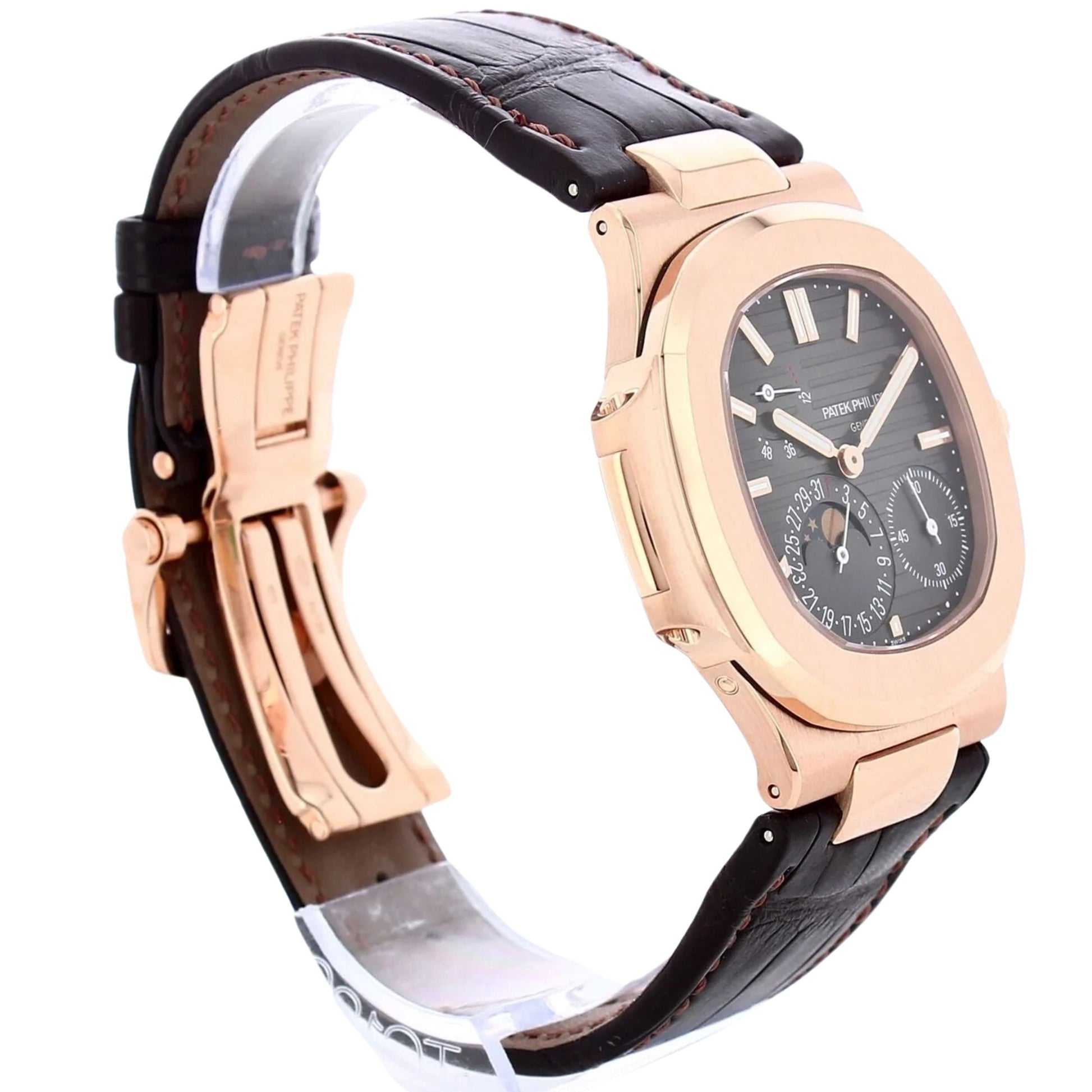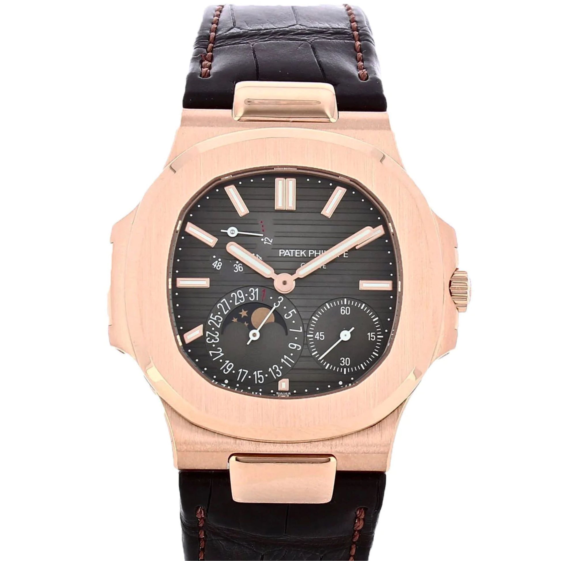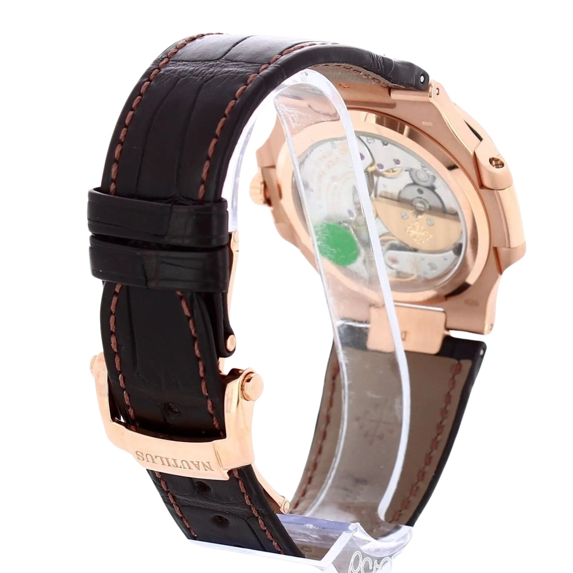 The watch features a 40mm case crafted from 18k rose gold ("R" for "rose"), which gives it a warm, refined appearance. It showcases the signature rounded octagonal bezel and the characteristic porthole-style construction of the Nautilus series. The rich brown dial has a sunburst finish that transitions to black toward the edges, creating a captivating gradient effect.
