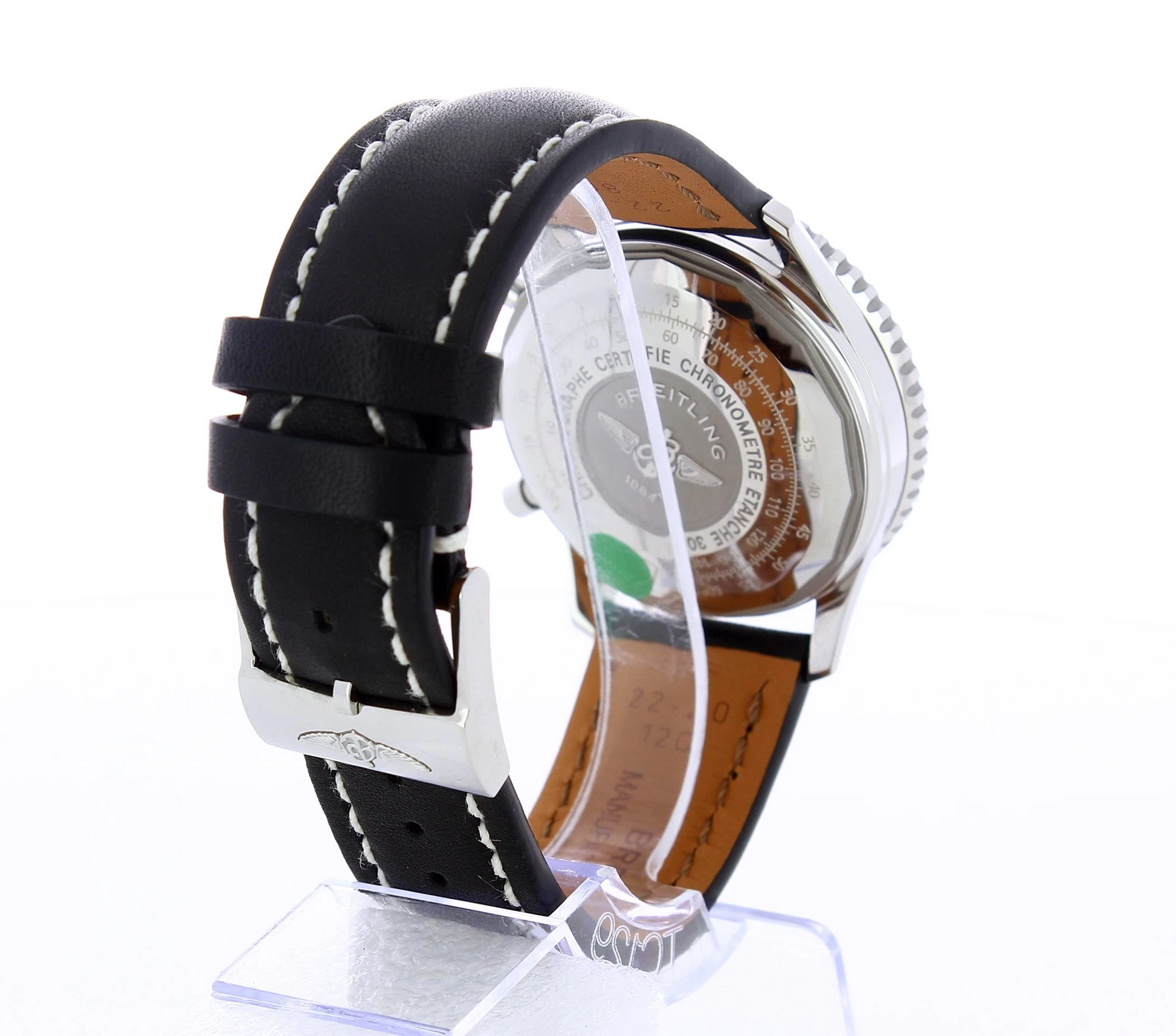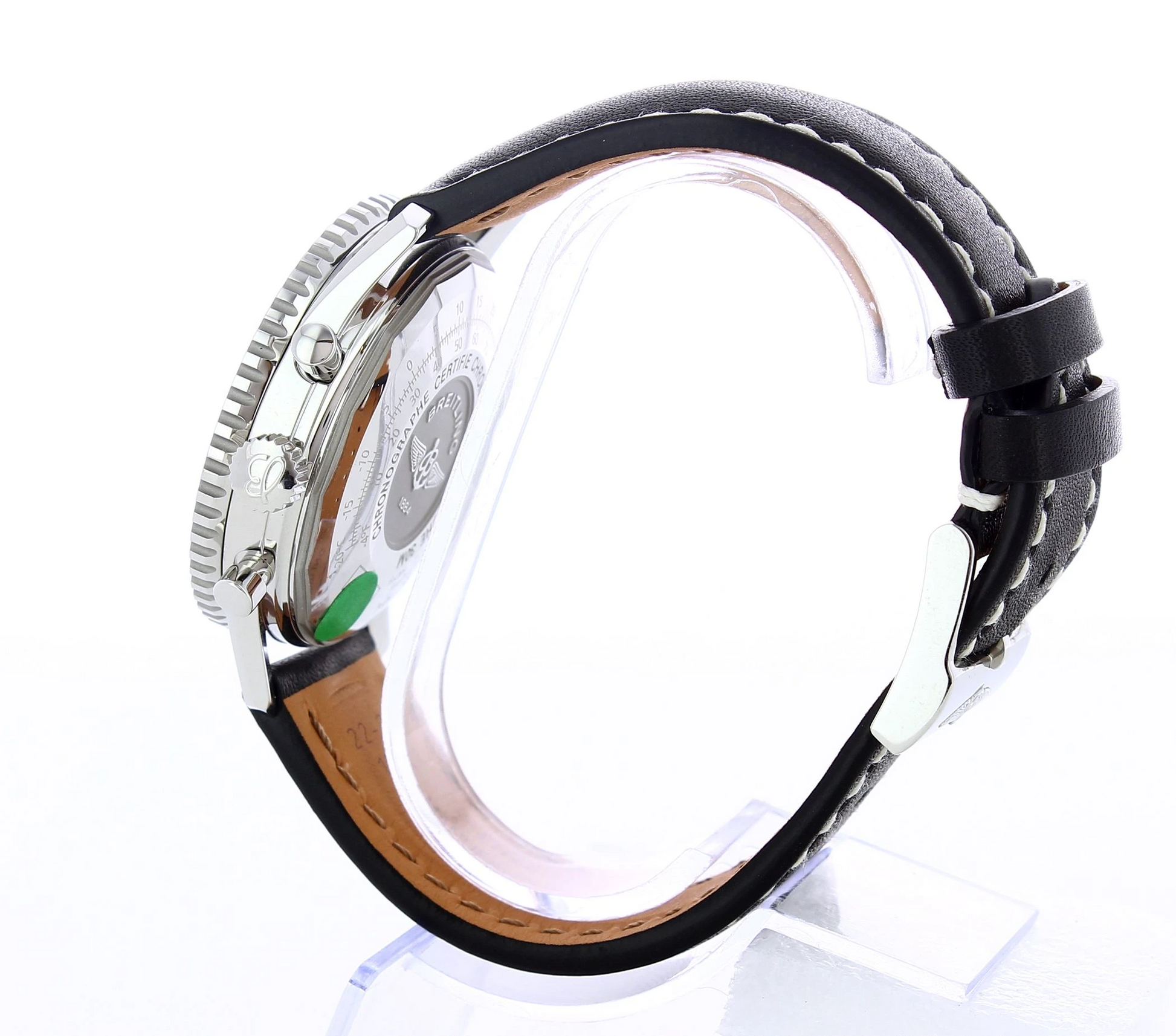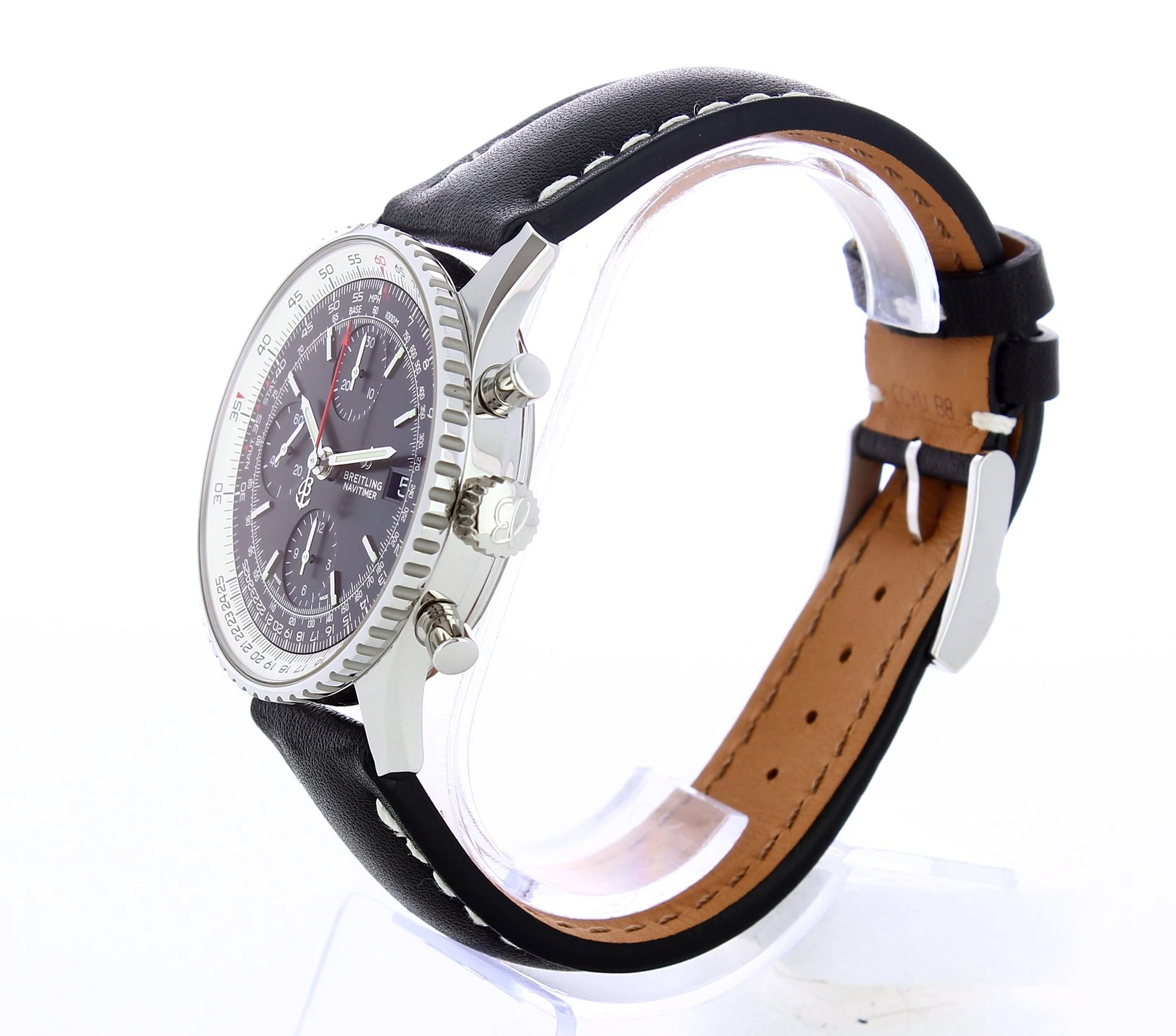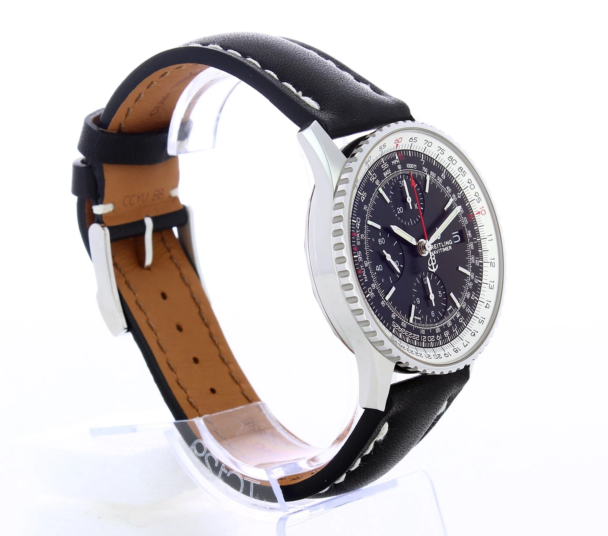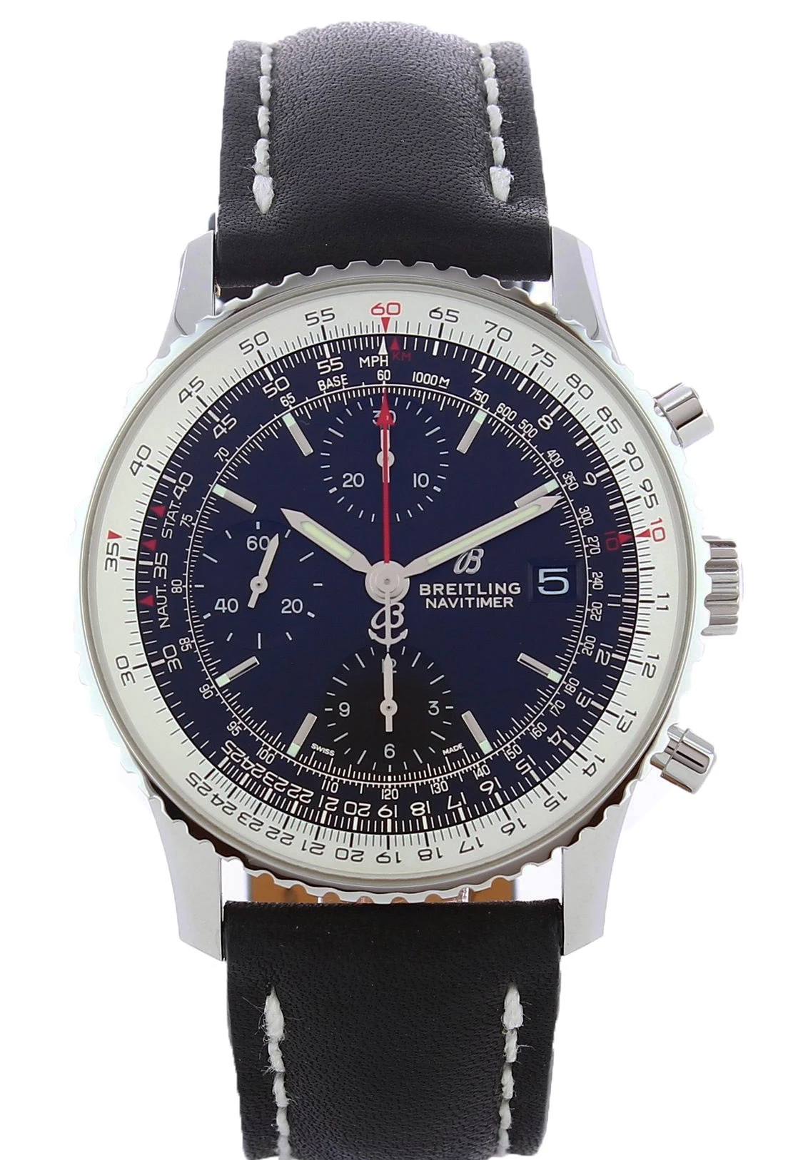 A tribute to the original Navi timer 1, this version is smaller but still with the circular slide rule, powered by the bidirectional rotating bezel, can perform all airborne navigation operations. Stainless steel case with a black leather strap. Bidirectional Rotating Bezel . Non screw-locked. Cambered sapphire, glareproofed both sides. Black dial with luminescent hands & hour markers. Chronograph Feature Large Central Chronograph Seconds Hand - 30 Minute Counter Sub Dial at 12 O'clock 12 Hour Counter Sub Dials at 6 O'clock - Small Seconds Sub-Dial at 9 O'clock Automatic movement Caliber Breitling 13 with a power reserve of 48h. 13324121B1X1.