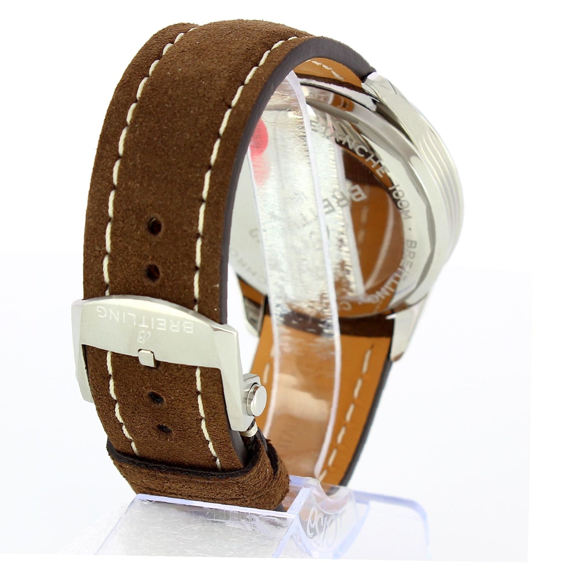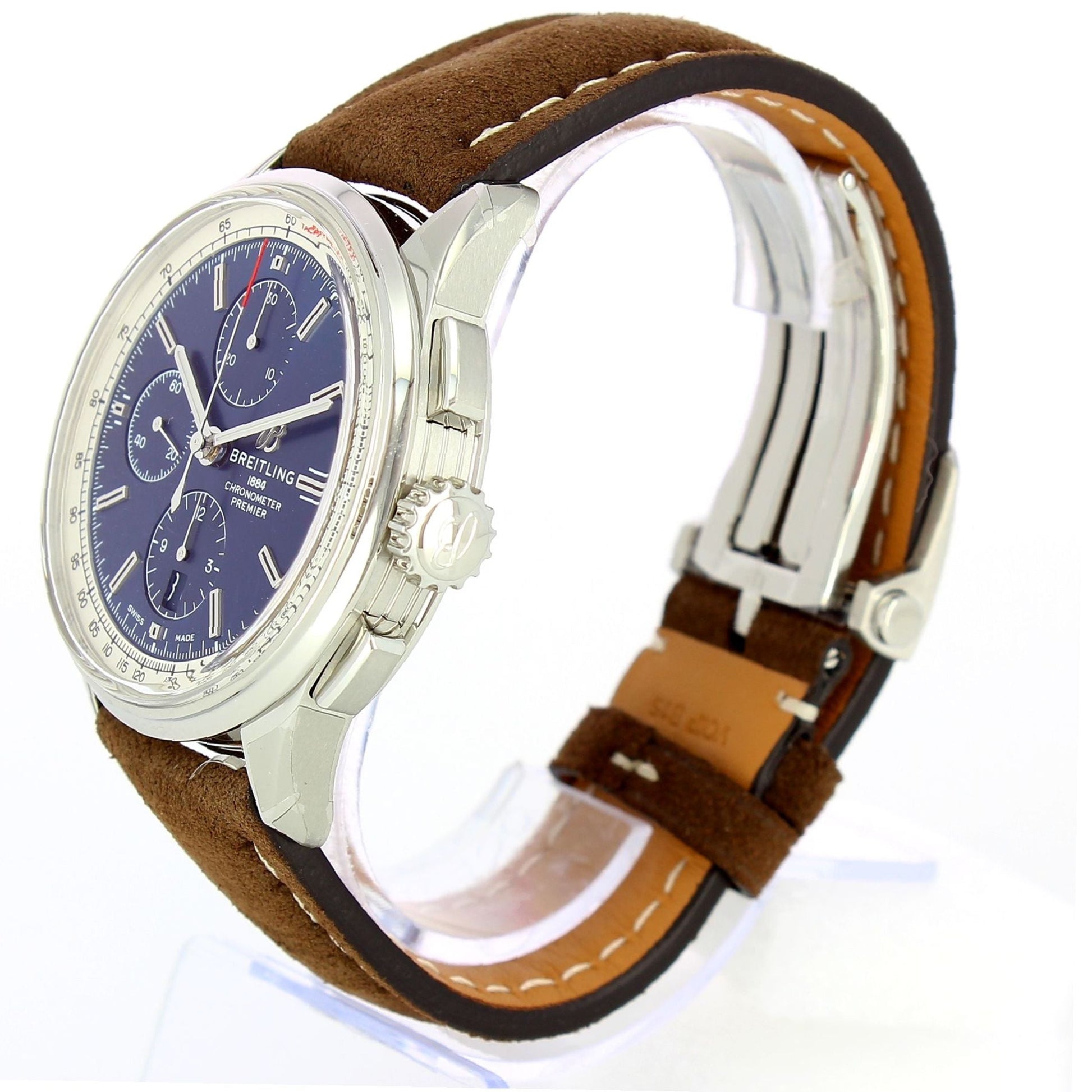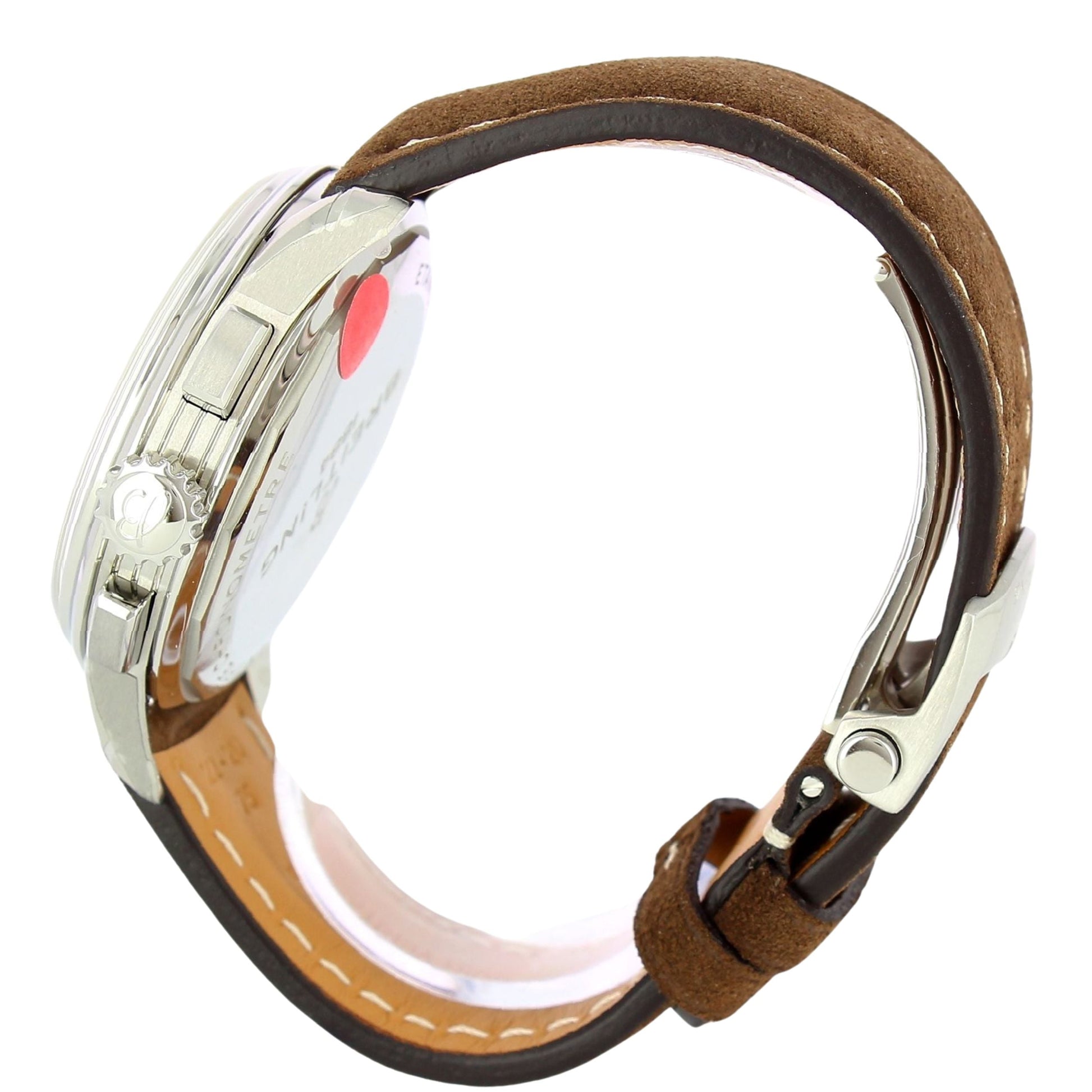 This Premier has a stainless steel case with a brown calfskin leather strap.Blue dial with silver flange with tachymeter scale. Applied index hour markers. Luminous hands and index hour markers. Date window at 6 o\'clock. Chronograph with three sub-dials : 12 hour counter sub-dial at 6 o\'clock, Small seconds sub-dial at 9 o\'clock and 30 minute counter sub-dial at 12 o\'clock. Scratch resistant sapphire crystal. Breitling Calibre 13 has an approximate power reserve of 48 hours.