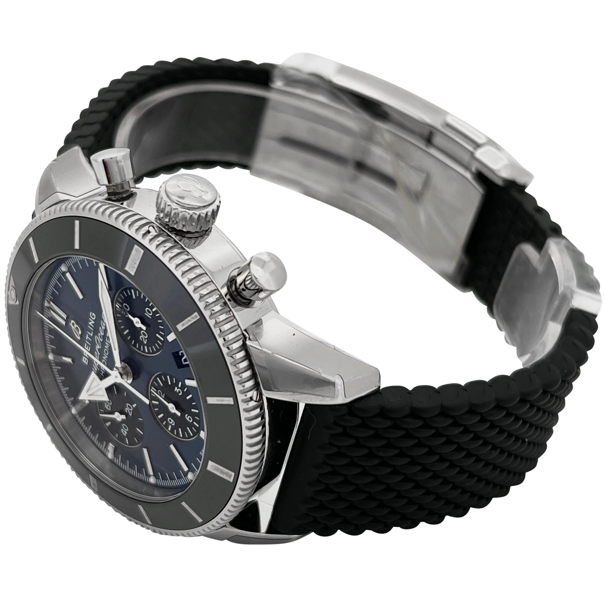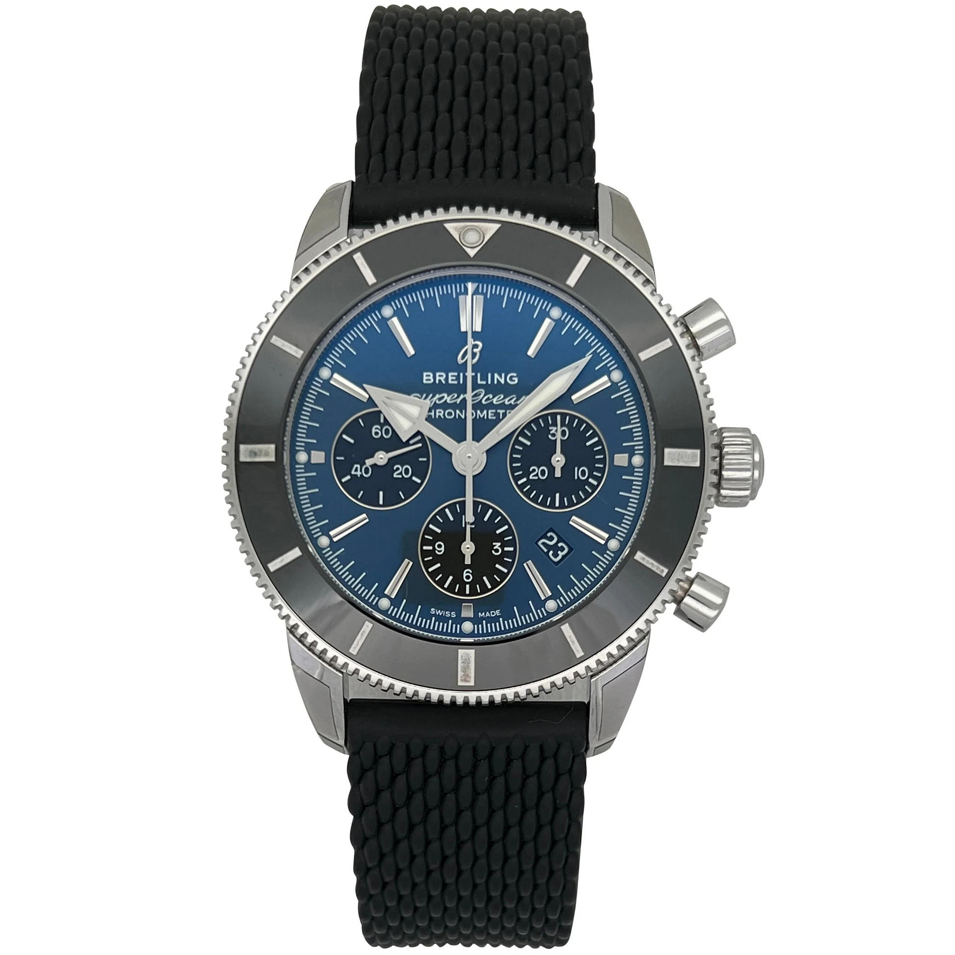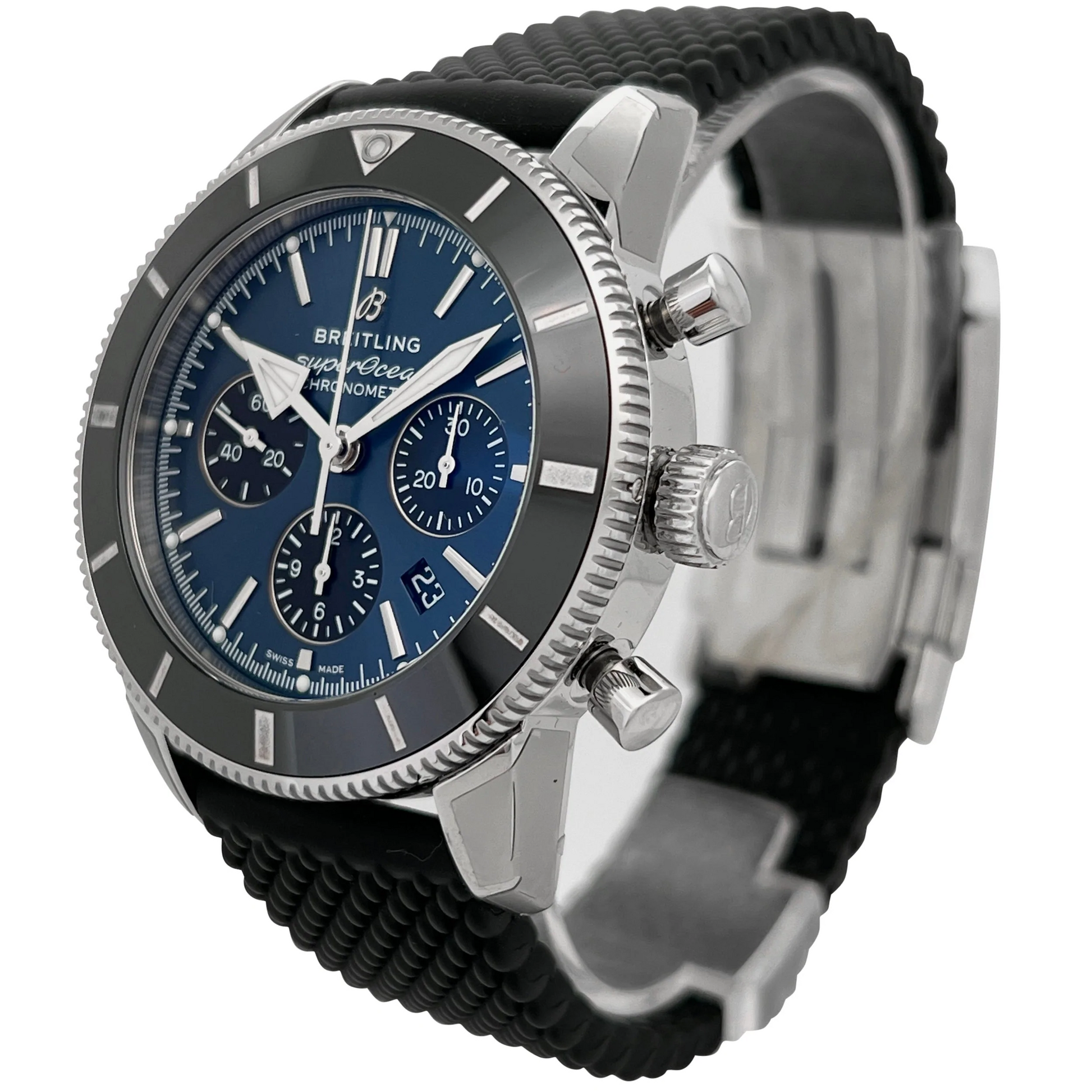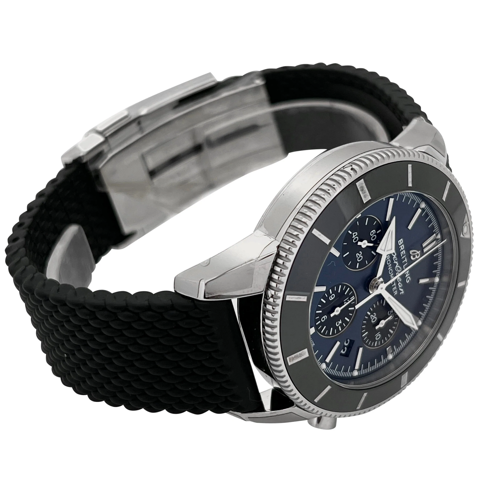 This Superocean Heritage has a stainless steel case with a black rubber strap. Uni-directional rotating black bezel. Blue dial with three black sub-dials (Blackeye). Luminous silver-tone hands and index hour markers. Date display between the 4 and 5 o\'clock positions. Scratch resistant sapphire crystal. Chronograph with three sub-dials displaying: 60 second, 30 minute and 12 hour. Breitling calibre 01 automatic movement with a 70-hour power reserve. The Breitling warranty is 5 years