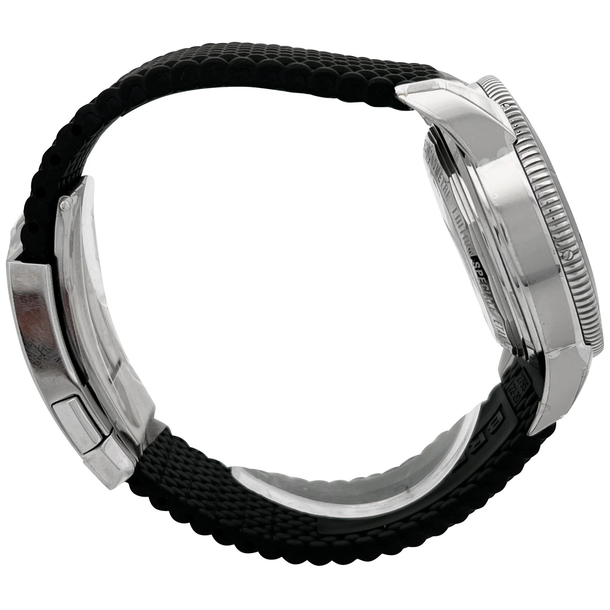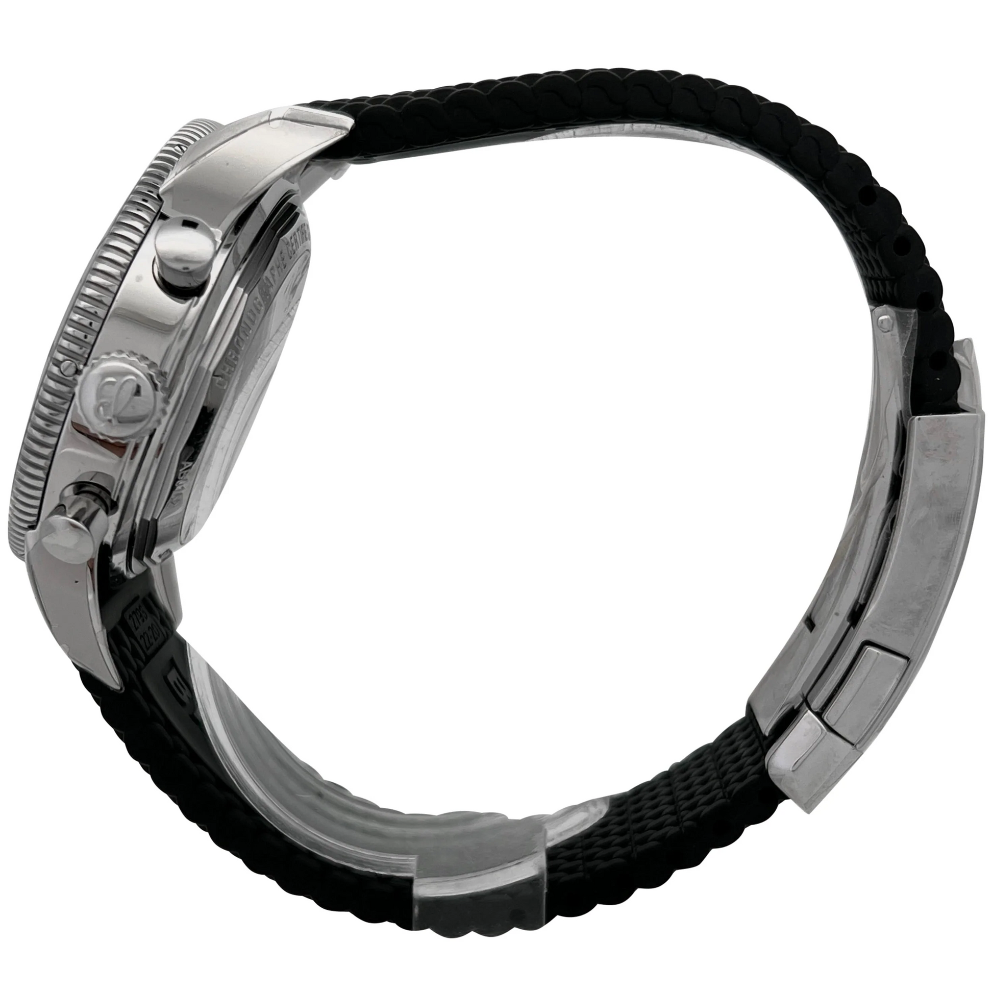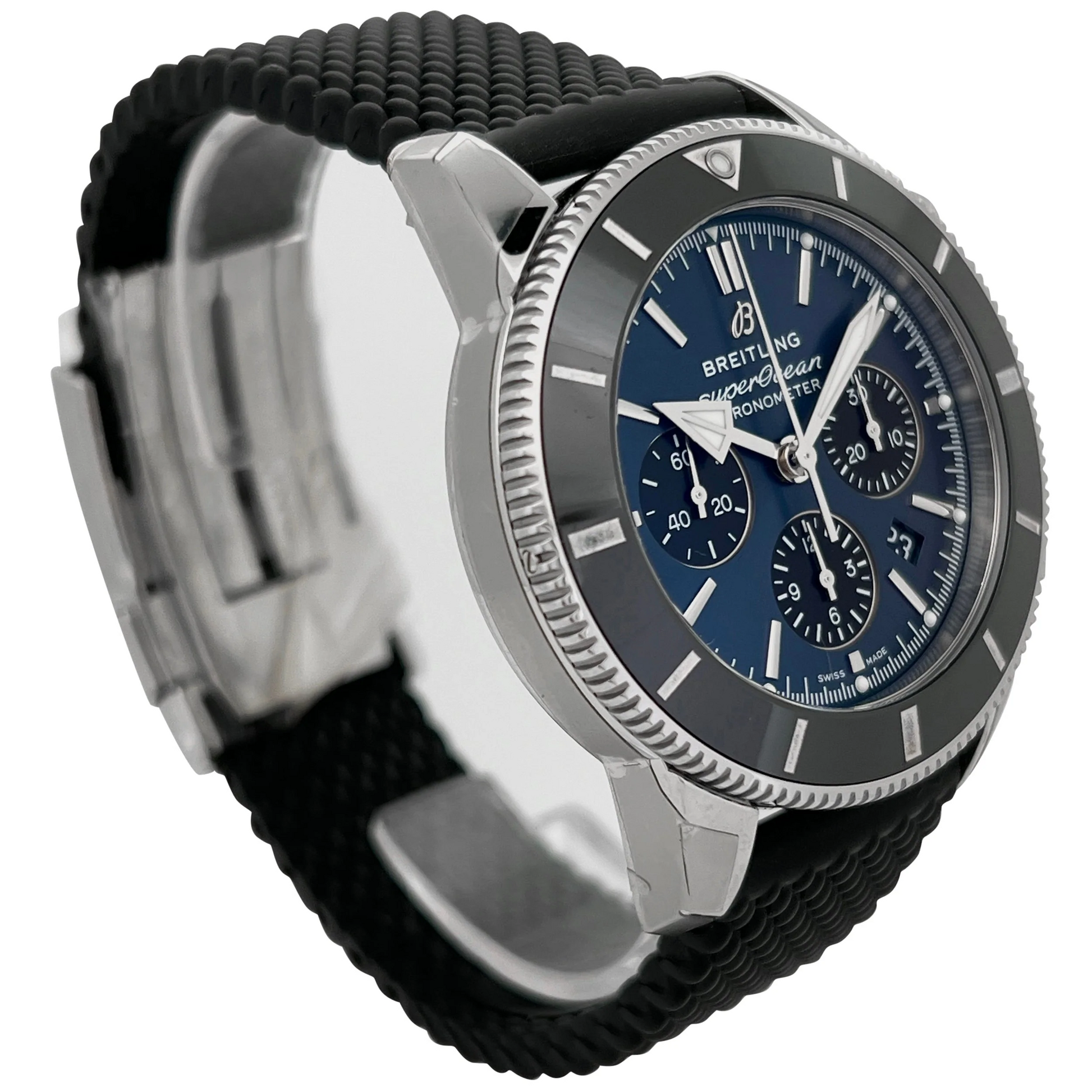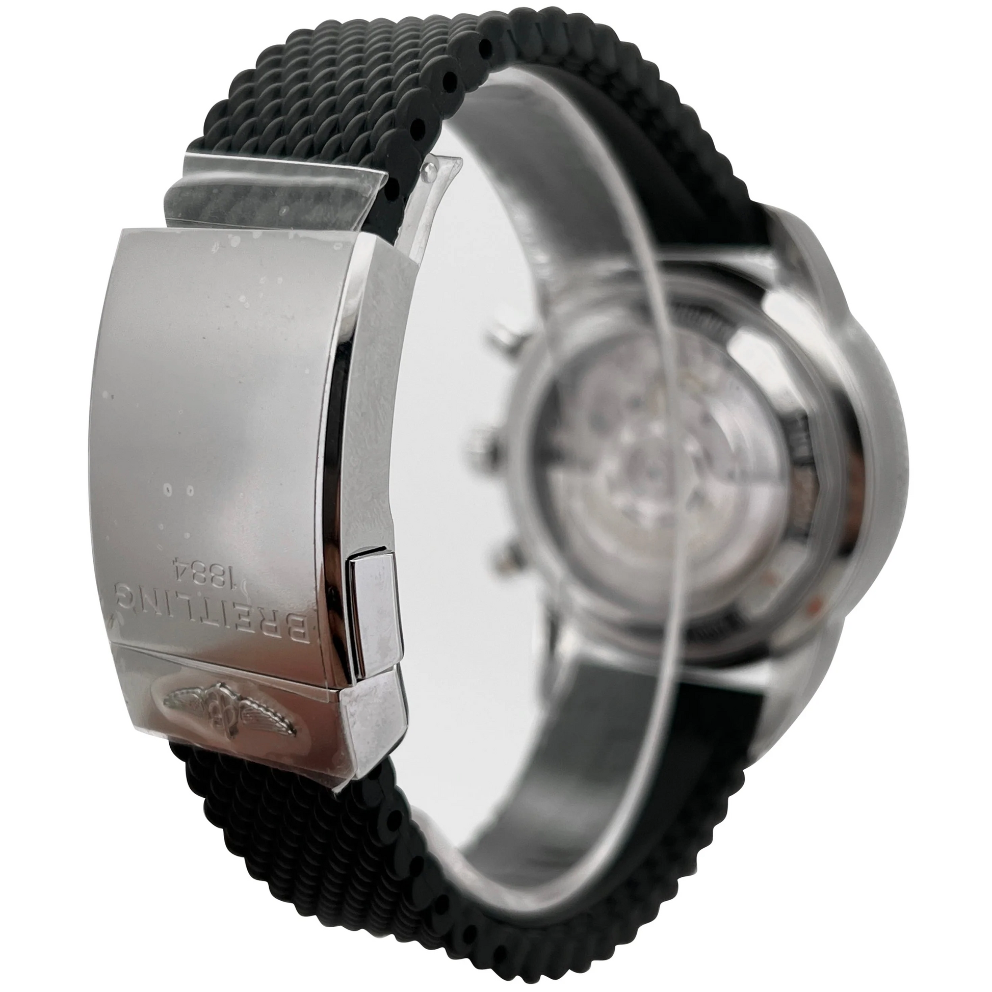This Superocean Heritage has a stainless steel case with a black rubber strap. Uni-directional rotating black bezel. Blue dial with three black sub-dials (Blackeye). Luminous silver-tone hands and index hour markers. Date display between the 4 and 5 o\'clock positions. Scratch resistant sapphire crystal. Chronograph with three sub-dials displaying: 60 second, 30 minute and 12 hour. Breitling calibre 01 automatic movement with a 70-hour power reserve. The Breitling warranty is 5 years