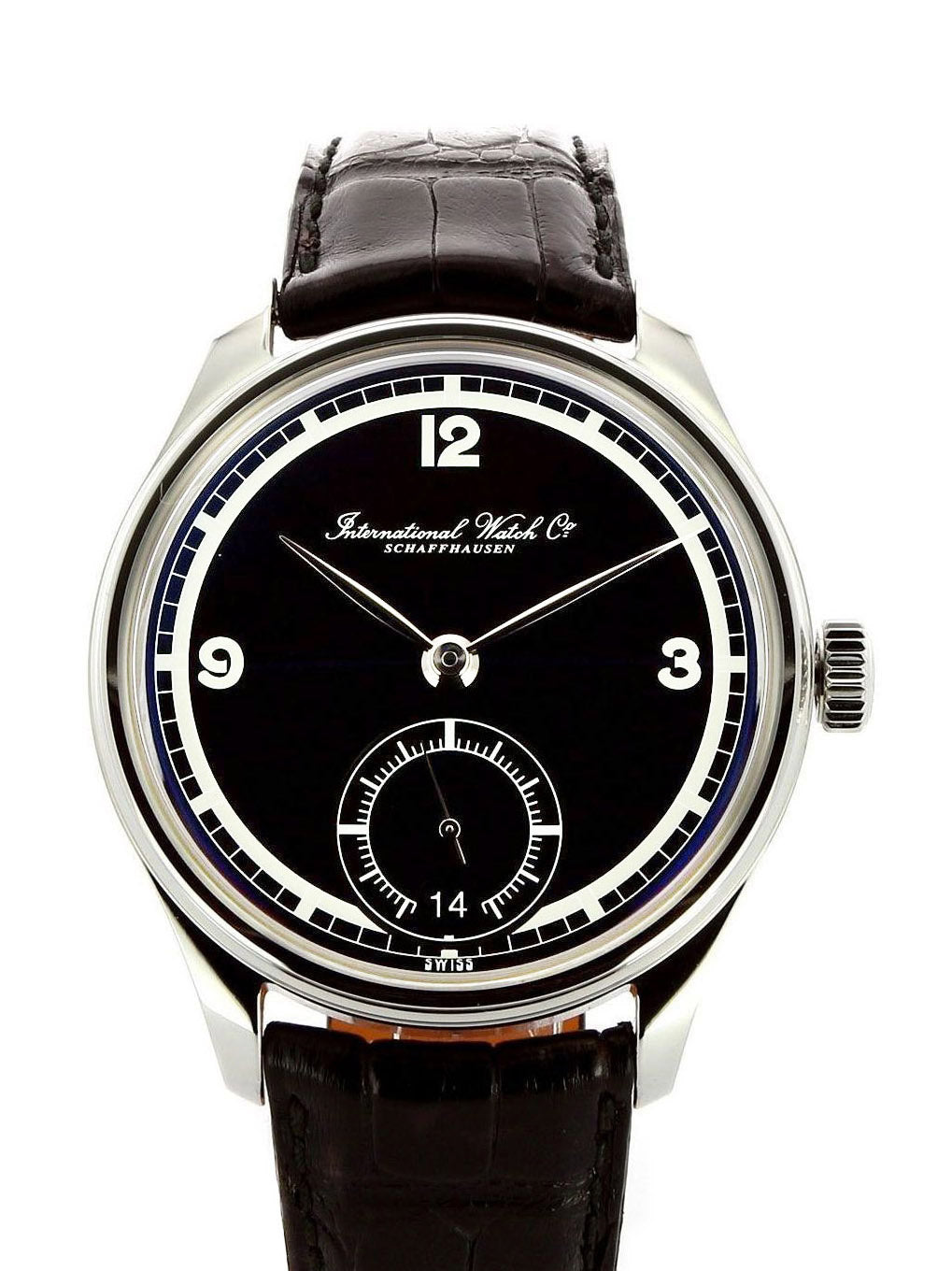 This Portugieser is a limited edition with 750 pieces. This 75th Anniversary watch has been designed in tribute to the original Portugieser from the 1930s. This watch has a stainless steel case with a black alligator leather strap made by Santoni. Matte black dial. White fine printed minutes track. Small running seconds sub-dial at the 6 o\'clock position with fine white printed seconds track. Date window displayed at the 6 o\'clock position. Power reserve indicator on the case back. IWC Caliber 59215.