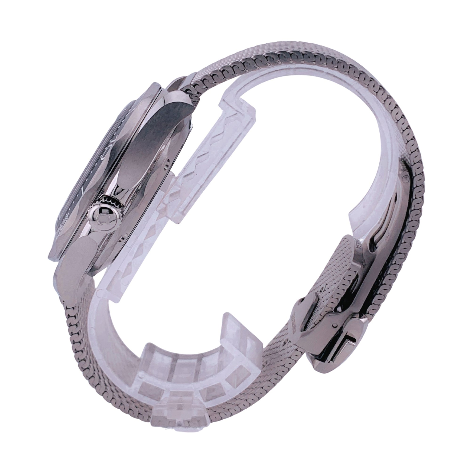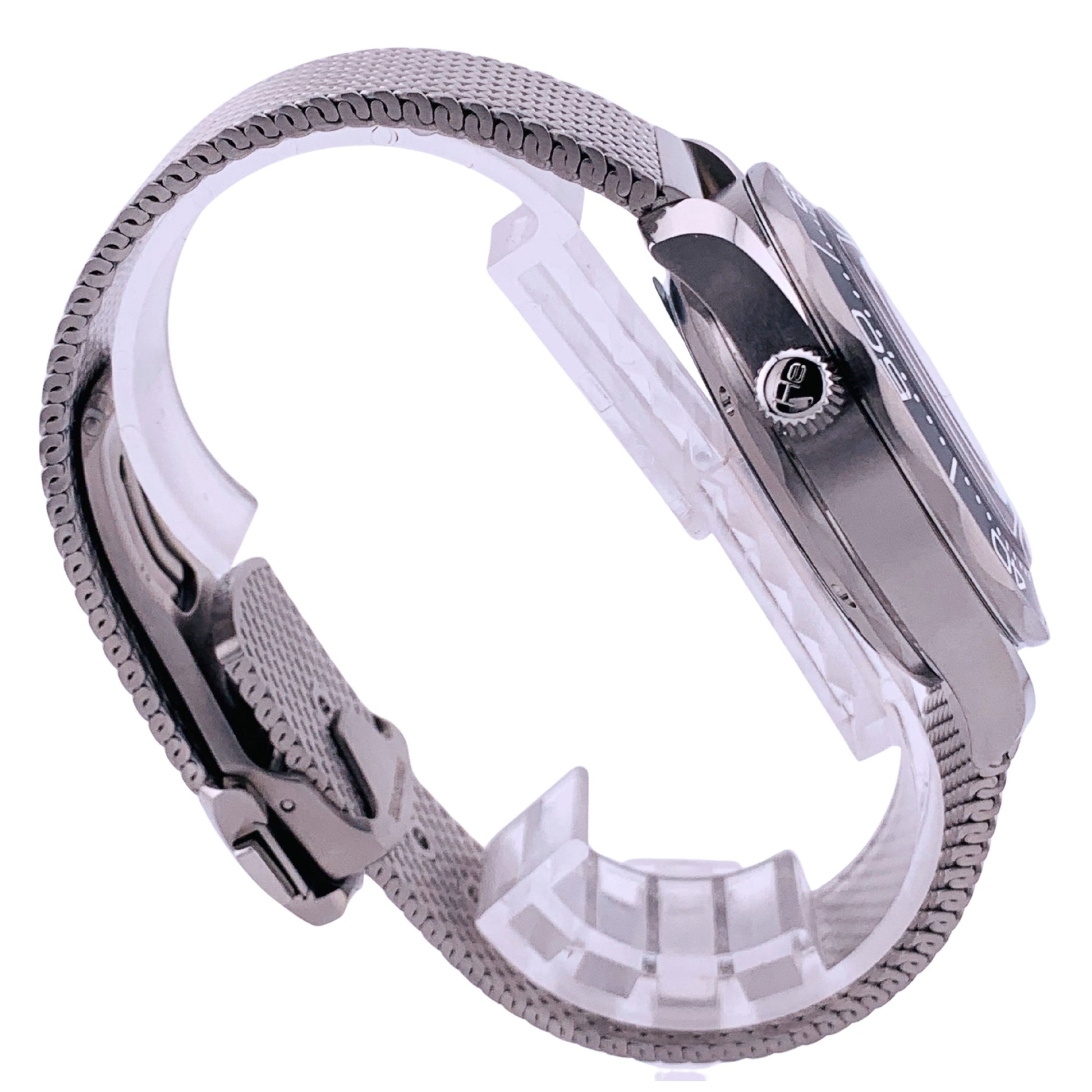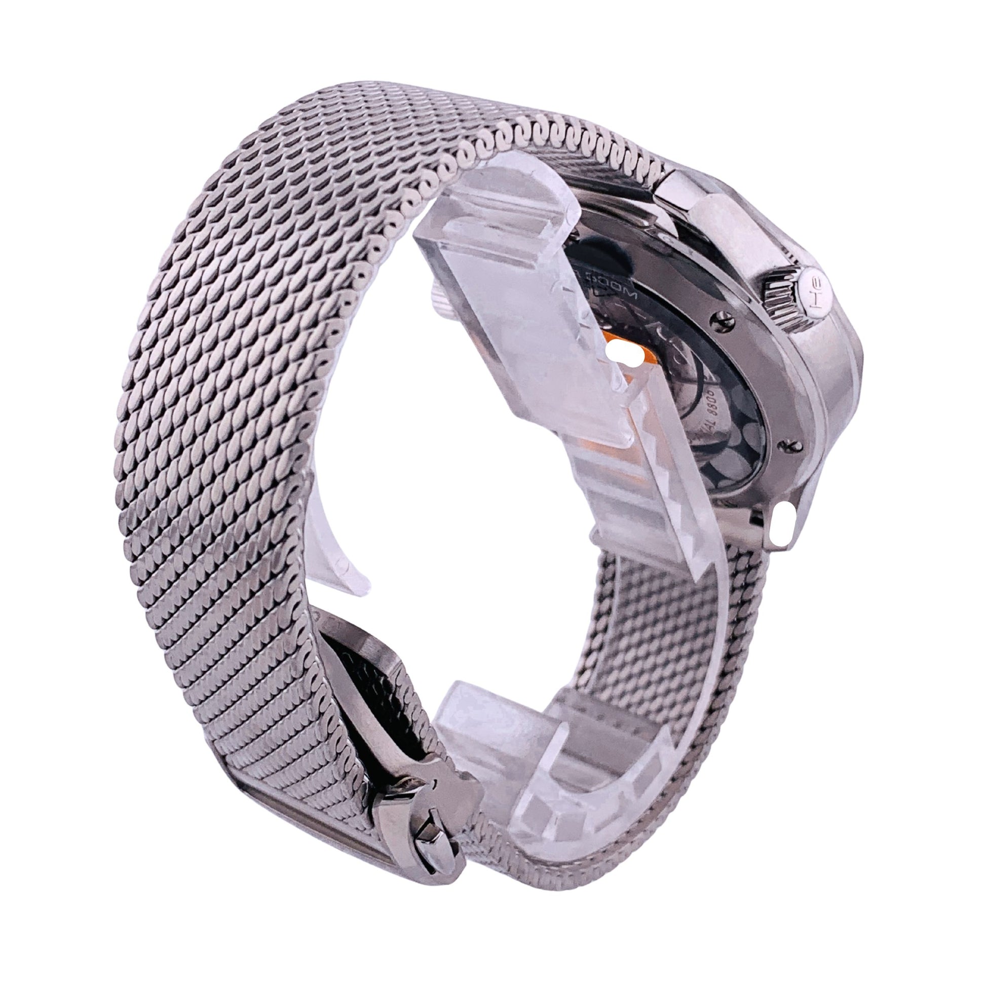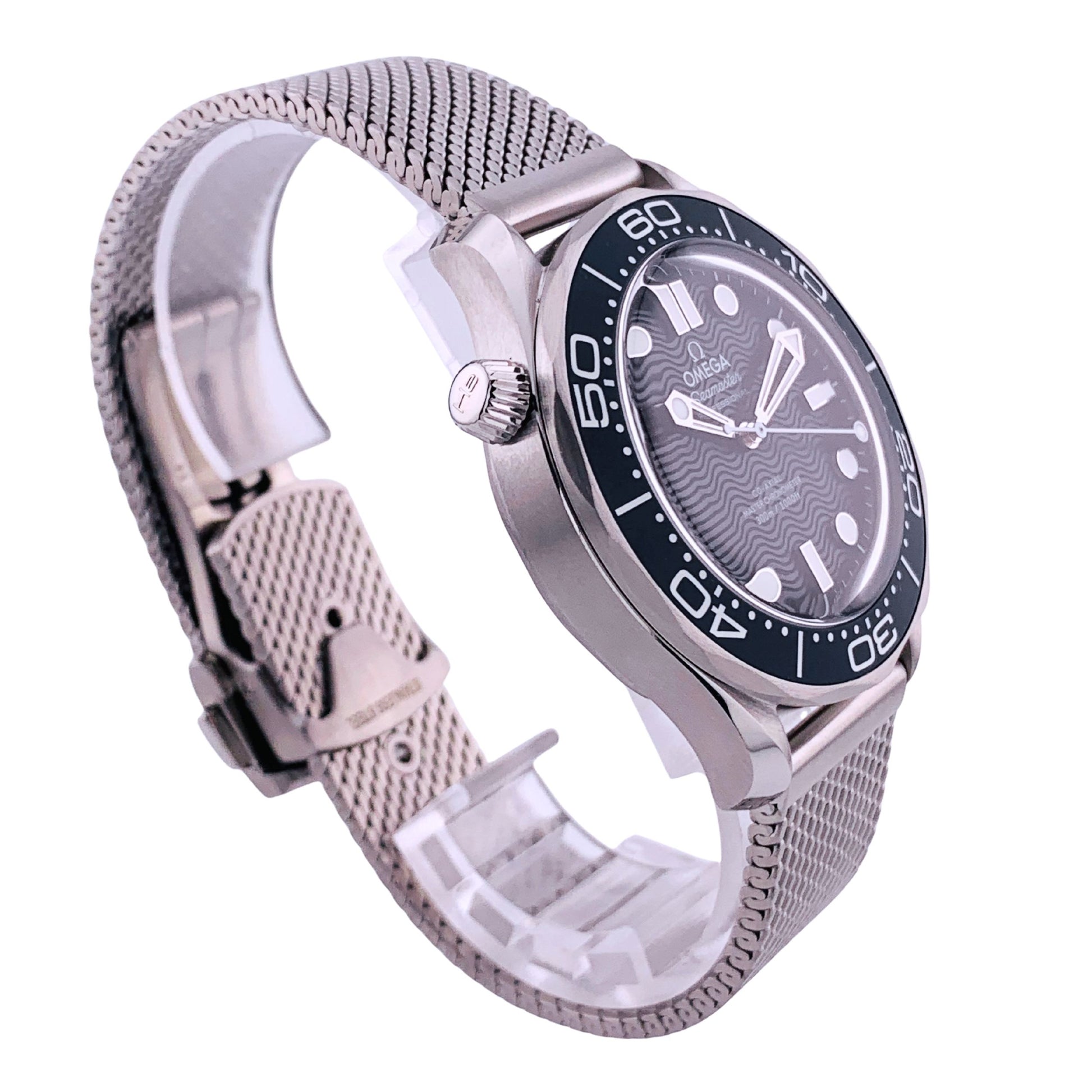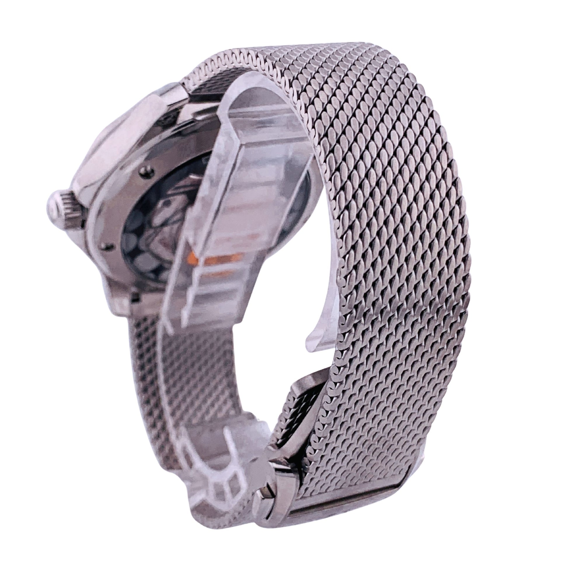 Completing the metallic design of the watch is a brushed stainless steel Milanese mesh bracelet—a refined tribute to the titanium watch worn by the secret agent in No Time To Die.