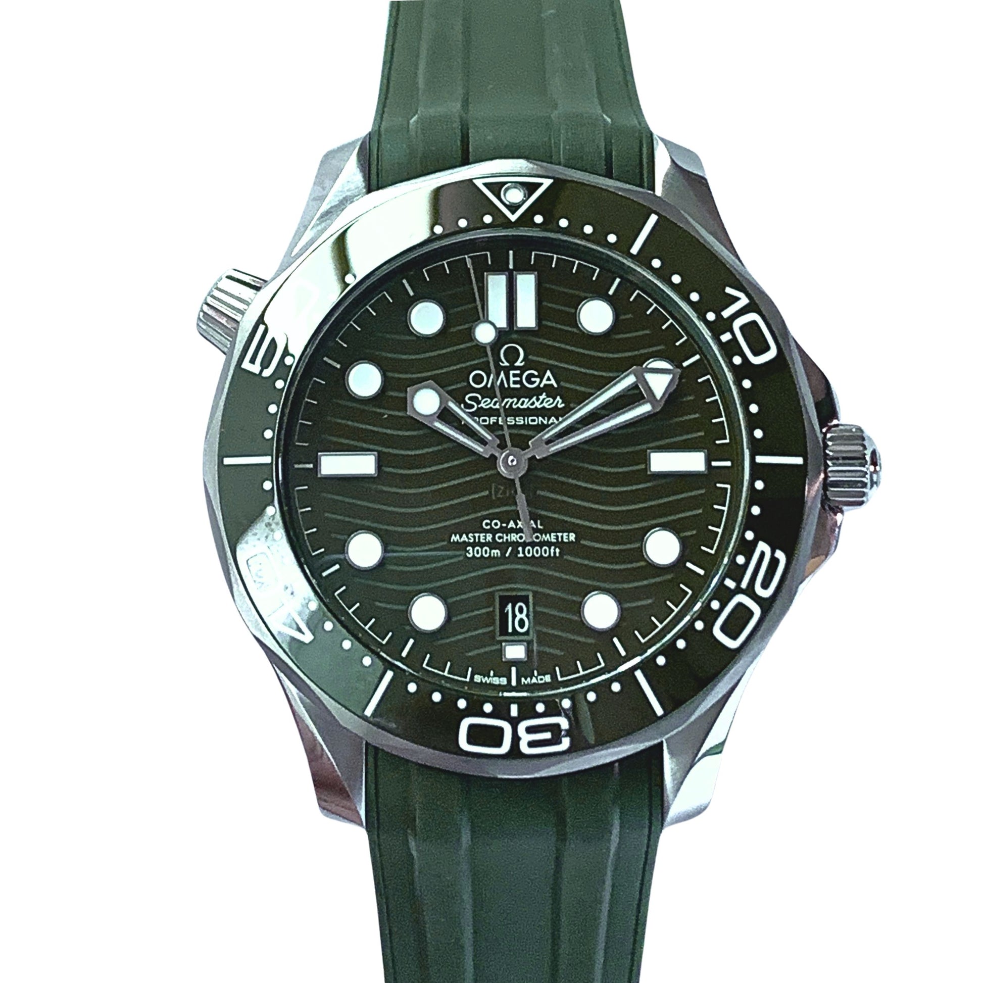 New O21032422010001, full set, Year 2025. Omega Seamaster Diver 300M Co‑Axial Master Chronometer 42mm (Ref. O21032422010001 This full-set 2025 Omega Seamaster Diver 300M features a green ceramic dial and comes with a matching green rubber strap, providing a fresh and modern look. The 42mm stainless steel case is paired with a ceramic bezel, featuring a diving scale in white enamel. The dial is laser-engraved with the signature wave pattern, staying true to the maritime heritage of the Seamaster collection. The watch is powered by the Omega Co‑Axial Master Chronometer Calibre 8800, offering exceptional precision, anti-magnetic properties, and a power reserve of 55 hours. The blackened hands and indexes are filled with Super-LumiNova, ensuring legibility in all conditions The transparent sapphire crystal caseback reveals the intricate movement, allowing a view of the high-quality craftsmanship that Omega is known for. This model is water-resistant up to 300 meters (1000 feet) and is perfectly suited for both everyday wear and professional diving. The full set includes the original Omega box, warranty, and authenticity documents. ref 210.32.42.20.10.001 -Box. 94100301