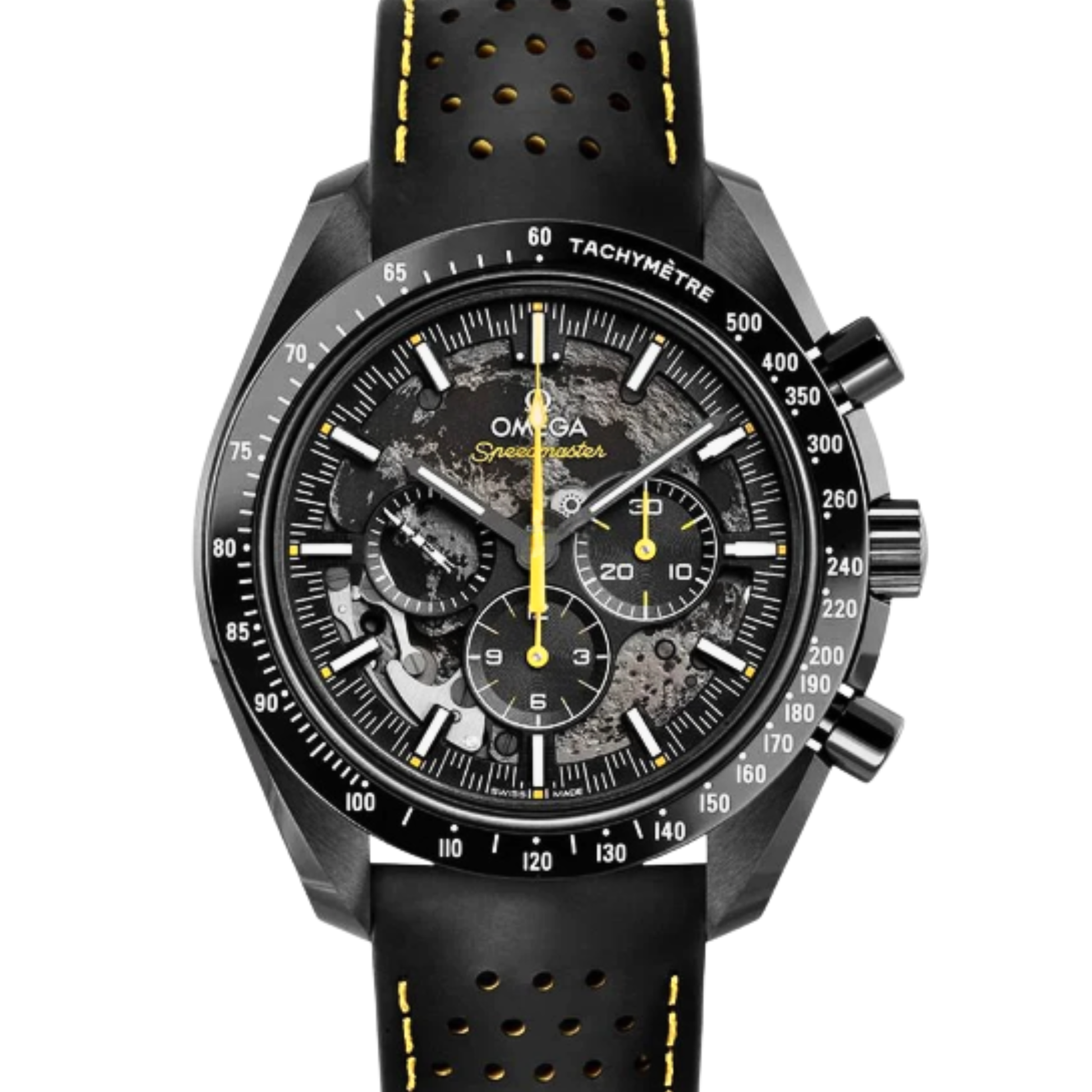 The OMEGA Speedmaster Dark Side of the Moon Apollo 8 is a striking timepiece crafted in black ceramic, featuring a 44.25 mm case paired with a matching black rubber strap for a bold yet comfortable look. Inspired by the historic Apollo 8 mission, this model is powered by the manually wound OMEGA 3869 calibre, a Master Chronometer movement certified by METAS and resistant to magnetic fields up to 15,000 gauss. The intricate laser-engraved details on the blackened main plate and bridges evoke the moon’s surface with impressive precision and depth. The sapphire crystal is scratch-resistant and treated with anti-reflective coating on both sides, ensuring clarity and durability. The transparent caseback reveals the beautifully decorated movement, including components finished in contrasting shades of grey and gold. With a power reserve of 50 hours and water resistance up to 50 meters, this chronograph combines cutting-edge technology with a timeless design that pays tribute to lunar exploration.