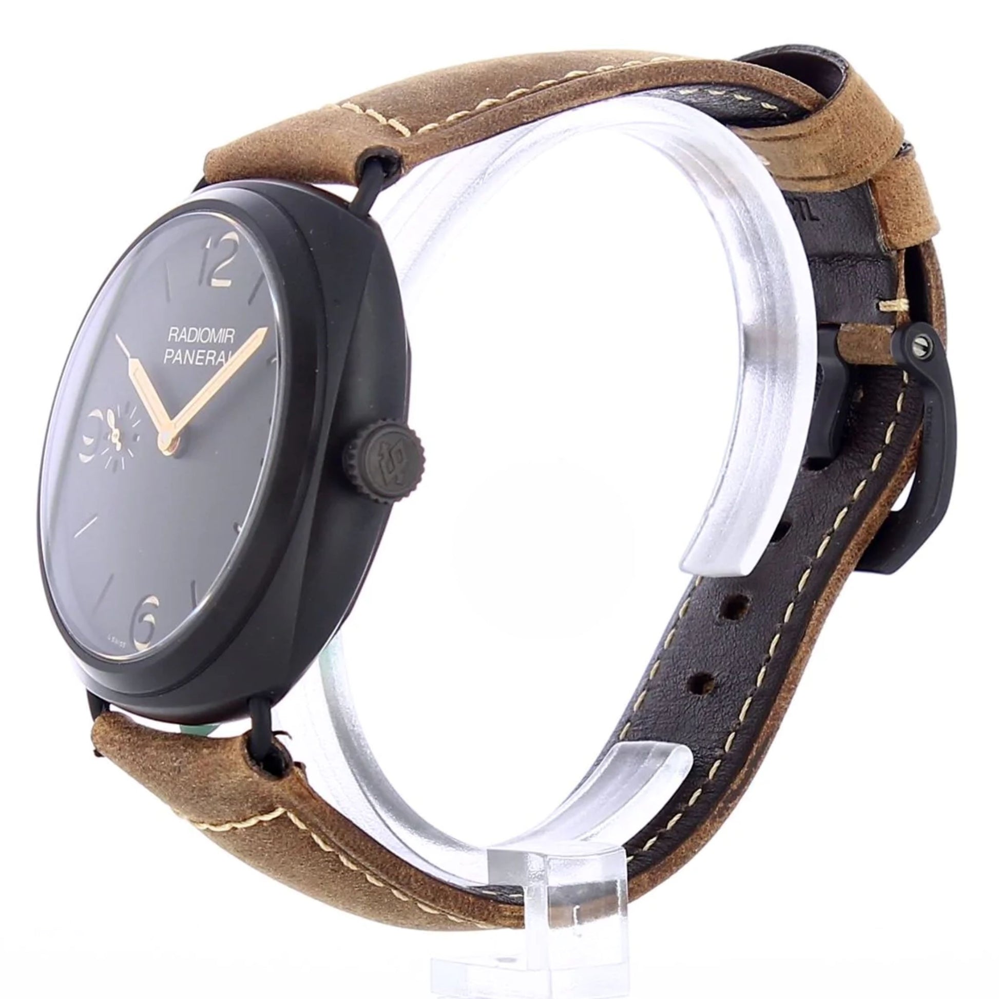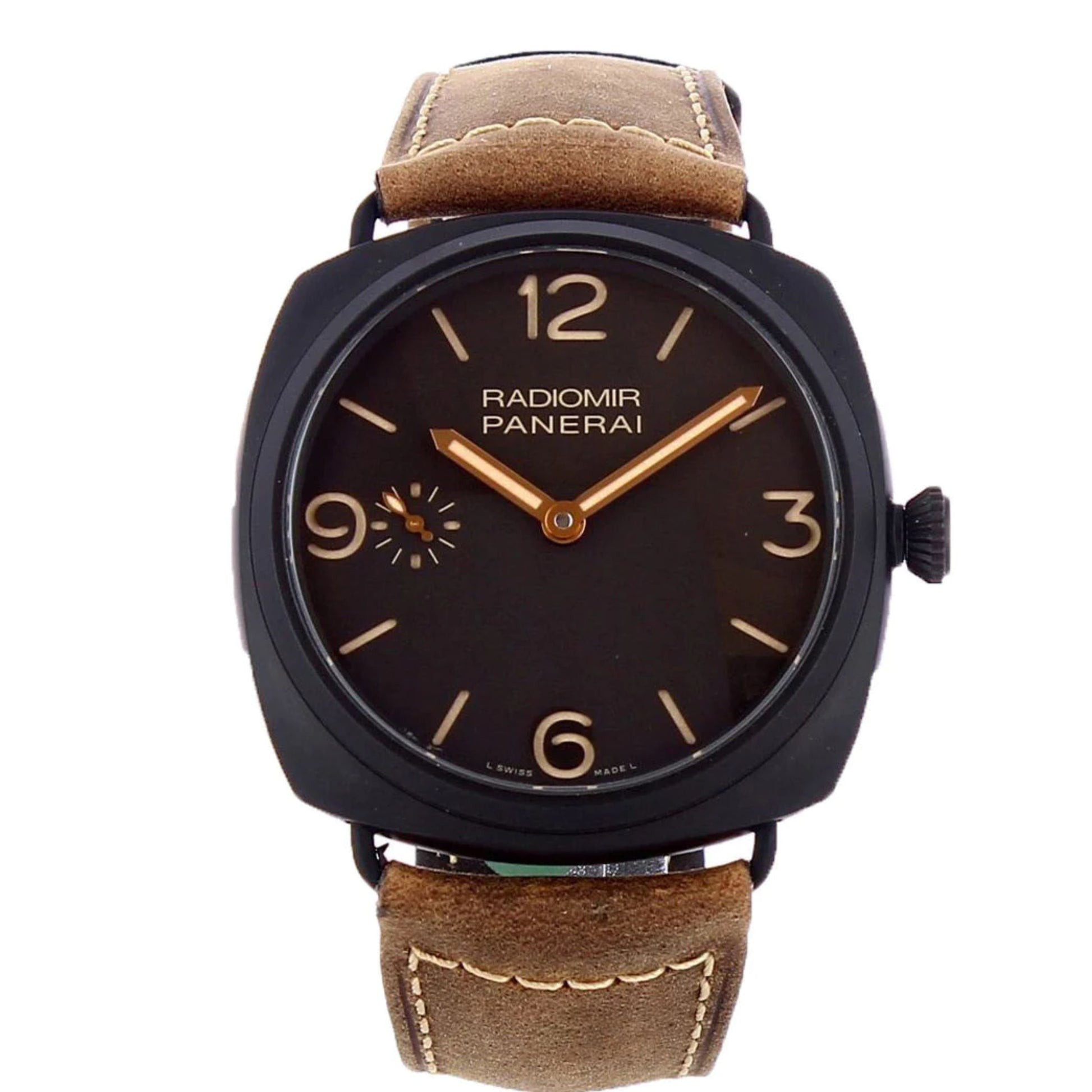 The Panerai Radiomir Composite 3 Days PAM00504 has a 47mm case made of brown ceramic, something not often seen. It is powered by caliber P.3000, an hand wound movement with three days of power reserve. The P.3000 calibre, created entirely at the Panerai Manufacture, presents the main characteristics of the Panerai movements in terms of structure and robustness, accuracy and power reserve. Brown composite ceramic case with a brown leather strap. Fixed brown composite ceramic bezel. Brown dial with luminous hands and index hour markers. Arabic numerals mark the 3, 6, 9 and 12 o'clock positions. Small seconds sub dial at the 9 o'clock position. Mechanical movement with a 72 hour power reserve. Scratch resistant sapphire crystal. Screw down crown. Transparent case back. Tang clasp. Ref. 504