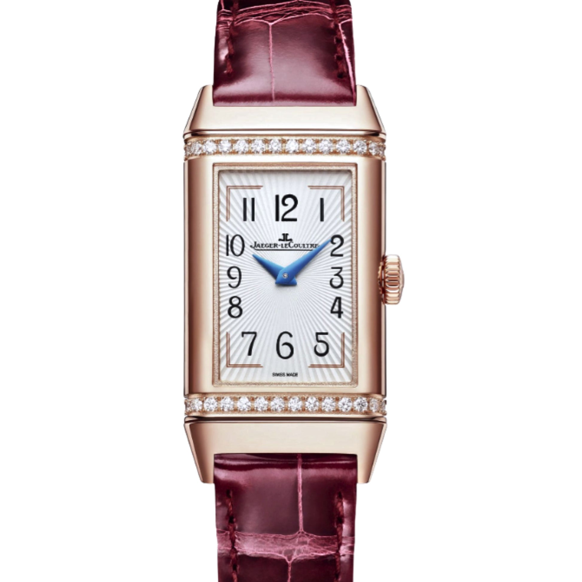 The Reverso One Duetto revisits the codes of the first feminine Reverso models, emblematic of the Art Deco style: a rectangular and elongated case, dials with contrasting aesthetics, a double set of hands turning in opposite directions while indicating the same time, gadroons adorned with two rows of brilliant-cut diamonds, alligator leather strap... On the verso of the watch, the burgundy, glitter-lacquered dial highlights the elongated hour markers, which beam like rays of sunlight. Wearable on any occasion, this model combines inimitable style with refined femininity.