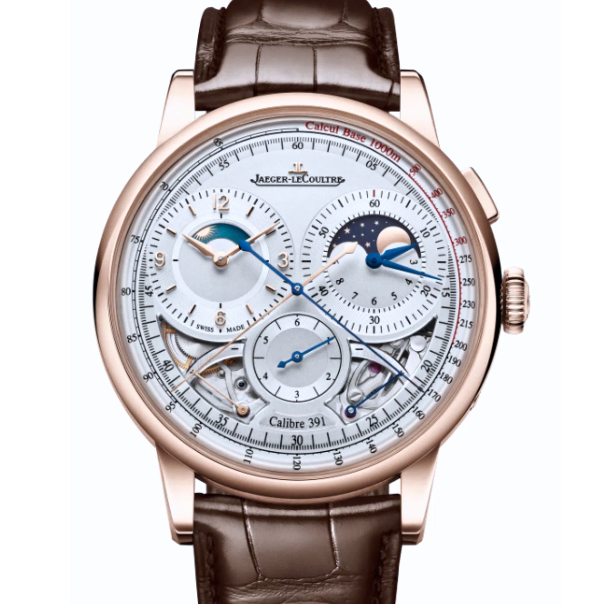 The sectorized dial of the Duometre Chronograph Moon is extremely legible in terms of both design and function: moon phase on the chronograph counter, whose monopusher triggers start/stop/reset, day/night indicator on the left-hand hour counter, power reserves on either side of the seconde foudroyante at 6 o’clock. At the heart of this complication watch beats the Calibre 391, distinguished by its independent twin barrels and gear trains: one dedicated to the hour/minute indication, the other to complications. Offering different levels of finishing, Calibre 391 is a watchmaking spectacle to be admired under the sapphire crystal on the back of the timepiece.