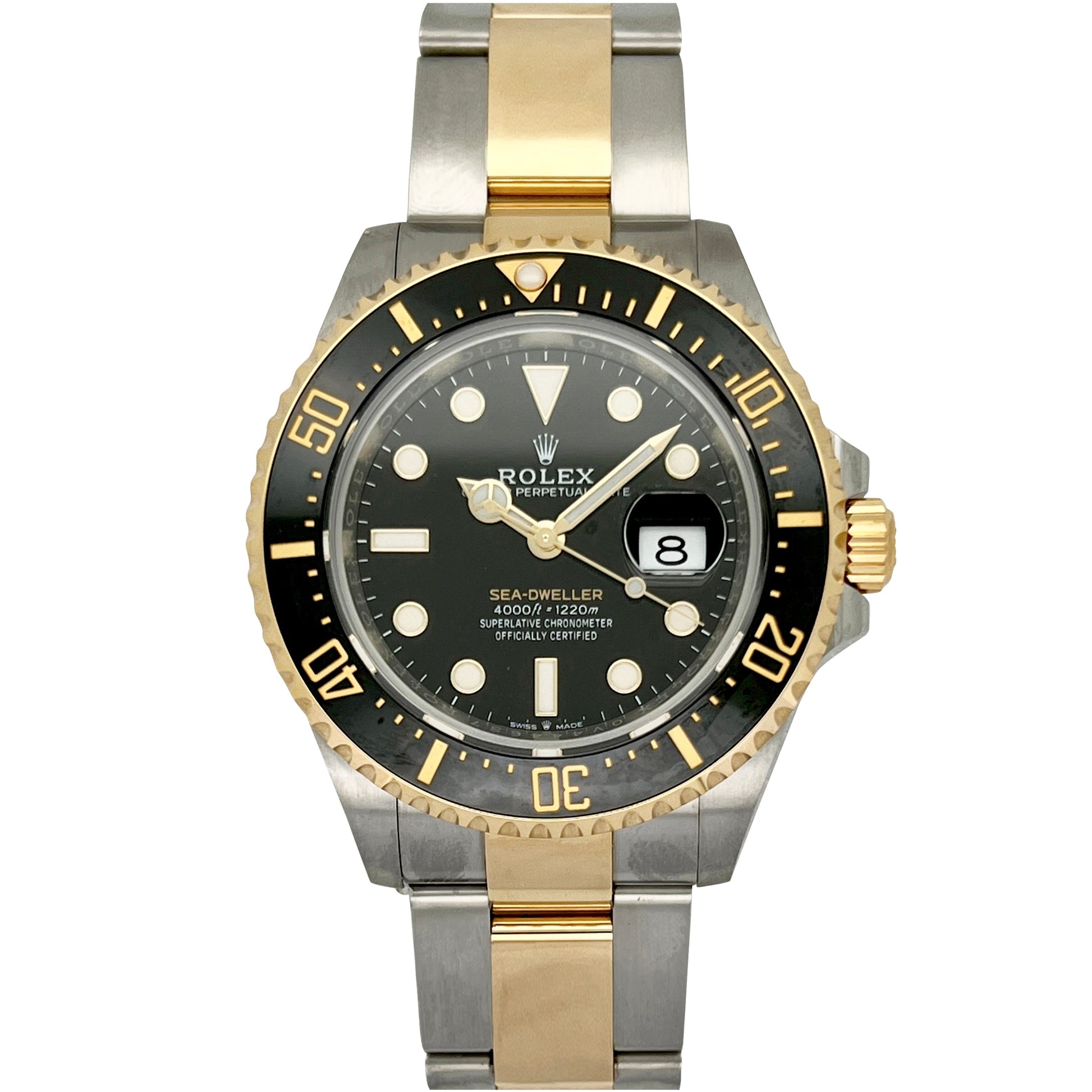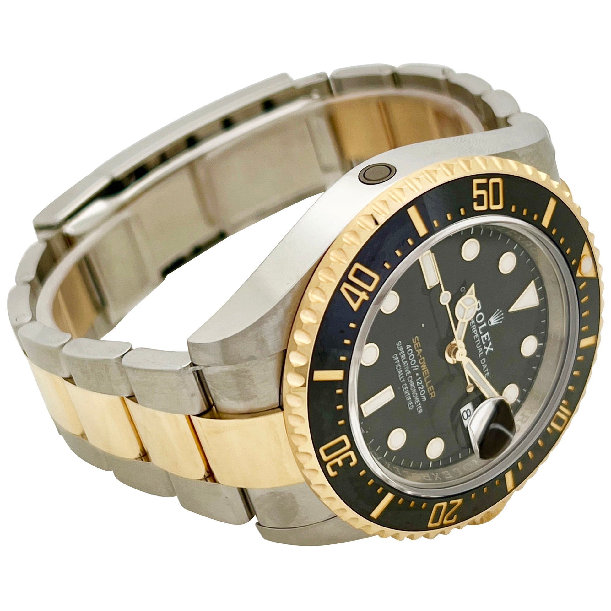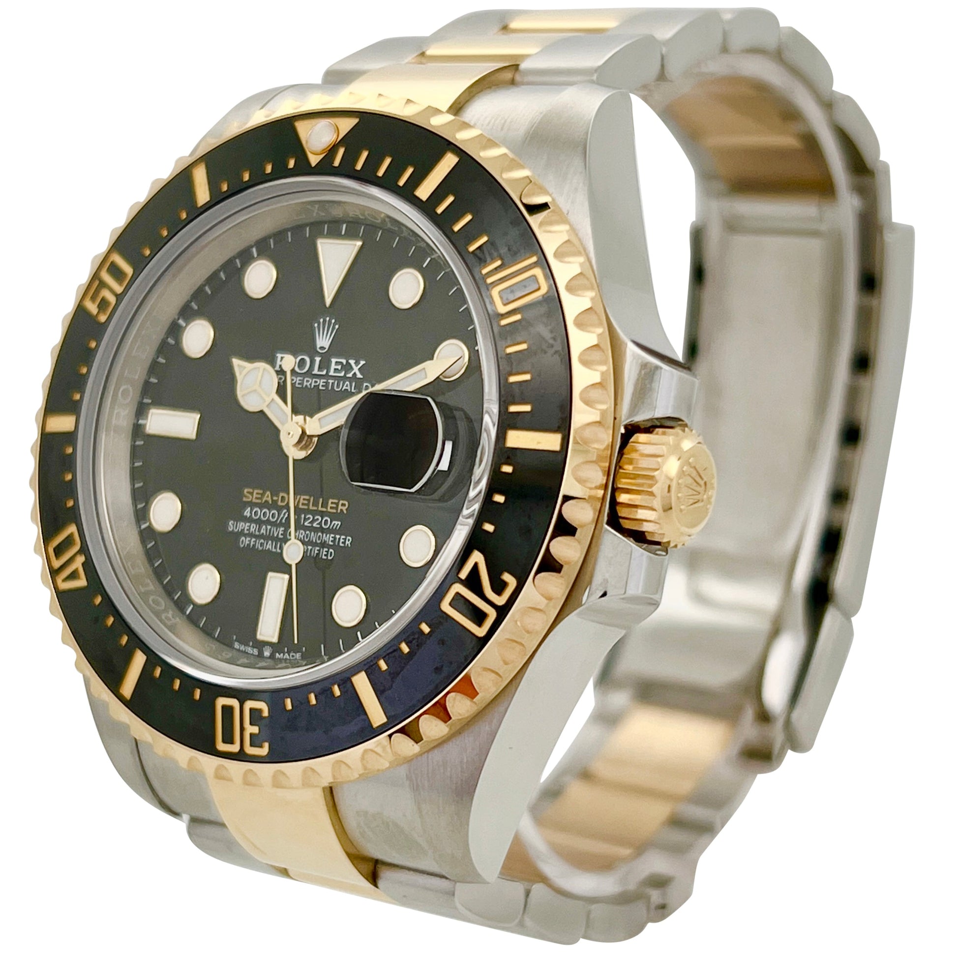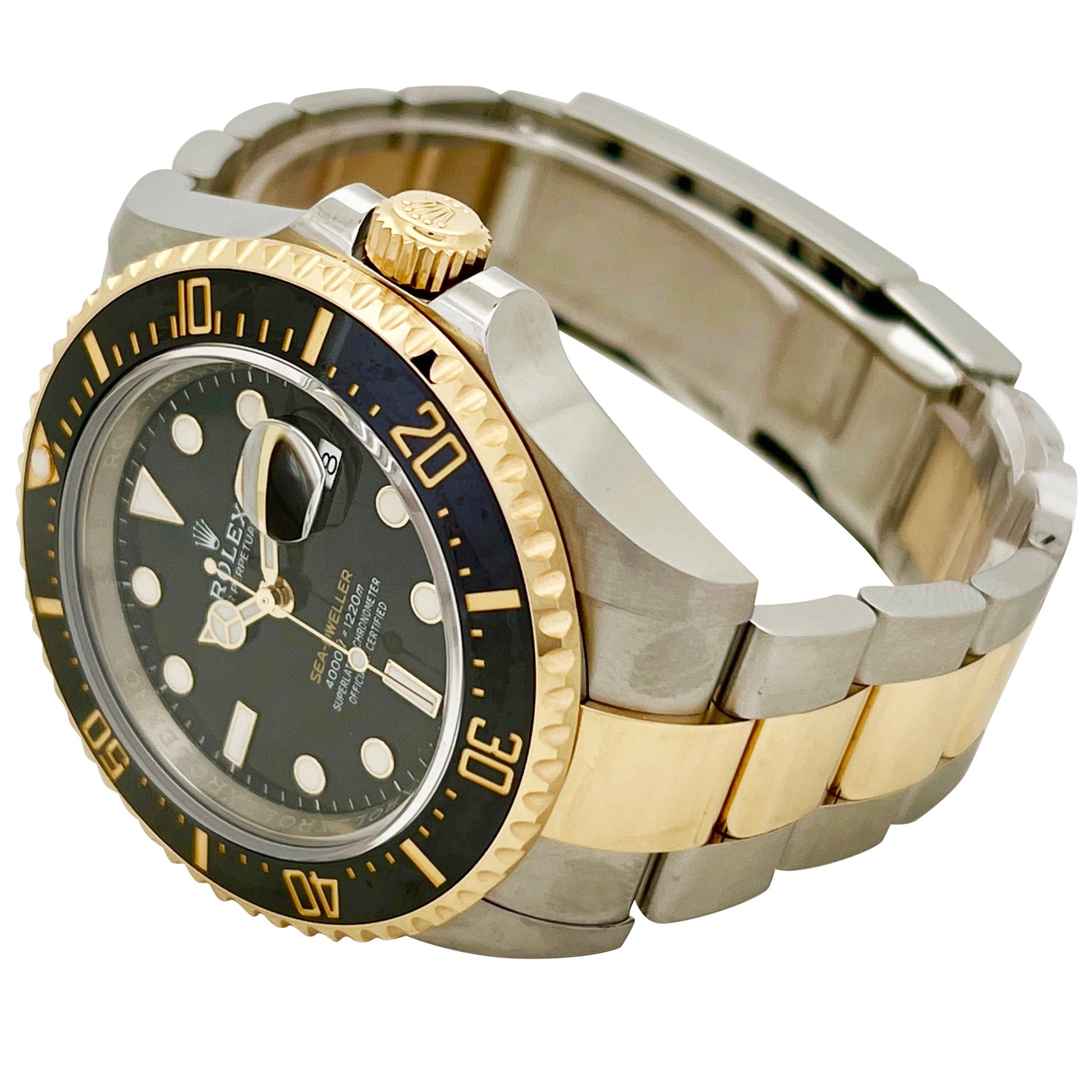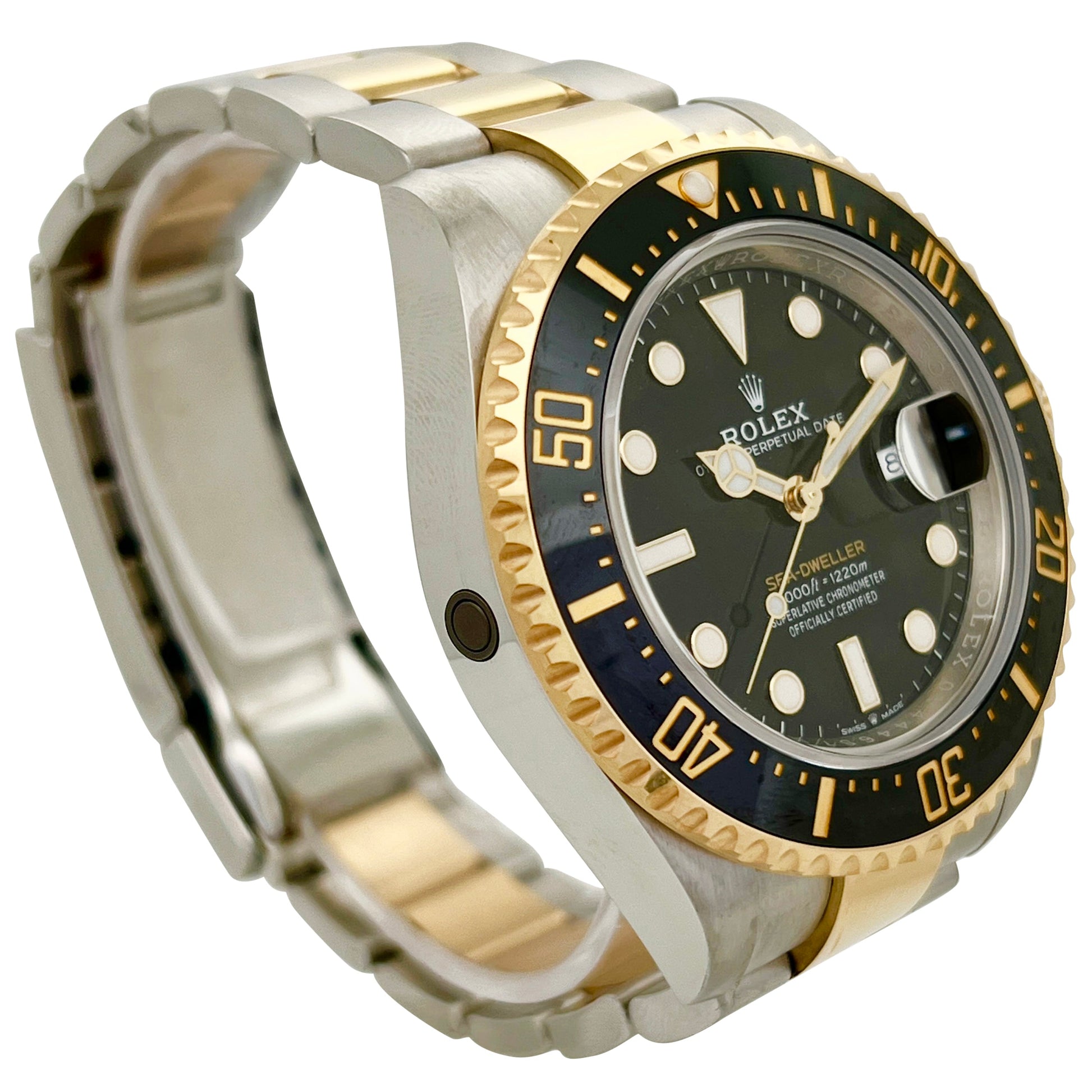 This Seadweller Deep Sea has a stainless steel and yellow gold (Rolesor) case and Oyster bracelet. Unidirectional rotating black ceramic bezel. Black dial with luminous hands and index hours marker. Date at the 3 o'clock position. Rolex caliber 3235 has a power reserve of 70 hours. Black dial.