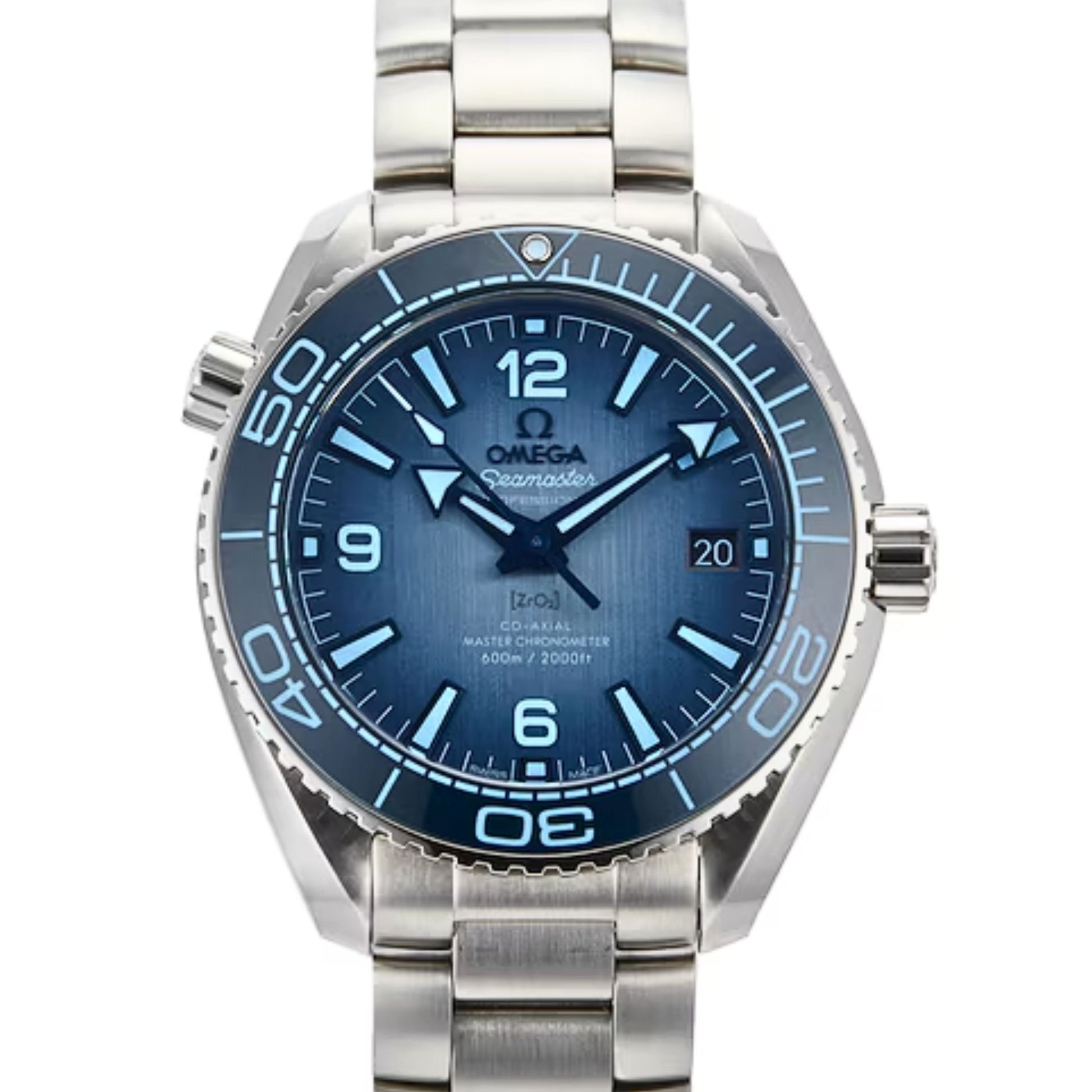 The vertical brushed ceramic dial in OMEGA’s own Summer Blue is PVD treated and varnished with a gradient finish to reflect the watch’s level of water resistance. A blue ceramic bezel with light blue diving scale encircles the bold display, which includes blued hands and indexes filled with a unique light blue Super-LumiNova.