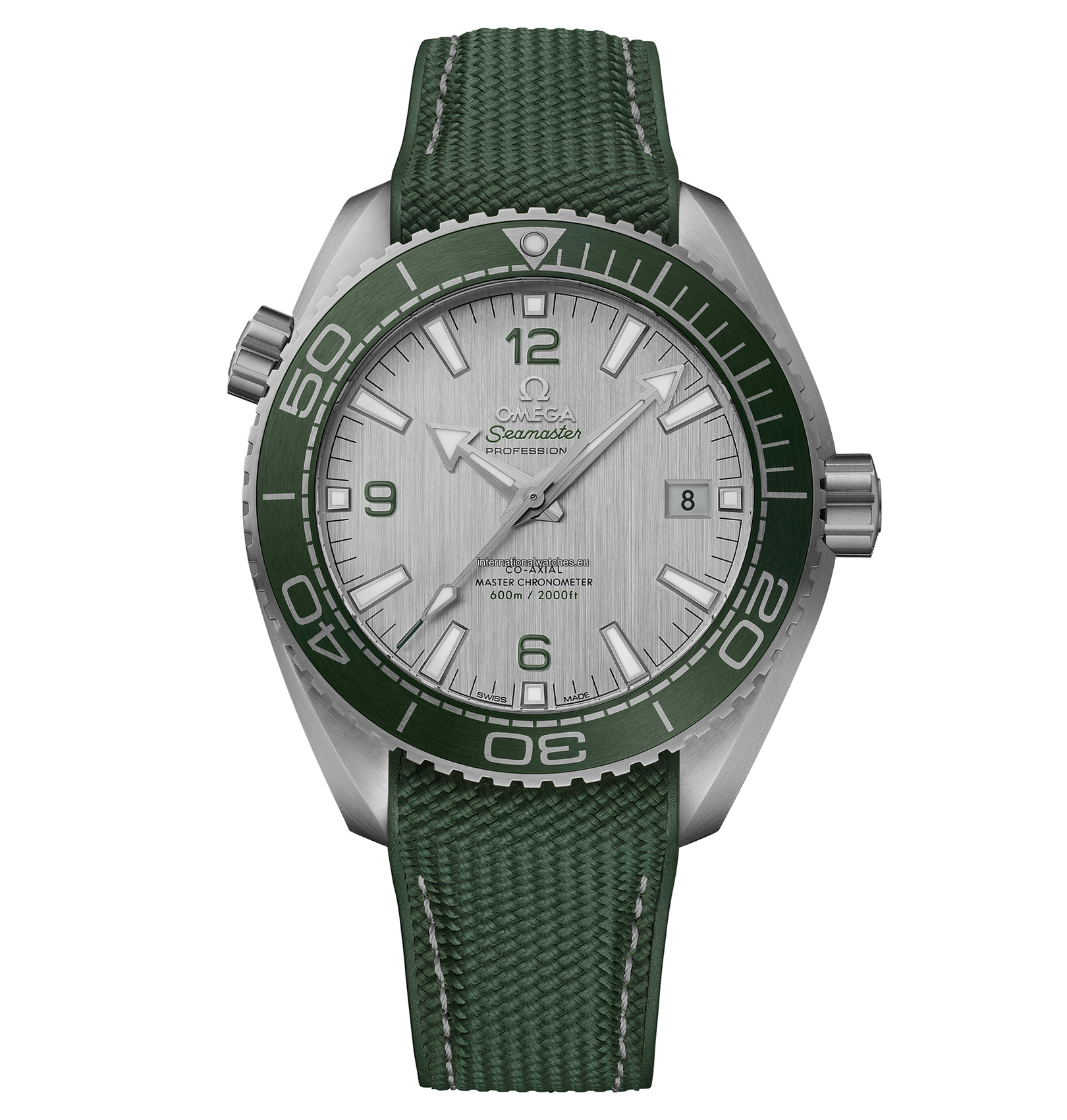 The dial is presented in brushed stainless steel and includes a date window at 3 o’clock, green varnished Arabic numerals, and transferred words in green and black. The OMEGA logo, hands, and hour markers are all in PVD stainless steel with a brushed finish, while the white Super-LumiNova improves visibility in dark conditions.
