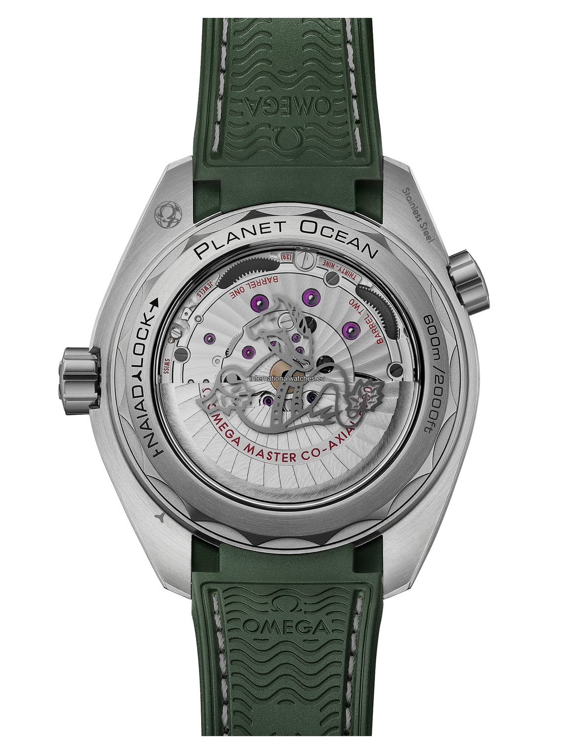 Powered by the Co-Axial Master Chronometer Calibre 8900, this Seamaster Planet Ocean is worn on an integrated green rubber strap with a structured pattern and light grey and green stitching. The NAIAD LOCK caseback is completed with a metallized seahorse on the sapphire crystal.