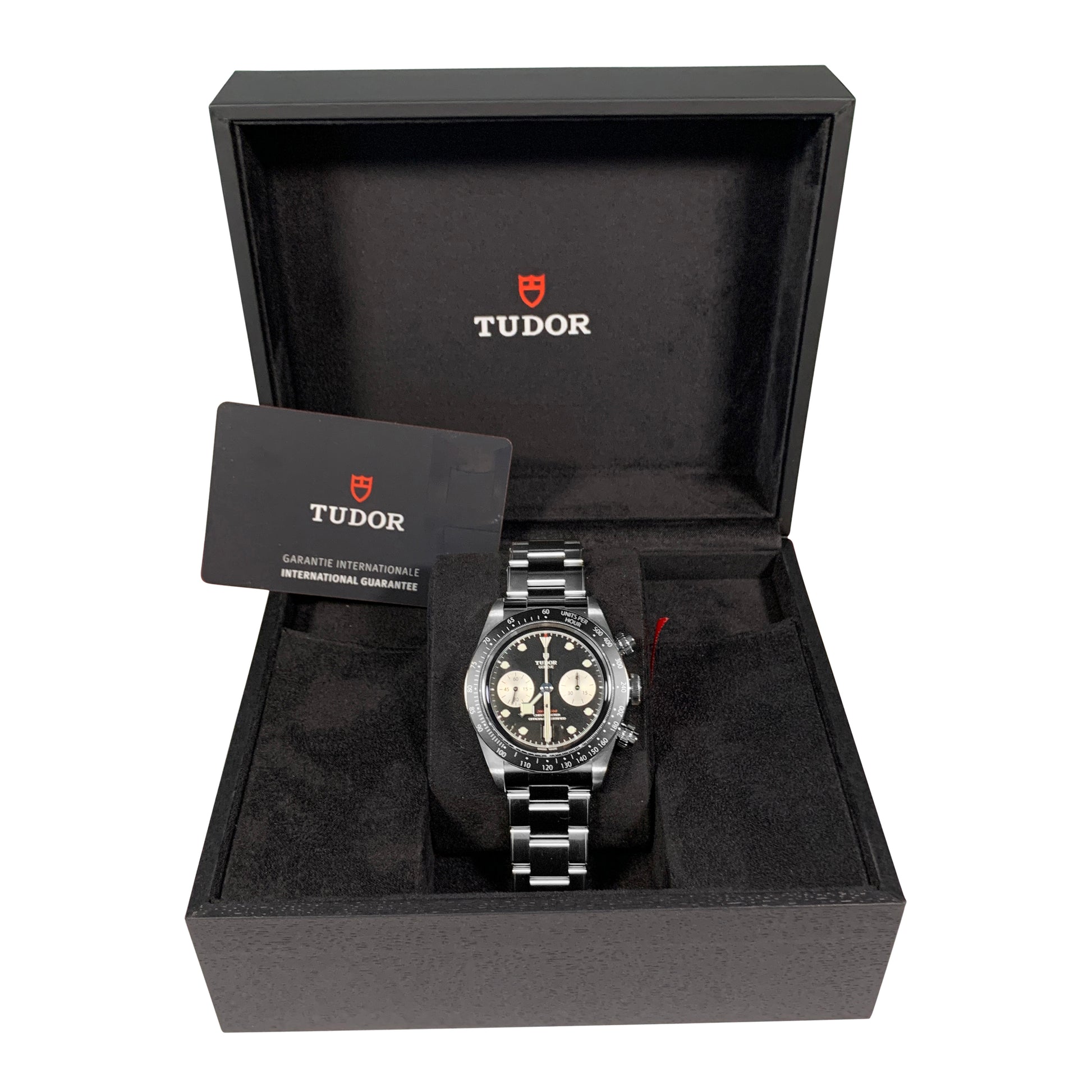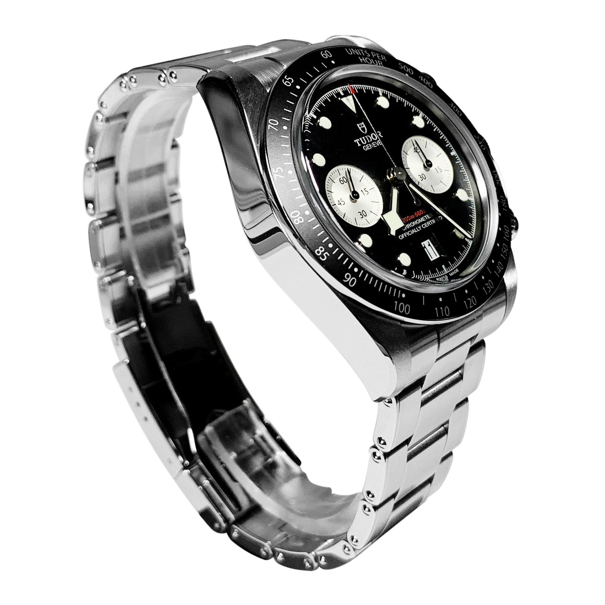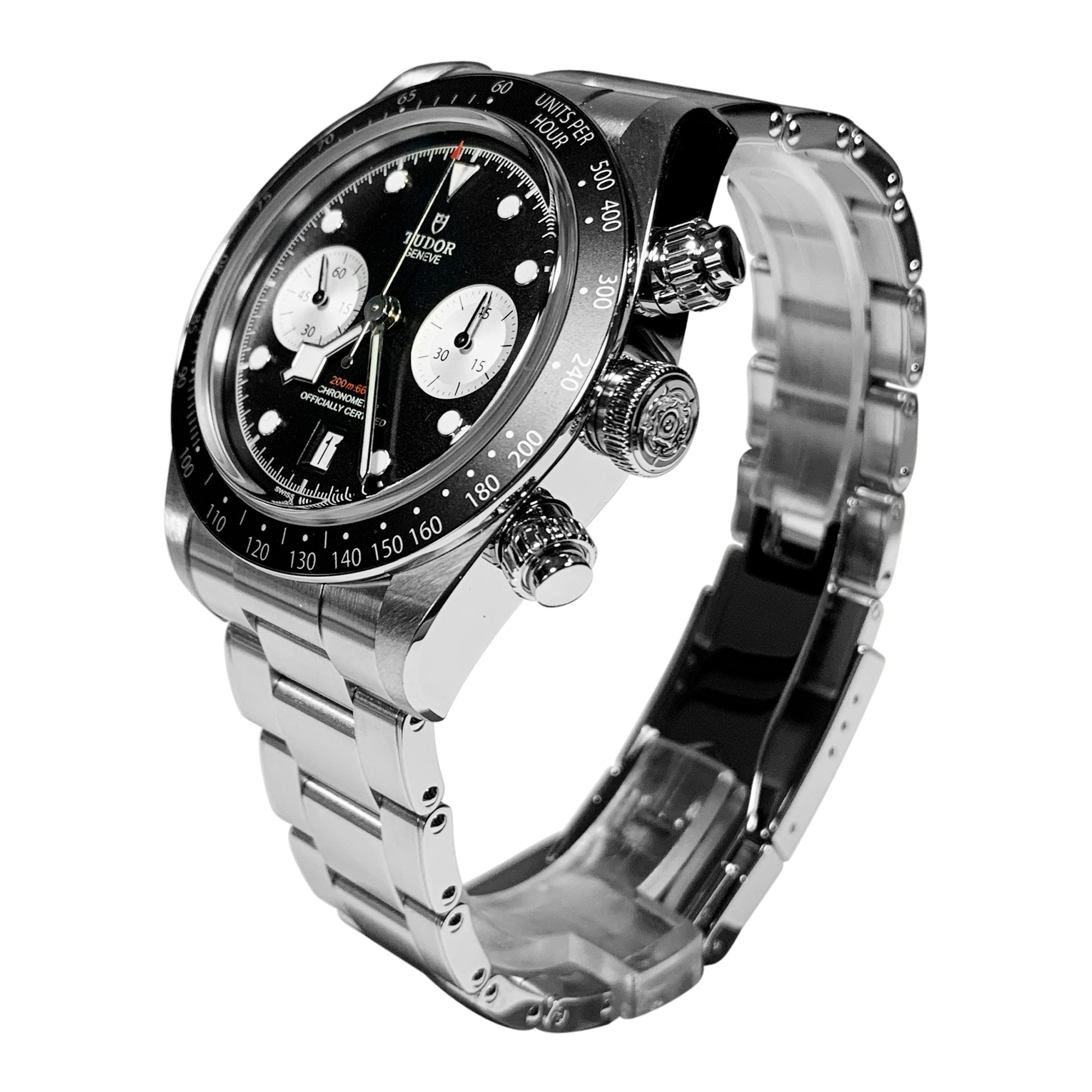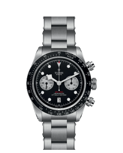 The Black Bay Chrono hybrid watch combines the tradition of Black Bay diving models with the chronograph function typical of the racing world. The characteristics of the Black Bay collection are preserved in the steel case equipped with pushers inspired by the first generation of TUDOR chronographs. A fixed bezel with an engraved tachymeter scale completes the dial of this sporty chronograph.