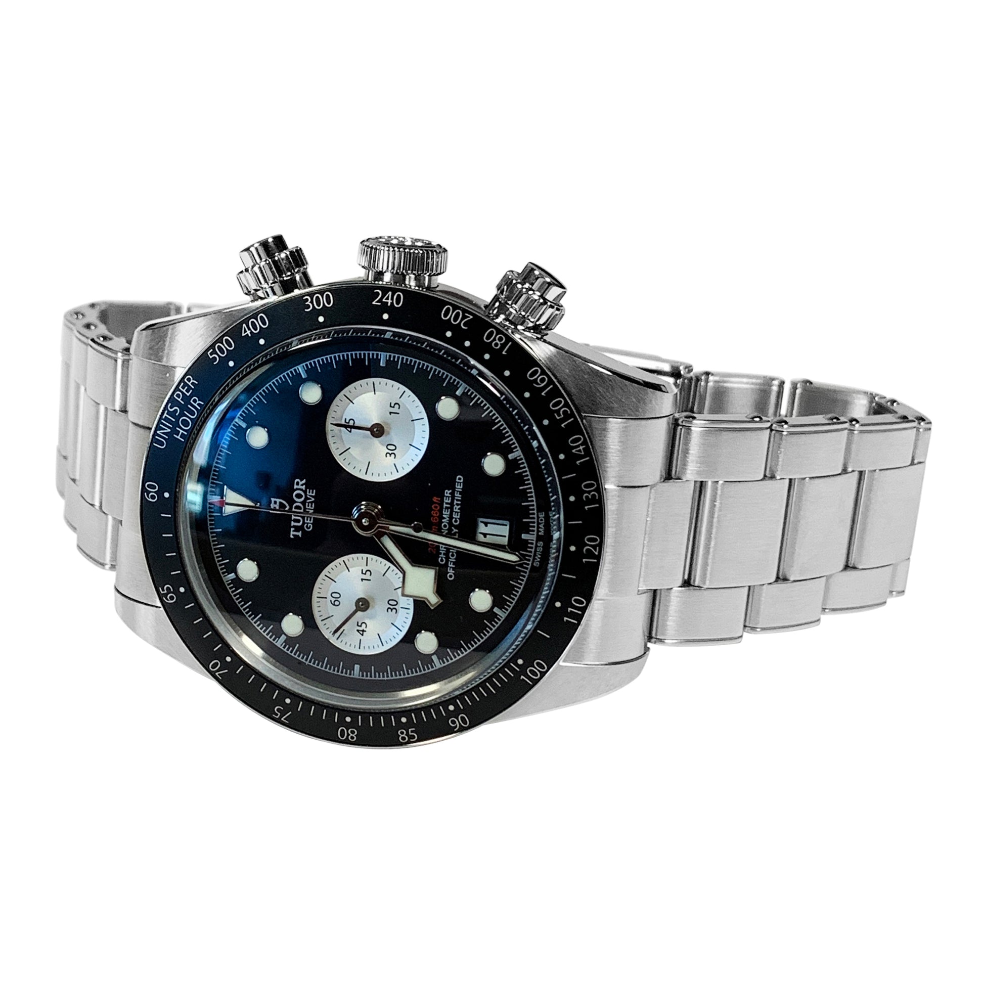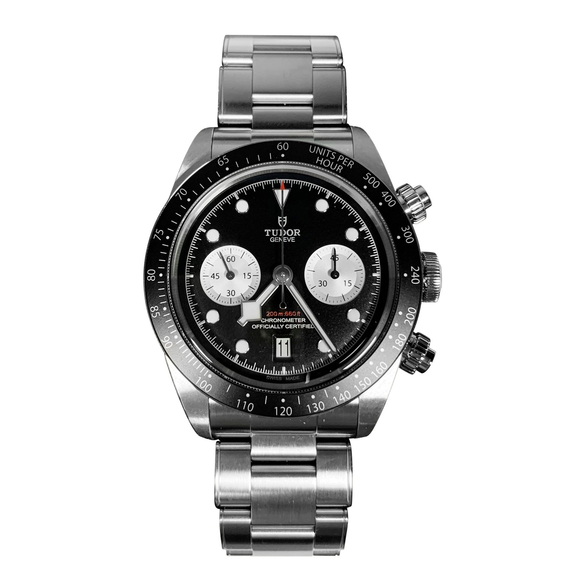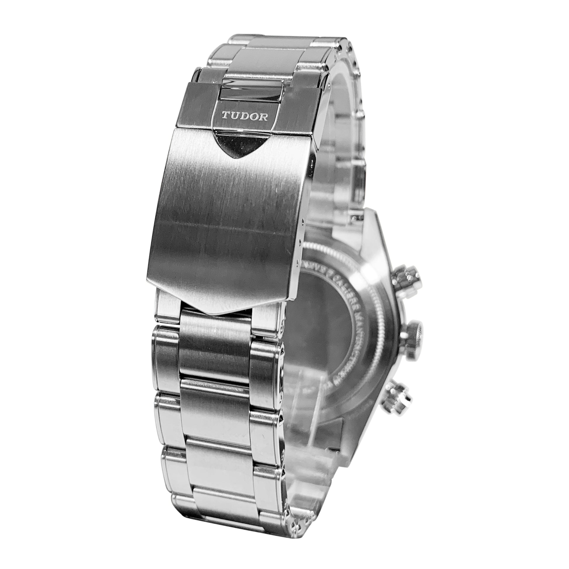 The Black Bay Chrono hybrid watch combines the tradition of Black Bay diving models with the chronograph function typical of the racing world. The characteristics of the Black Bay collection are preserved in the steel case equipped with pushers inspired by the first generation of TUDOR chronographs. A fixed bezel with an engraved tachymeter scale completes the dial of this sporty chronograph.