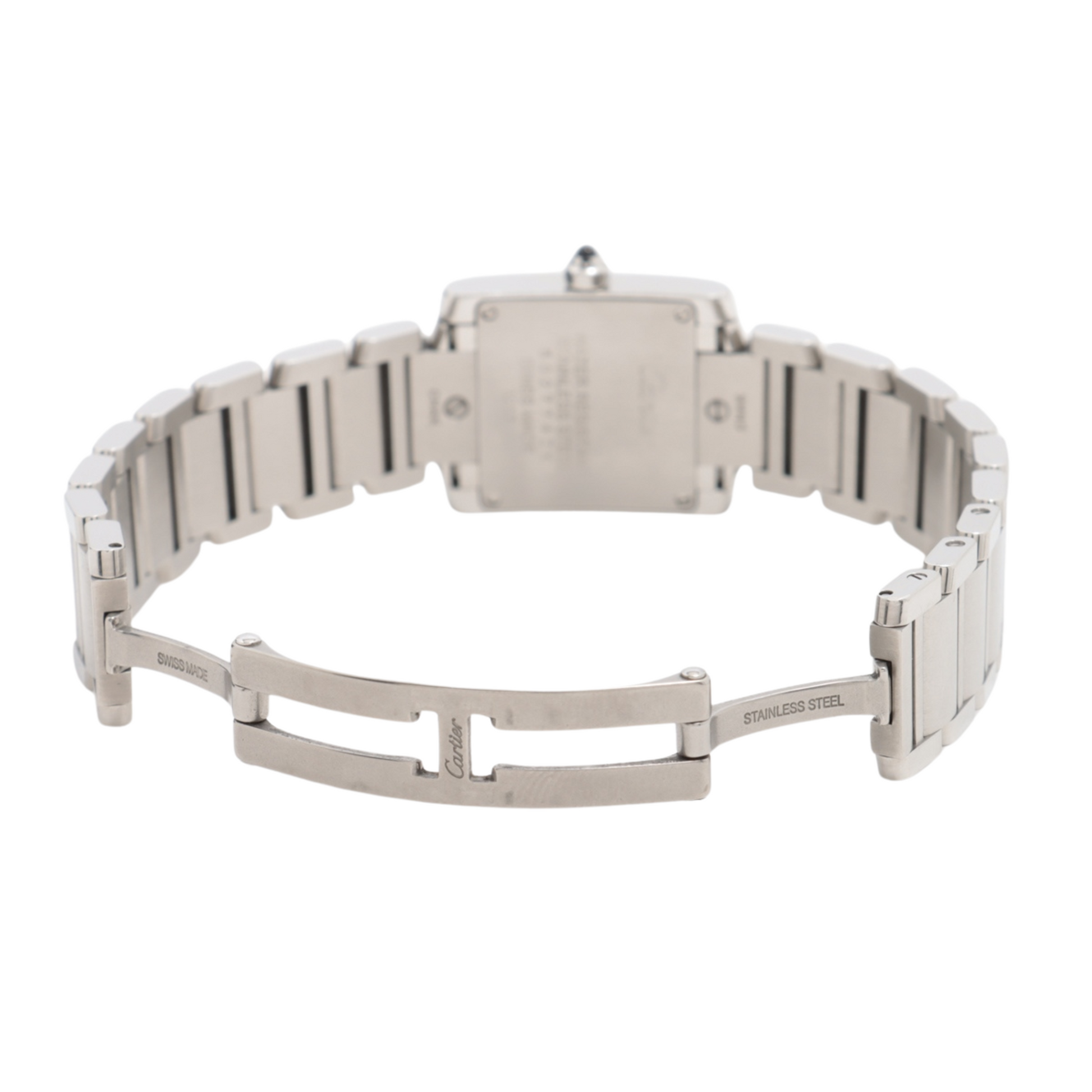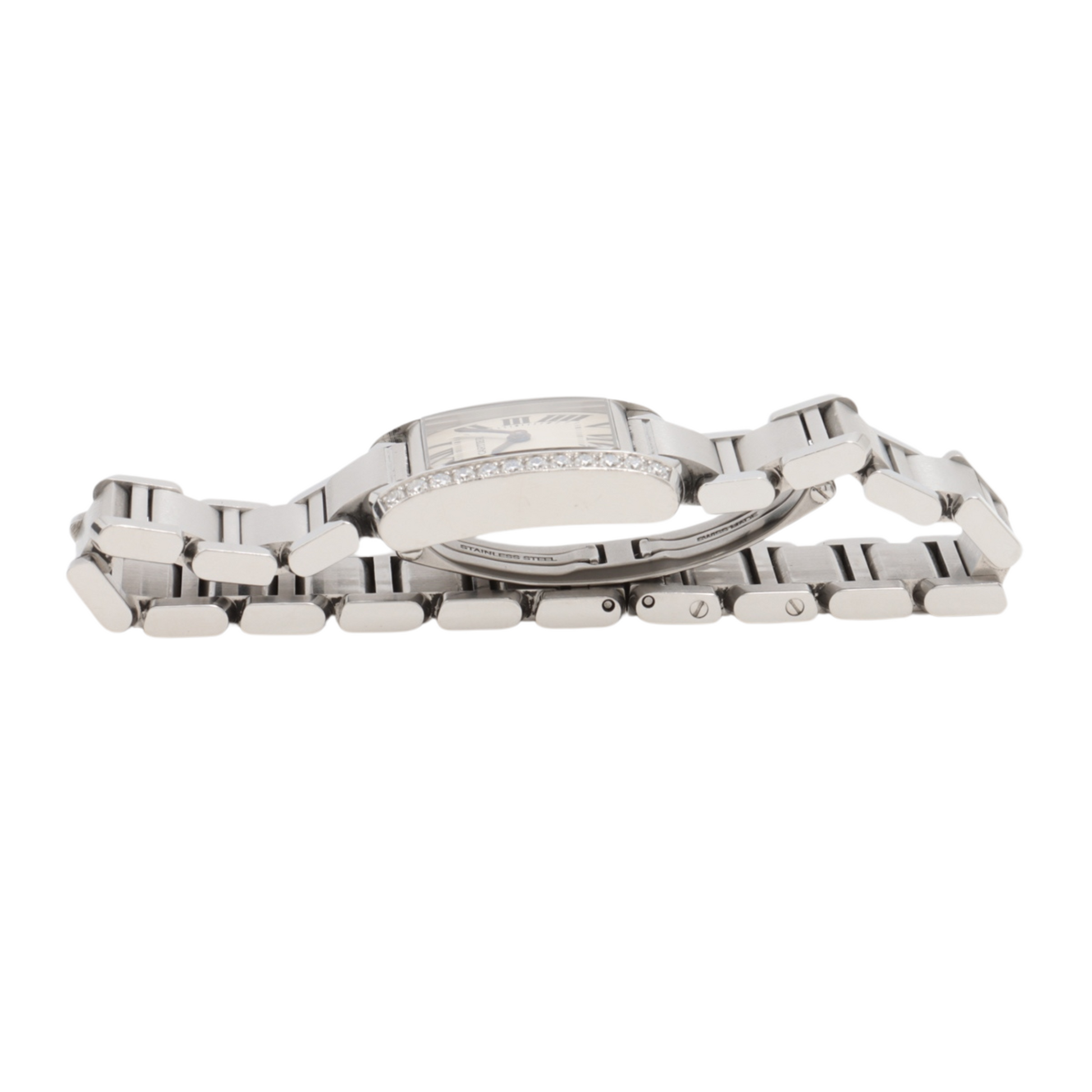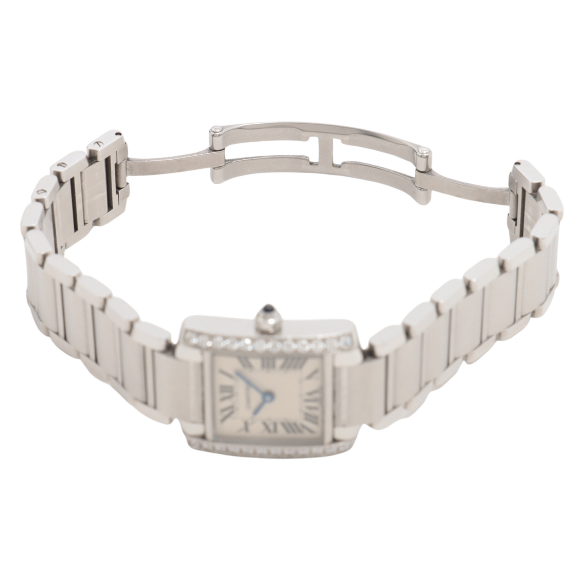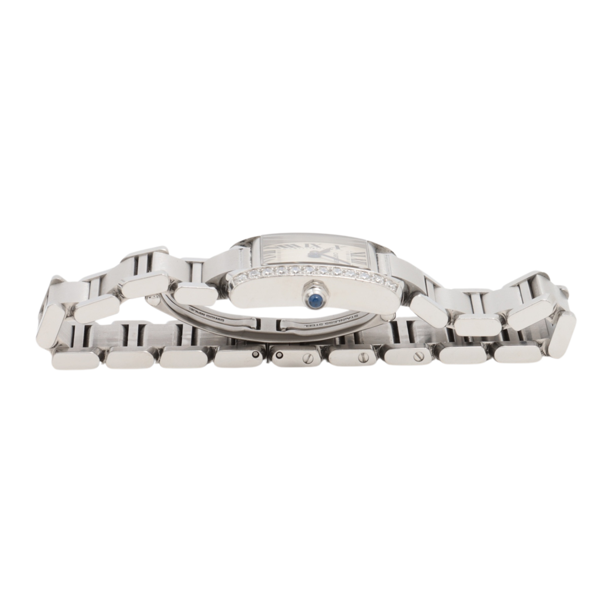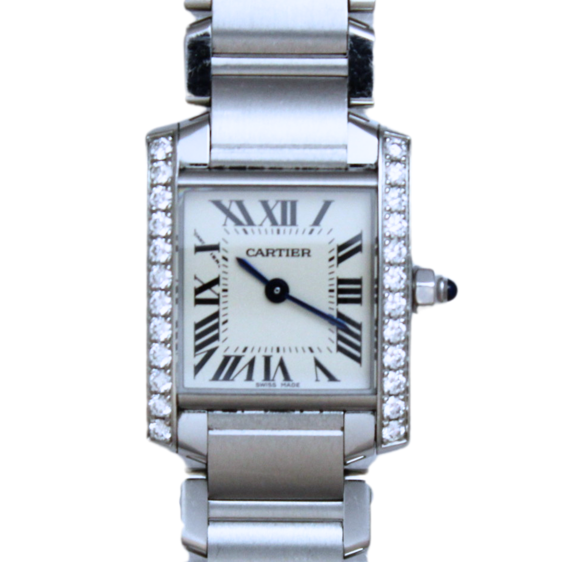 Tank Française watch, small model, quartz movement. Steel case set with 24 brilliant-cut diamonds totalling 0.49 carats. Faceted crown set with a synthetic cabochon-shaped spinel. Silvered dial. Blued-steel sword-shaped hands. Sapphire crystal. Steel bracelet. Case dimensions: 25 mm x 20 mm, thickness: 6.15 mm. Water-resistant to 3 bar. Ref. W4TA0008
