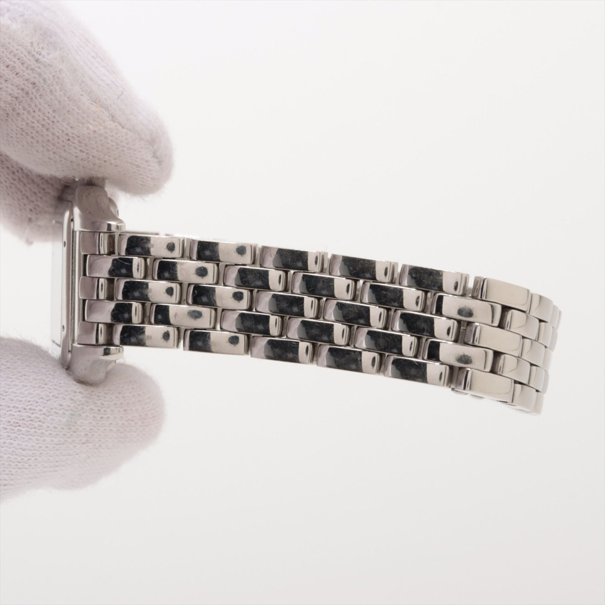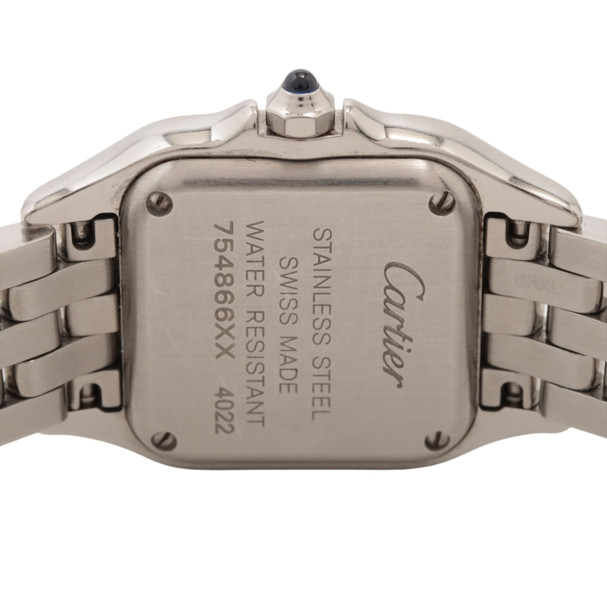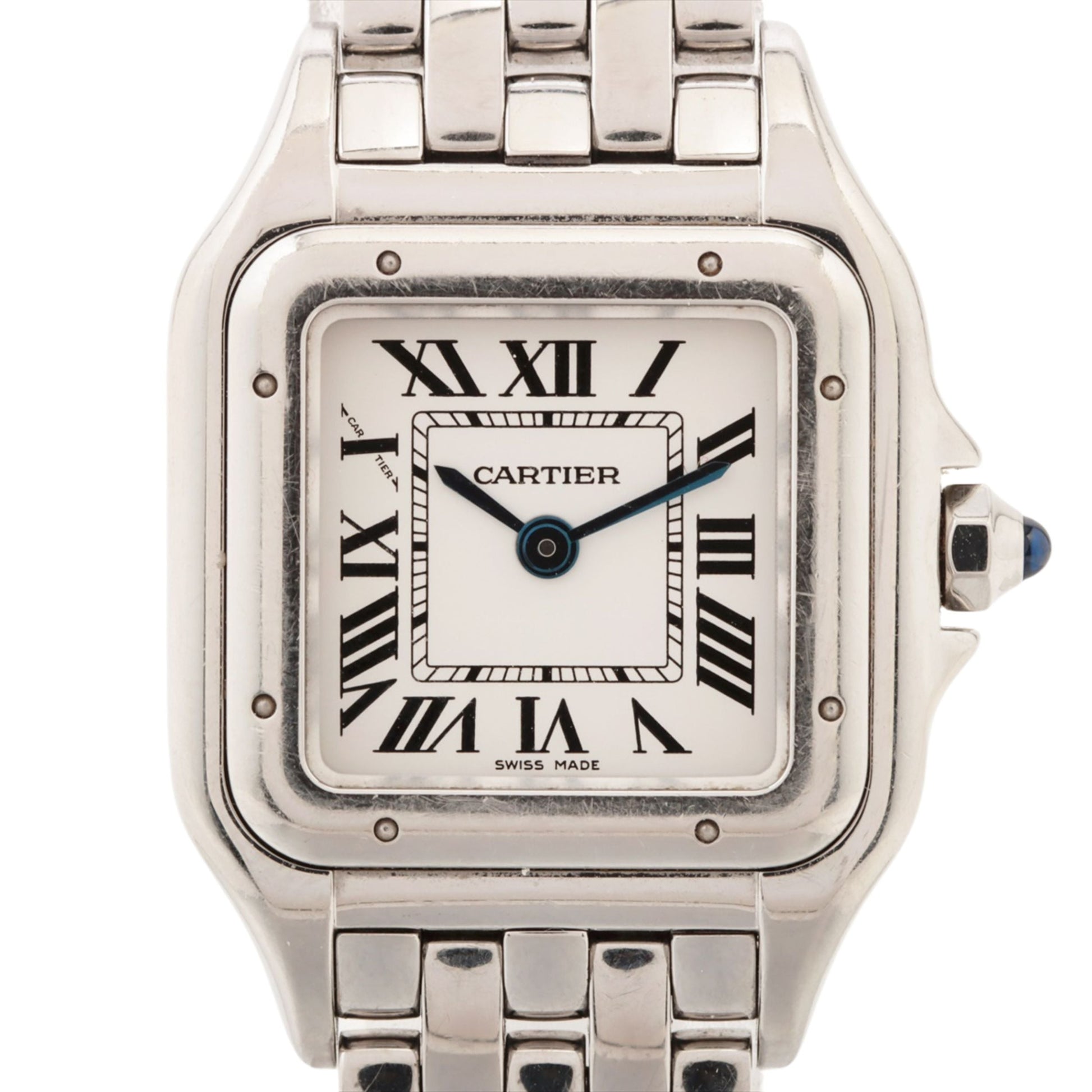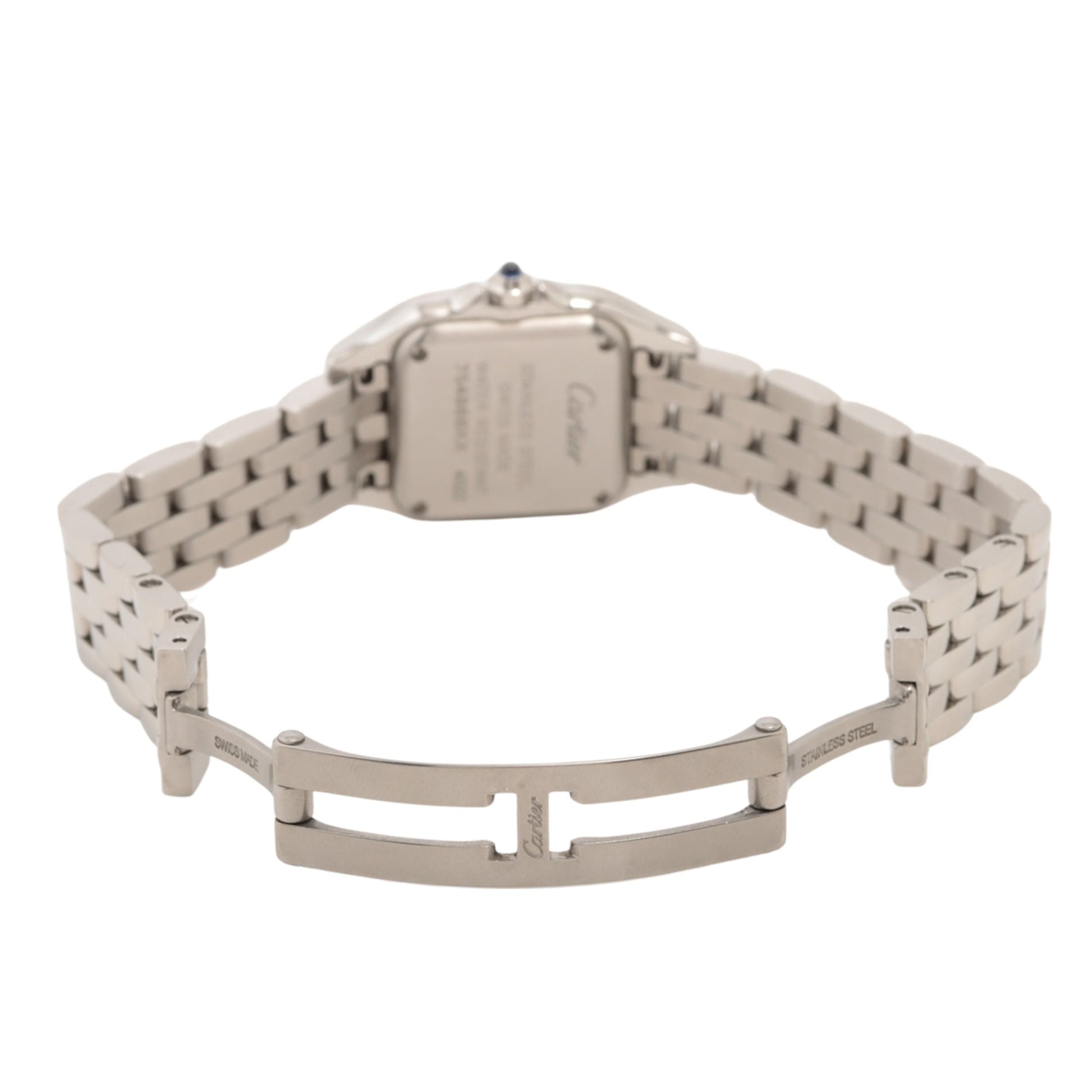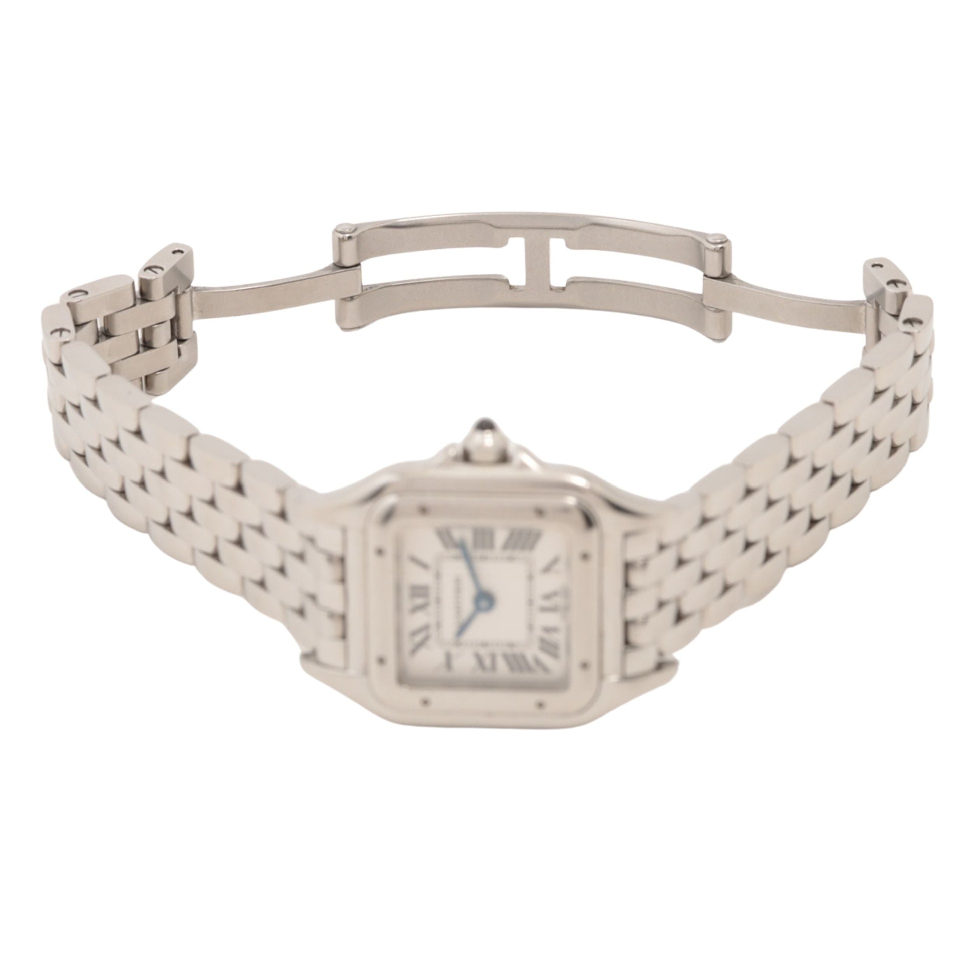 Cette Panthère a un boîtier et un bracelet en acier inoxydable. Lunette fixe en acier inoxydable. Cadran argent avec aiguilles bleues et index des heures en chiffres romains. Mouvement à quartz. Verre saphir anti-rayures. Ref. WSPN0006