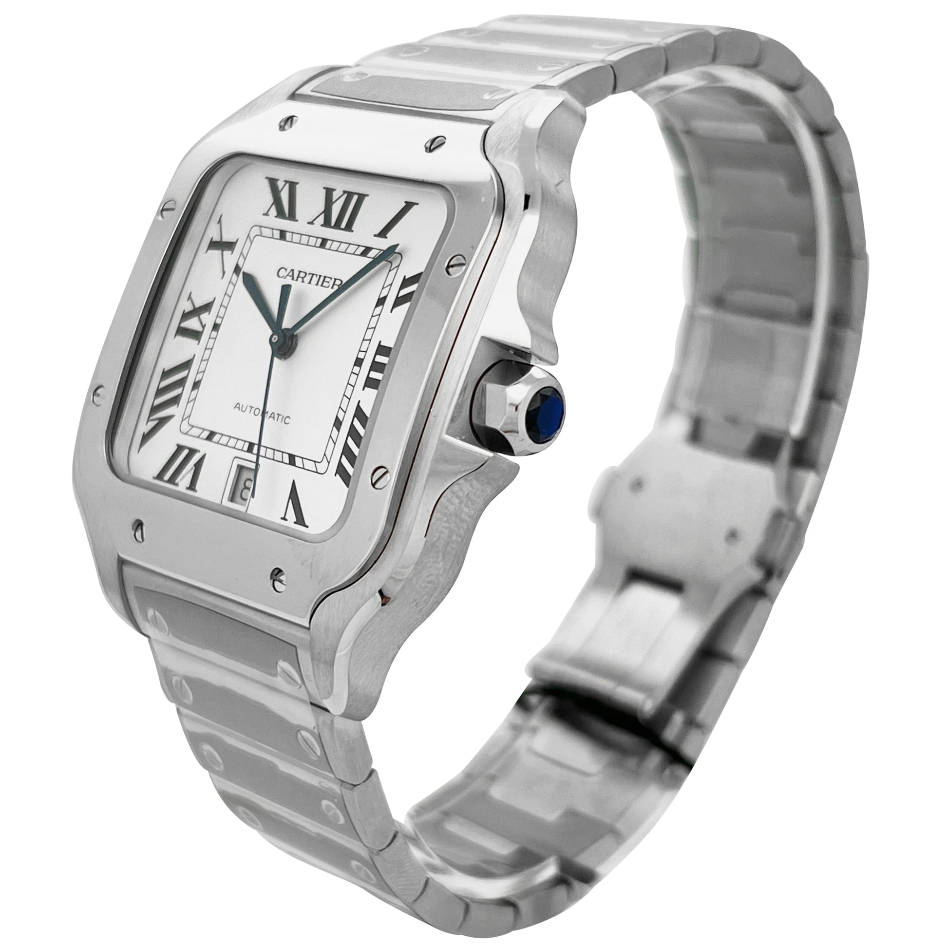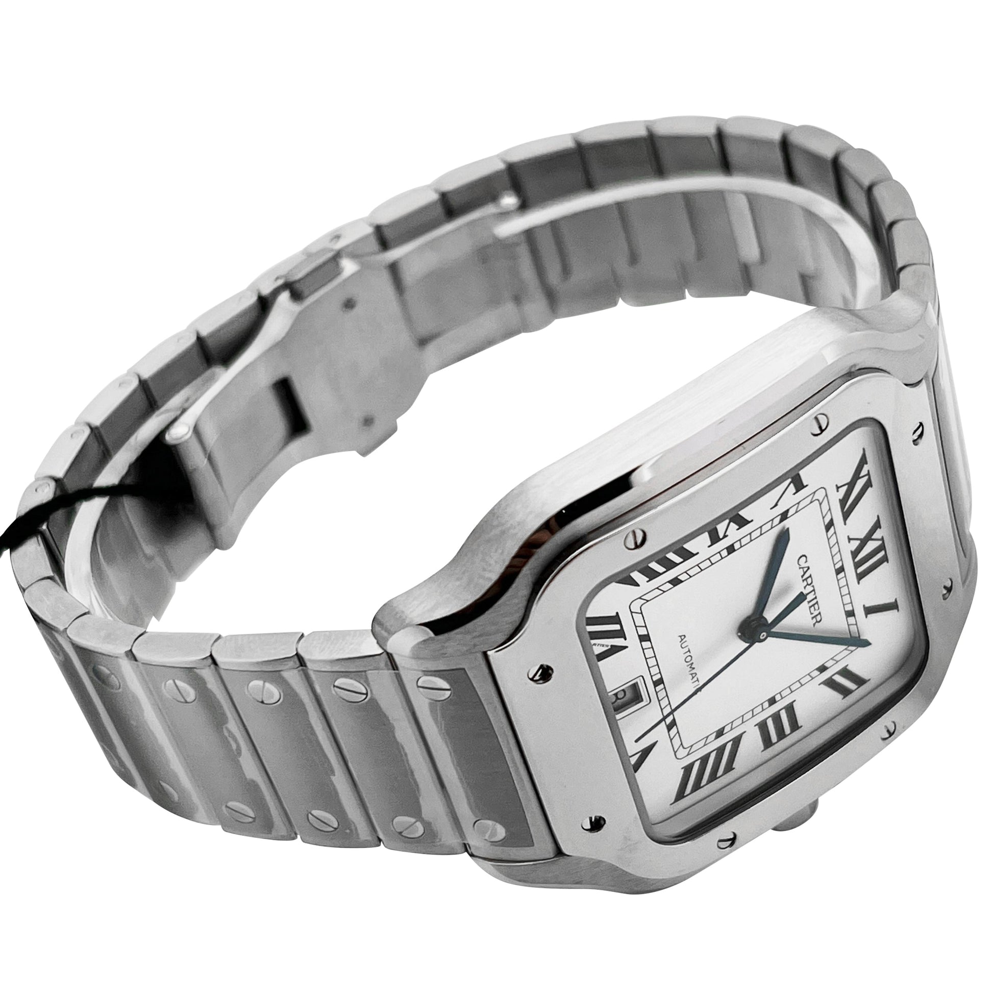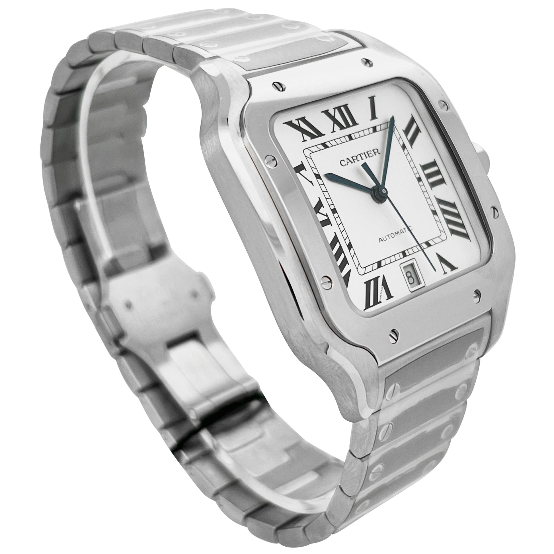 Santos watch, large model, mechanical movement with automatic winding, calibre 1847 MC. Steel case, 7-sided crown set with a faceted synthetic spinel, silvered opaline dial, steel sword-shaped hands, sapphire crystal. Steel bracelet with “SmartLink” adjustment system. Second bracelet in calfskin, with interchangeable steel folding buckle. Both bracelets are fitted with the “QuickSwitch” interchangeability system. Case width: 39.8 mm, thickness: 9.08 mm. Water-resistant to 10 bar (approx. 100 metres). Ref. WSSA0018