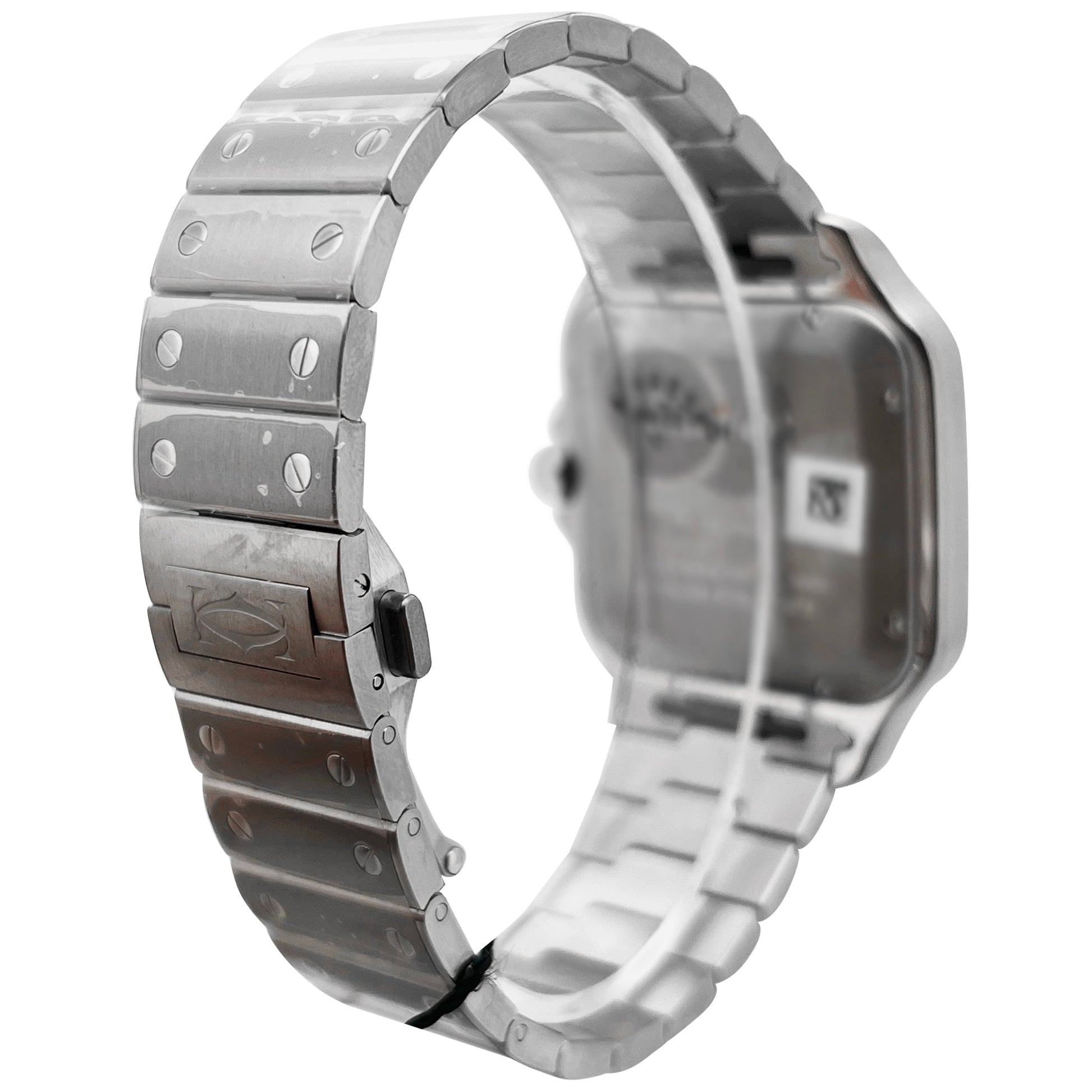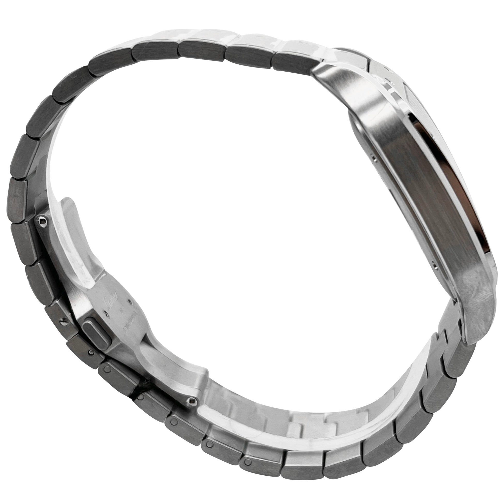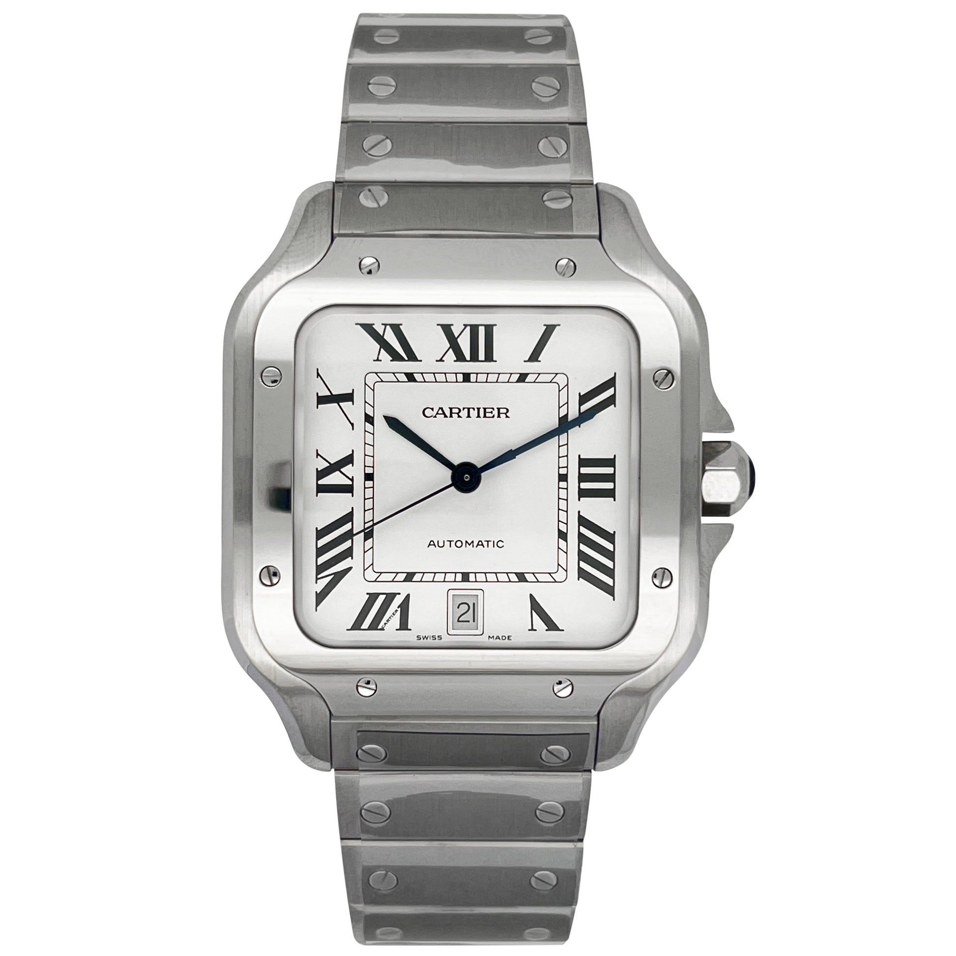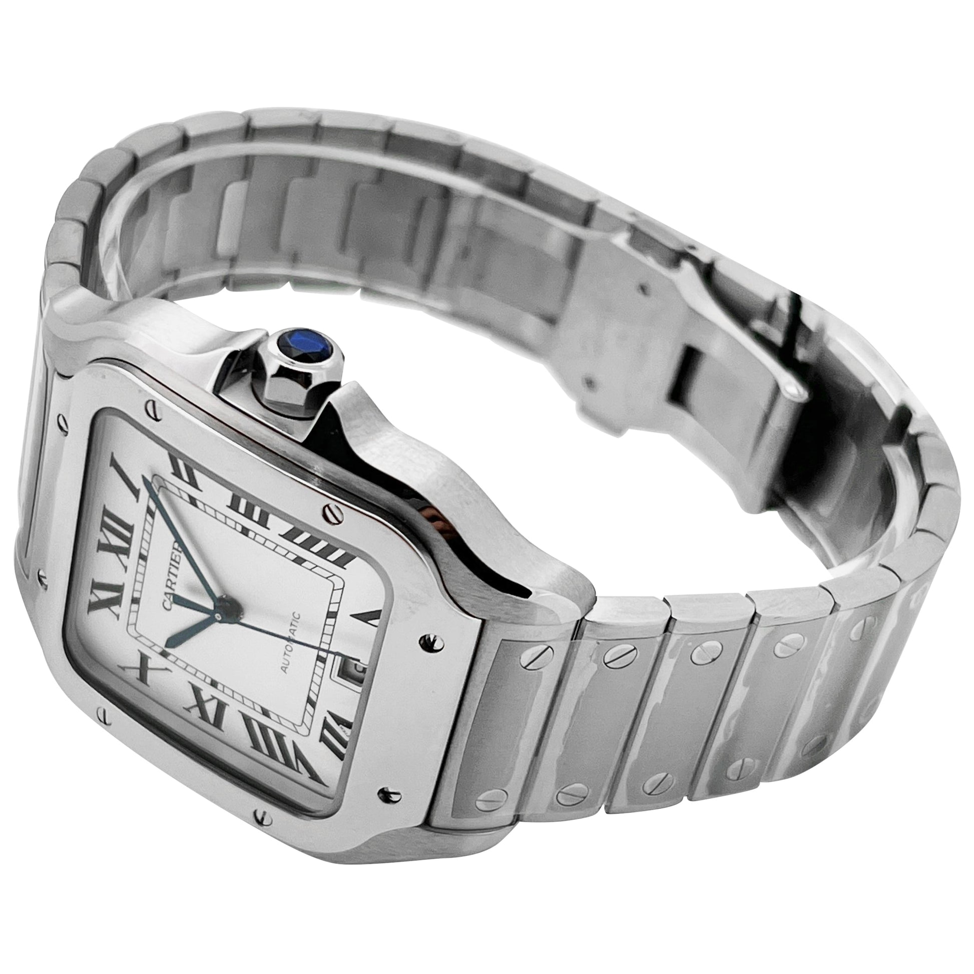 Santos watch, large model, mechanical movement with automatic winding, calibre 1847 MC. Steel case, 7-sided crown set with a faceted synthetic spinel, silvered opaline dial, steel sword-shaped hands, sapphire crystal. Steel bracelet with “SmartLink” adjustment system. Second bracelet in calfskin, with interchangeable steel folding buckle. Both bracelets are fitted with the “QuickSwitch” interchangeability system. Case width: 39.8 mm, thickness: 9.08 mm. Water-resistant to 10 bar (approx. 100 metres). Ref. WSSA0018